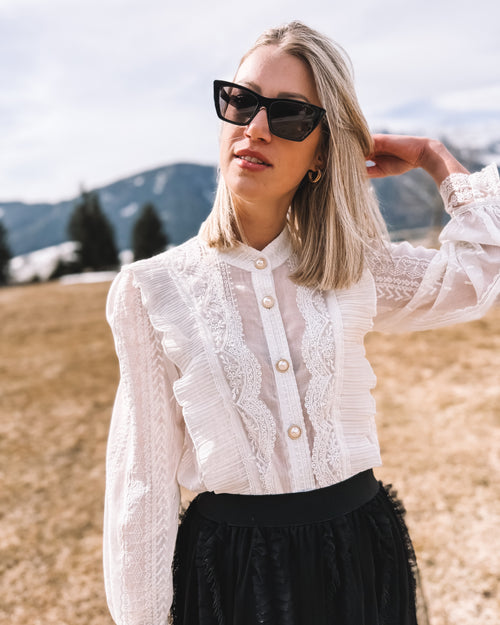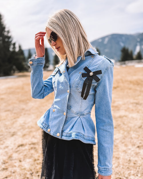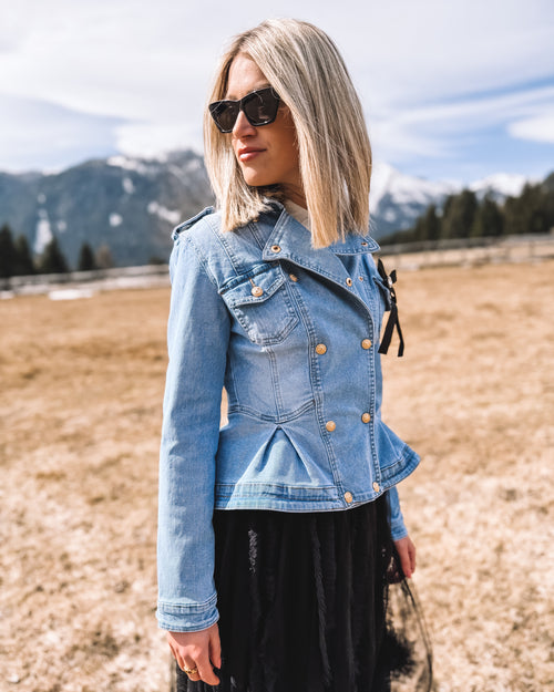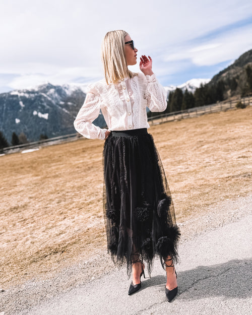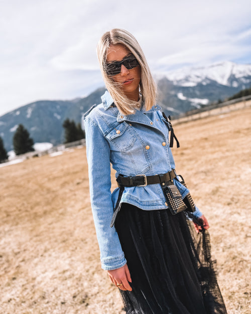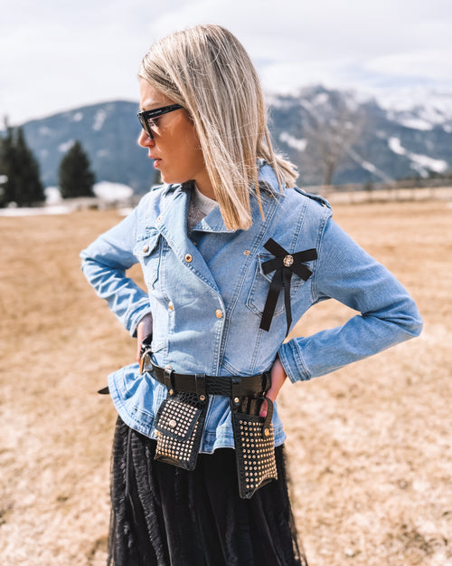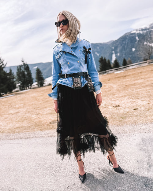 Ein Look, der Gegensätze harmonisch vereint: Die Denim Queen Jeansjacke bringt mit ihrem femininen Schnitt und dem verspielten Schößchen eine moderne Note in den klassischen Denim-Stil. Darunter sorgt die Sweet Barock Bluse mit filigraner Spitze und zarten Rüschen für einen Hauch von Nostalgie und Eleganz. Der Black Rose Tüllrock in tiefem Schwarz, verziert mit feinen Tüll-Rosen, verleiht dem Outfit eine sinnliche, verspielte Komponente. Abgerundet wird der Look durch die Black Lights Gürteltasche in schwarzer Lederoptik mit goldenen Nieten, die Funktionalität mit einem rockigen, luxuriösen Akzent verbindet. Ein Ensemble, das Stärke und Romantik stilvoll kombiniert. ✨🖤