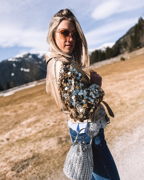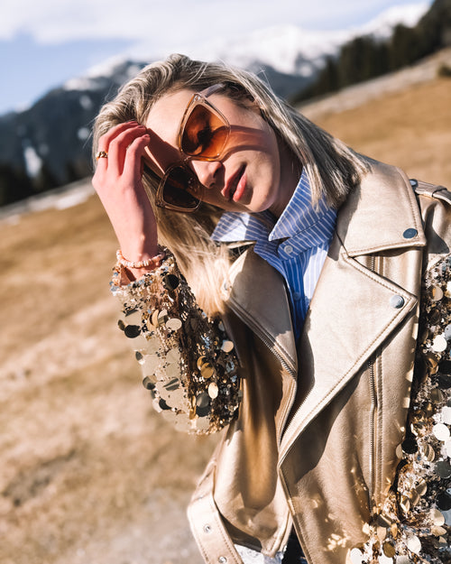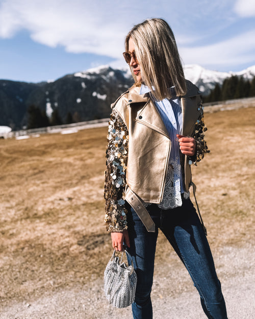 Glanz ohne Kompromisse: DieGolden GlimmerJacke zieht alle Blicke auf sich – mit goldenen Pailletten und starkem Schnitt. Dazu dieDenim LoveJeans mit funkelndem Strass-Detail am Saum – lässig, aber mit Anspruch. Ein Look, der Selbstbewusstsein sichtbar macht. ✨🖤