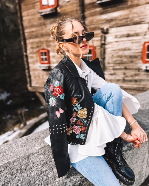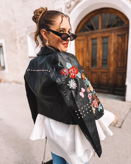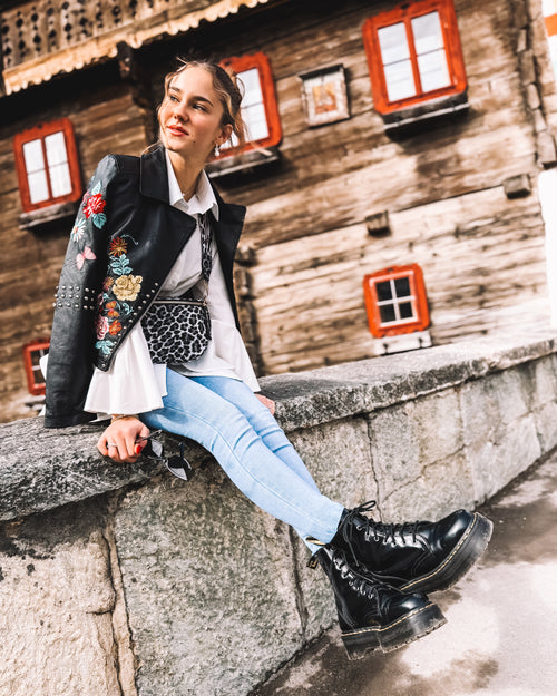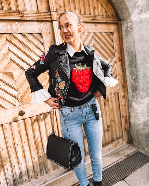 Ein Ensemble, das Stärke und Sinnlichkeit vereint: Die schwarze Lederjacke mit bunten Blumenstickereien setzt einen ausdrucksstarken Akzent. Darunter sorgt die fließende weiße Bluse für Leichtigkeit, während das schwarze Strick-Shirt mit funkelnder Erdbeer-Applikation einen verspielten Touch hinzufügt. Die hellblaue Slimfit-Jeans betont die Silhouette und bringt Frische in den Look. Abgerundet wird das Outfit durch die Gürteltasche im schwarz-weißen Leo-Print und den schwarzen Gürtel mit goldener Schnalle, die beide für einen Hauch von Extravaganz sorgen. Ein Stil, der Kontraste harmonisch verbindet und Individualität ausstrahlt.