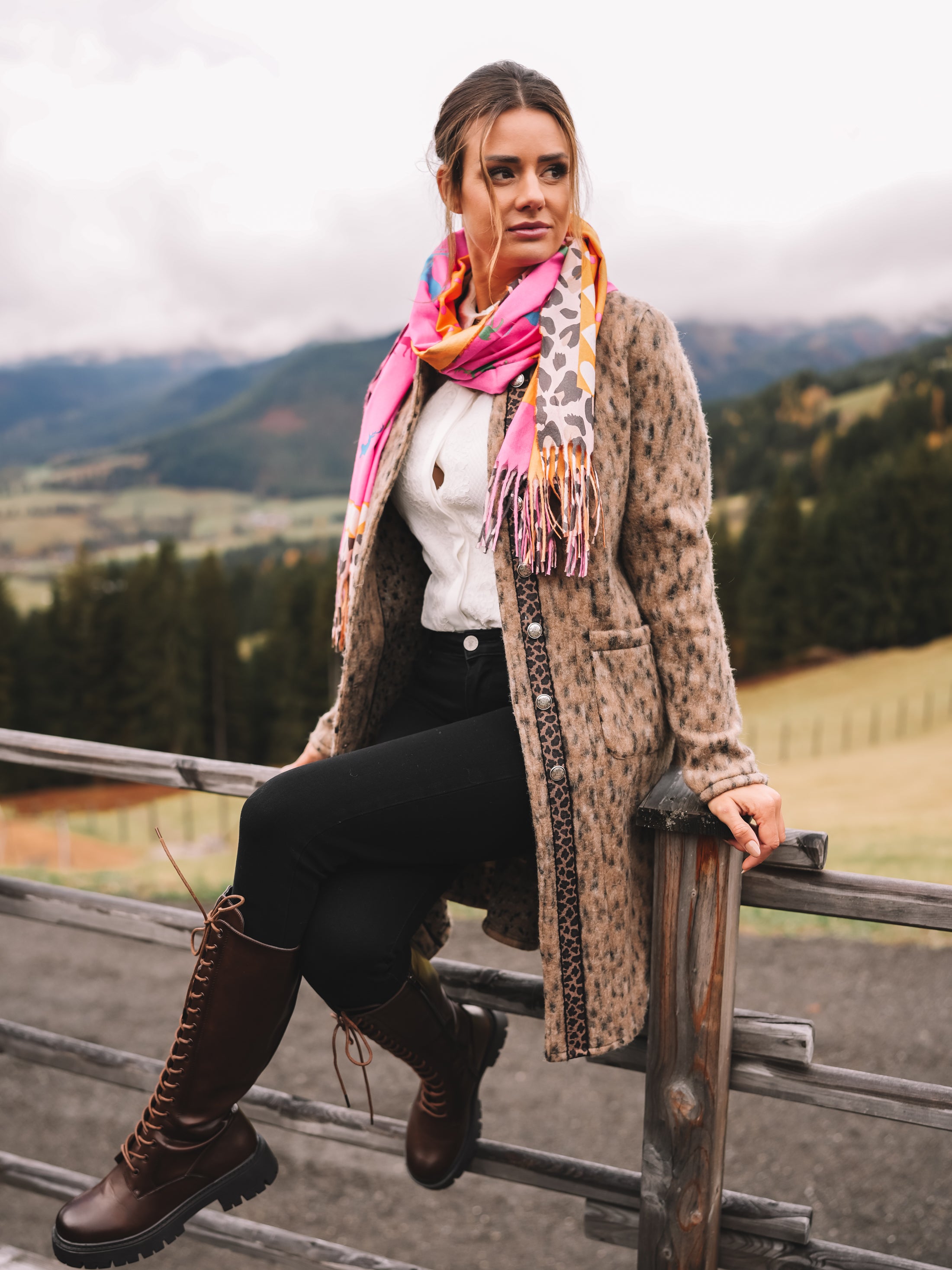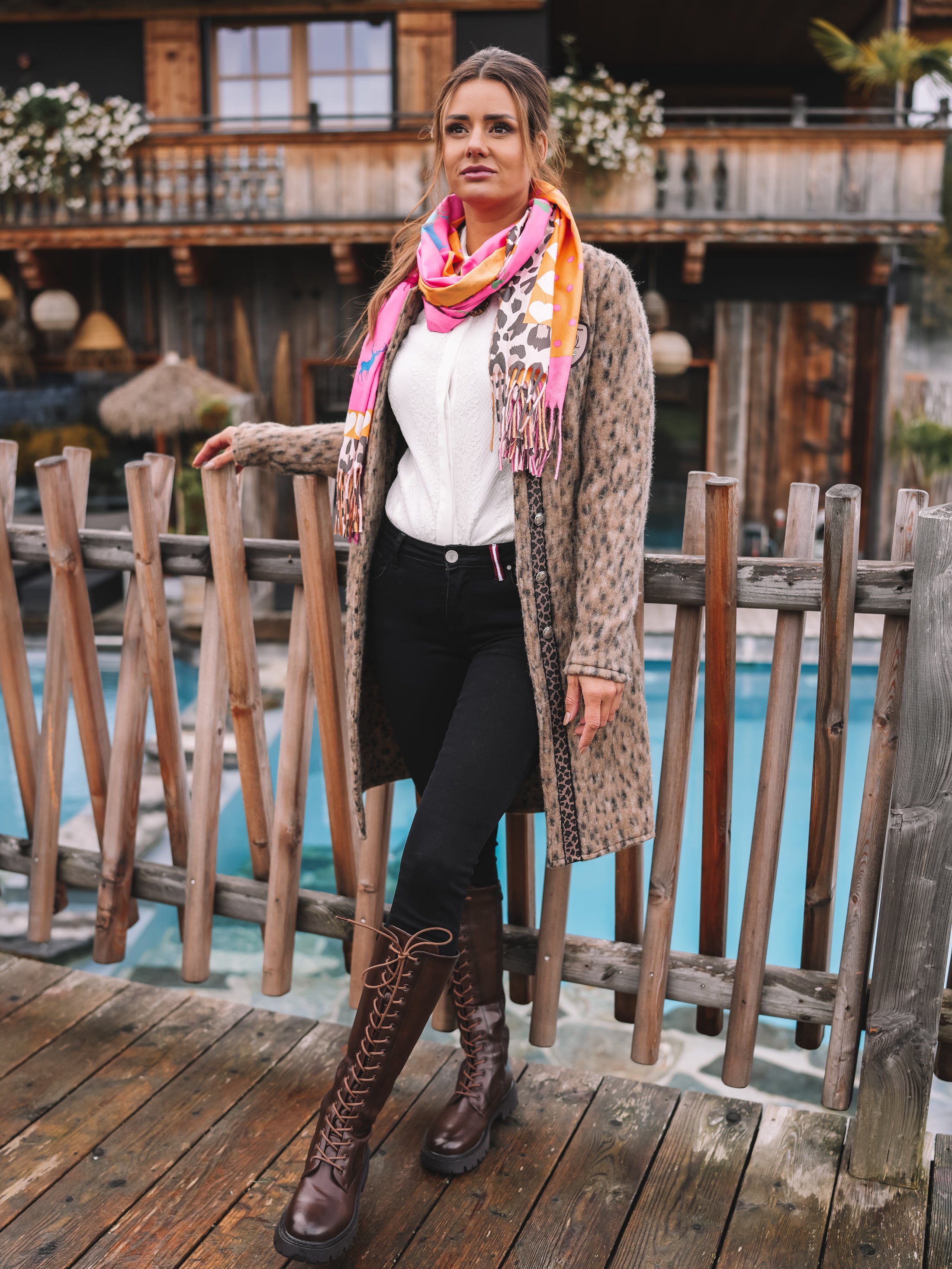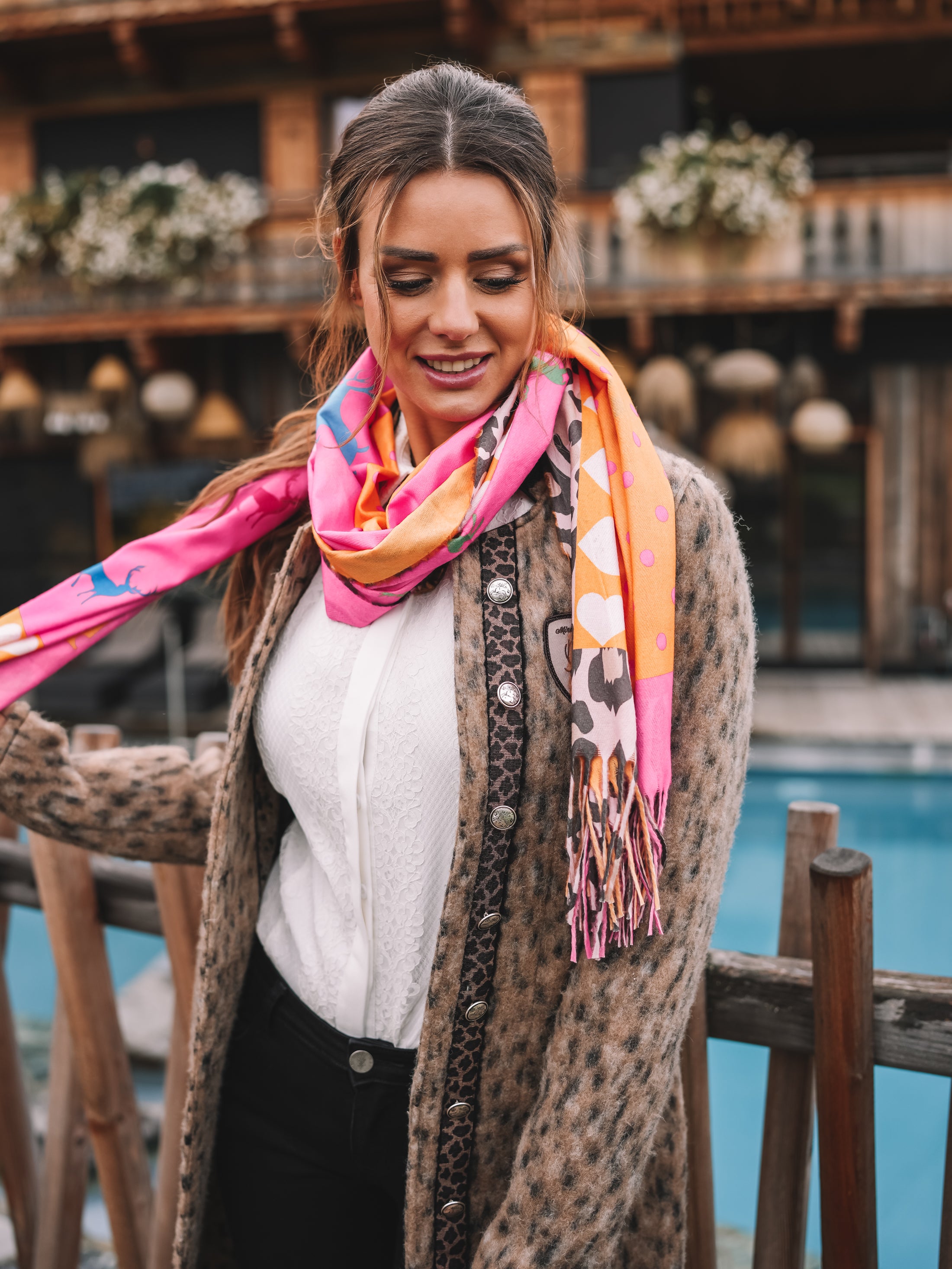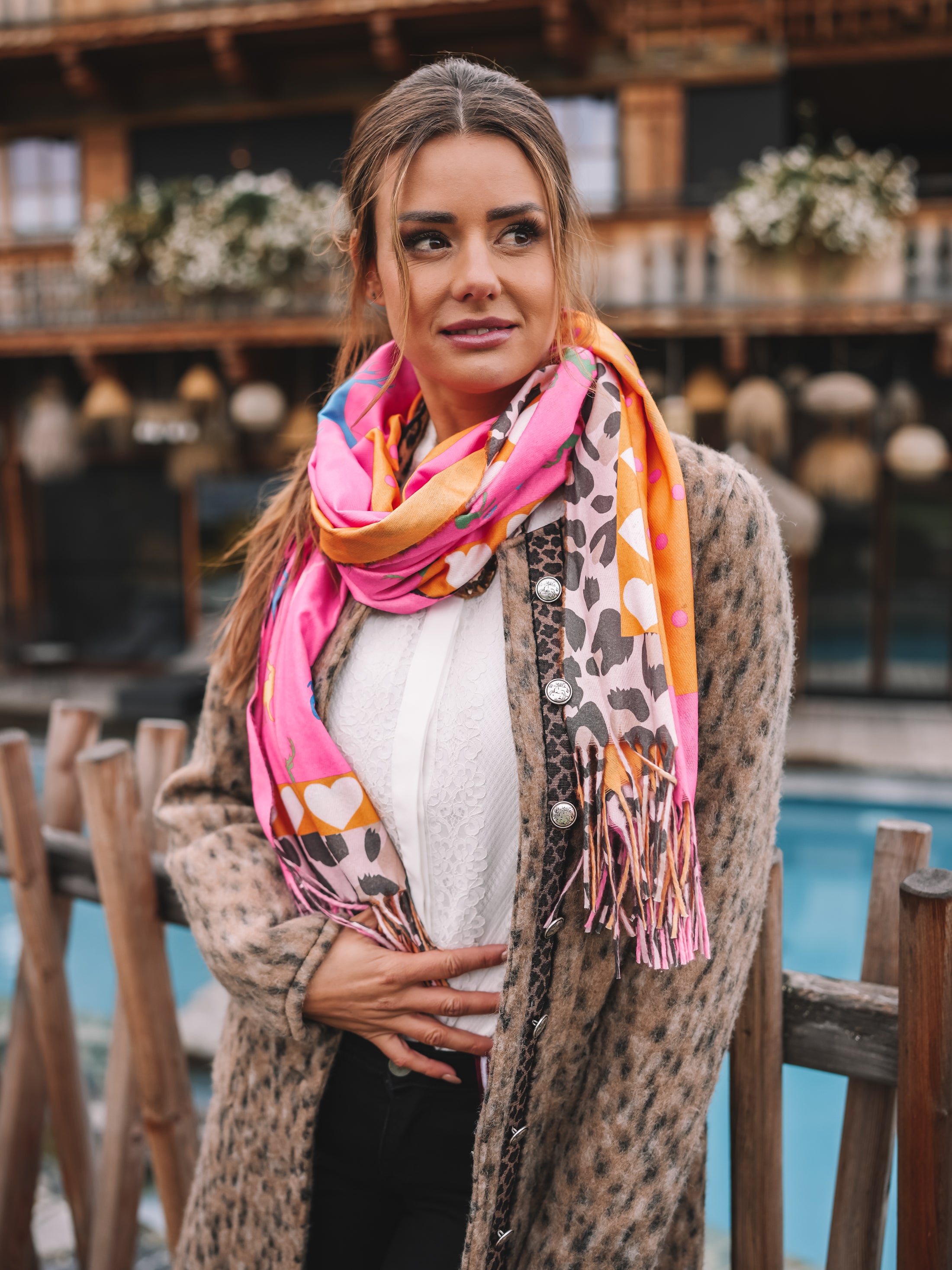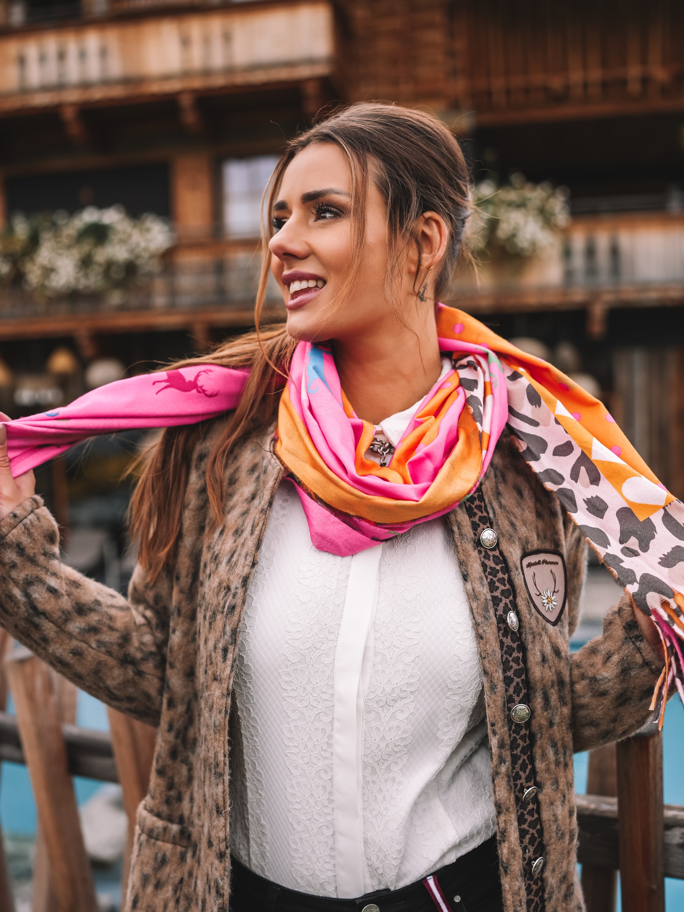 Dieses Tuch bringt Farbe und Lebensfreude in jeden Look. Die Kombination aus kräftigem Pink, leuchtendem Orange und dezenten Leo-Elementen verleiht ihm eine einzigartige Ausstrahlung – mutig, elegant und voller Energie.