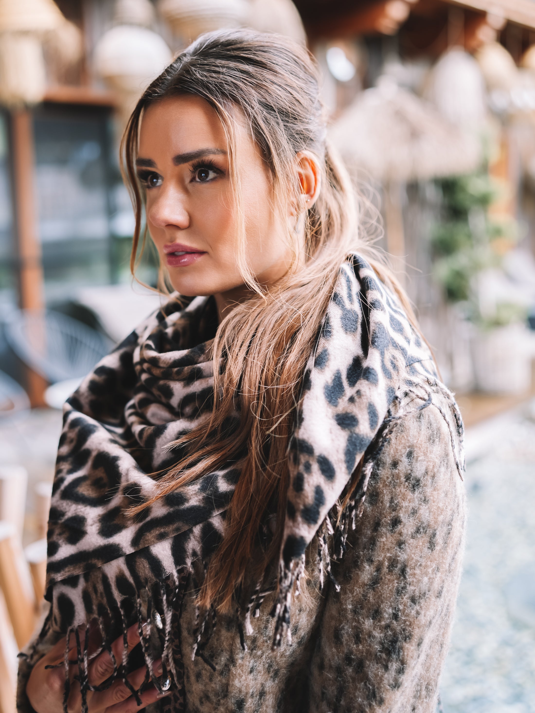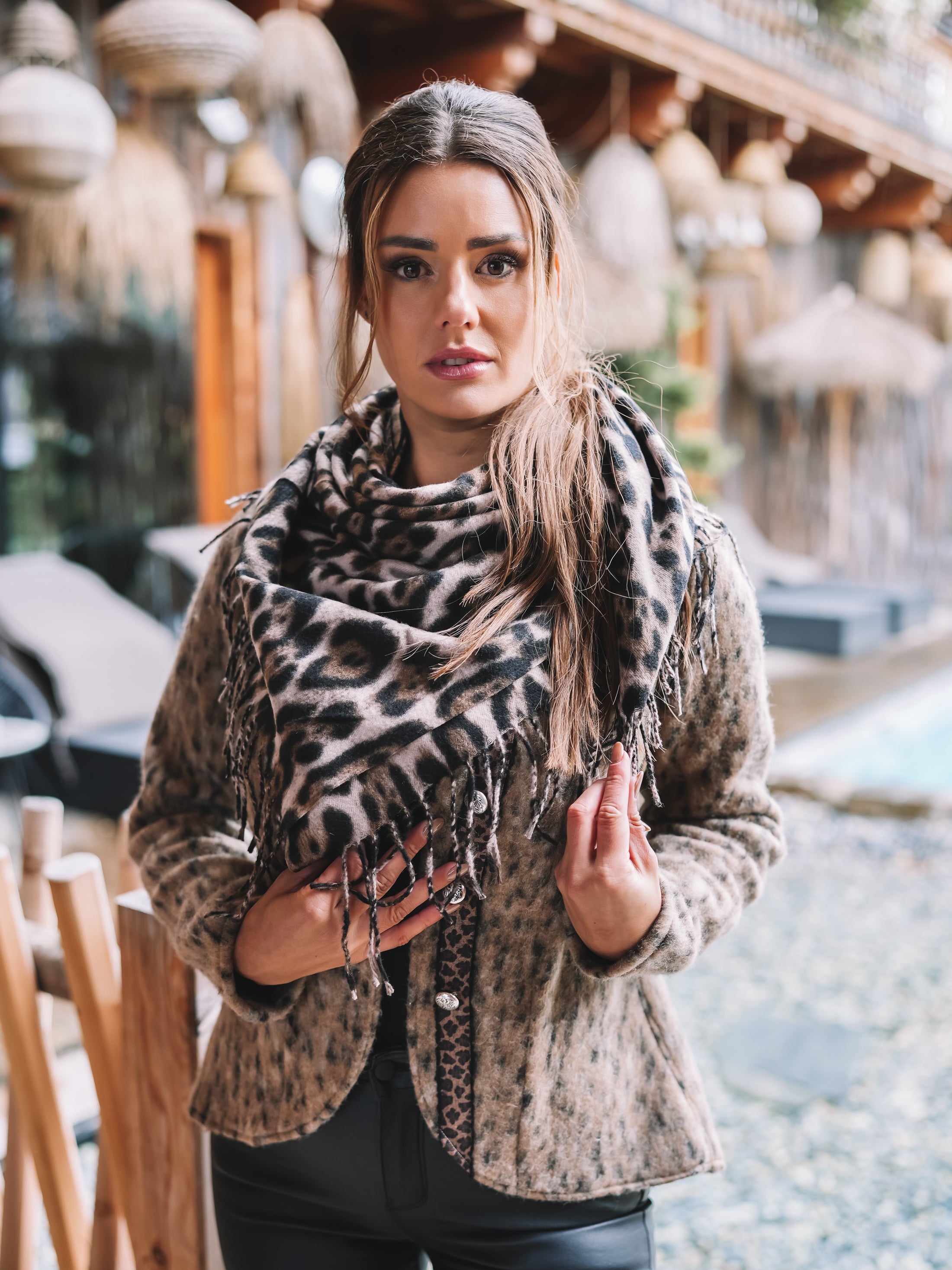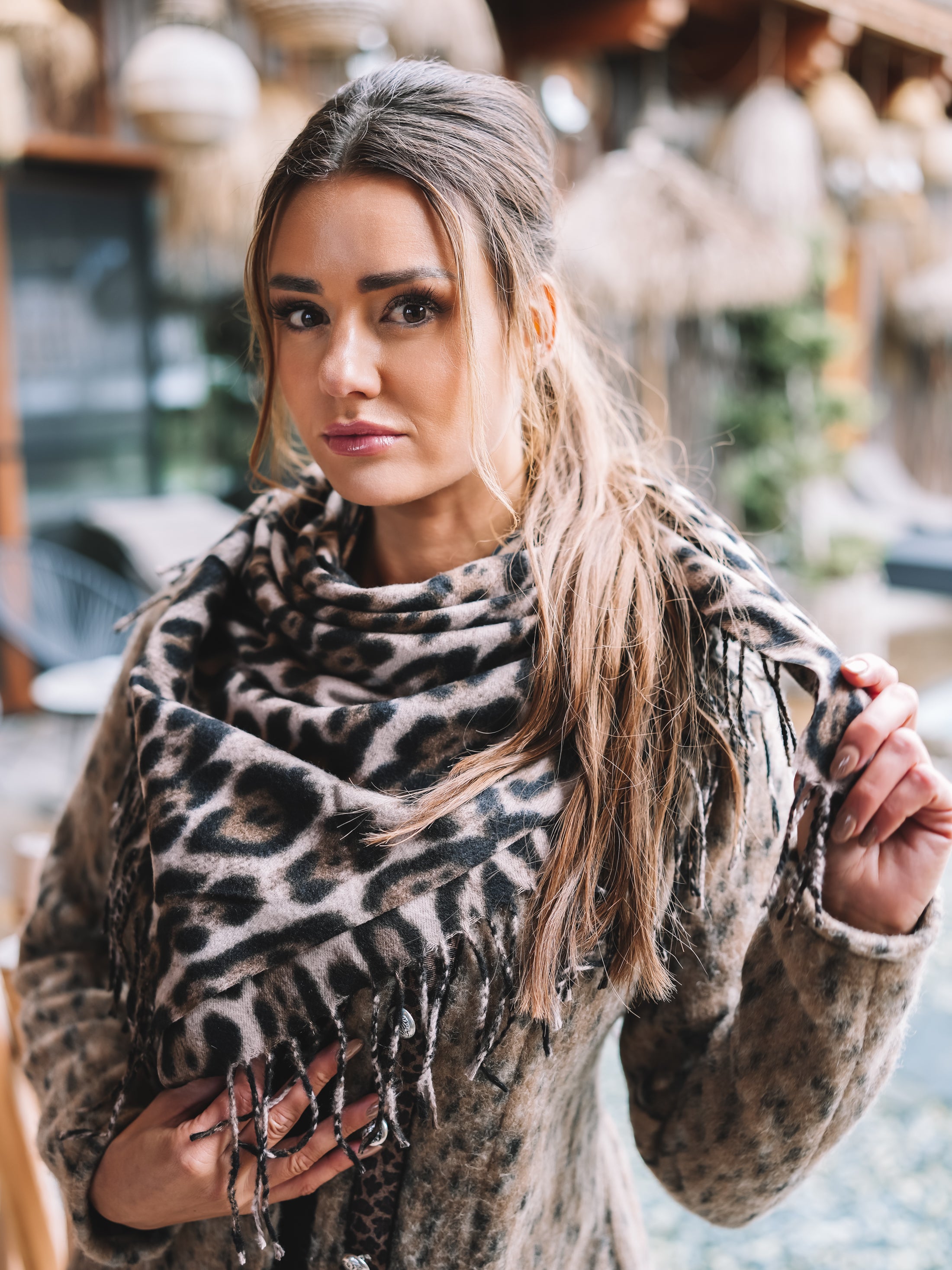 Die zarten Fransen an den Kanten unterstreichen die legere Eleganz des Designs und verleihen dem Schal Bewegung und Struktur. Ob locker über die Schultern gelegt oder mehrfach um den Hals gewickelt – Soft Panther setzt immer ein stilvolles Statement.