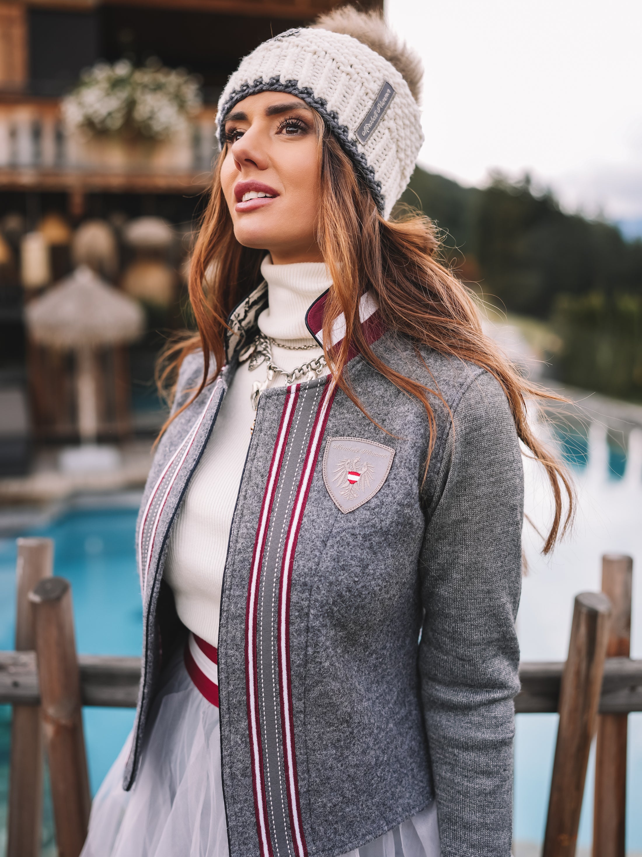 Aus hochwertigem Walkstoff gefertigt, mit Strickärmeln und einem charakteristischen Stehkragen in Rot-Weiß-Rot, vereint sie Stilbewusstsein und Heimatverbundenheit auf besonders charmante Weise.