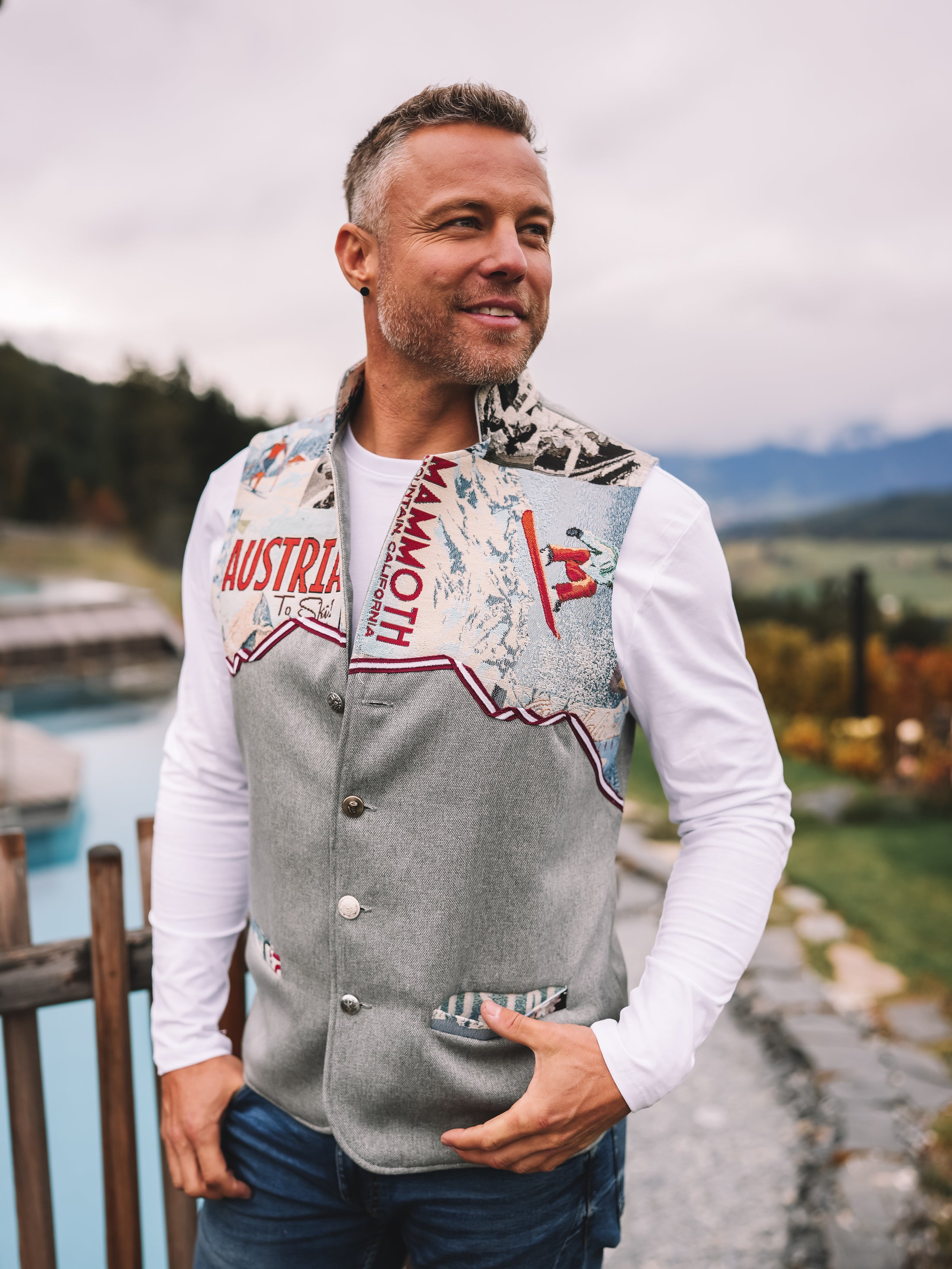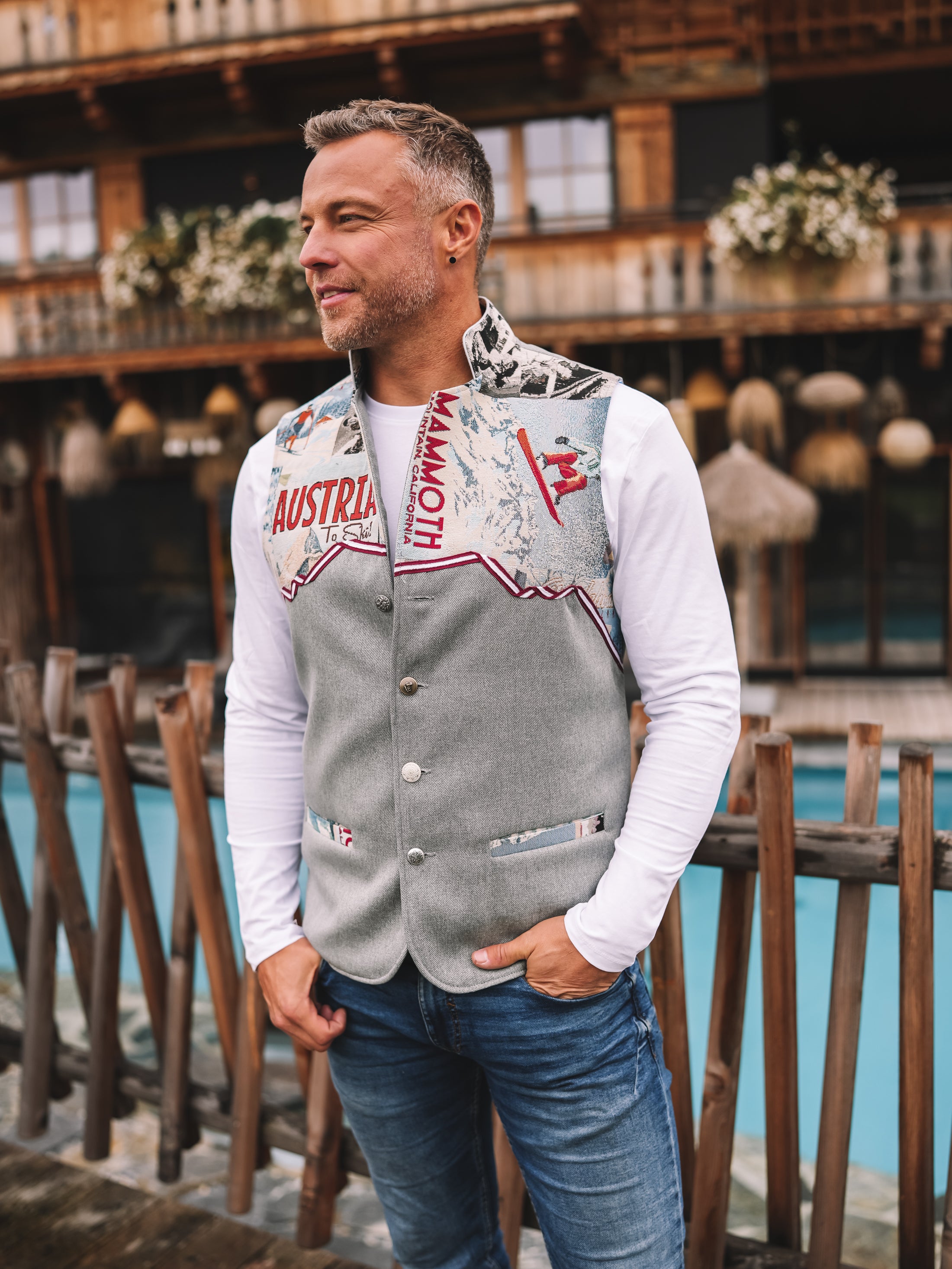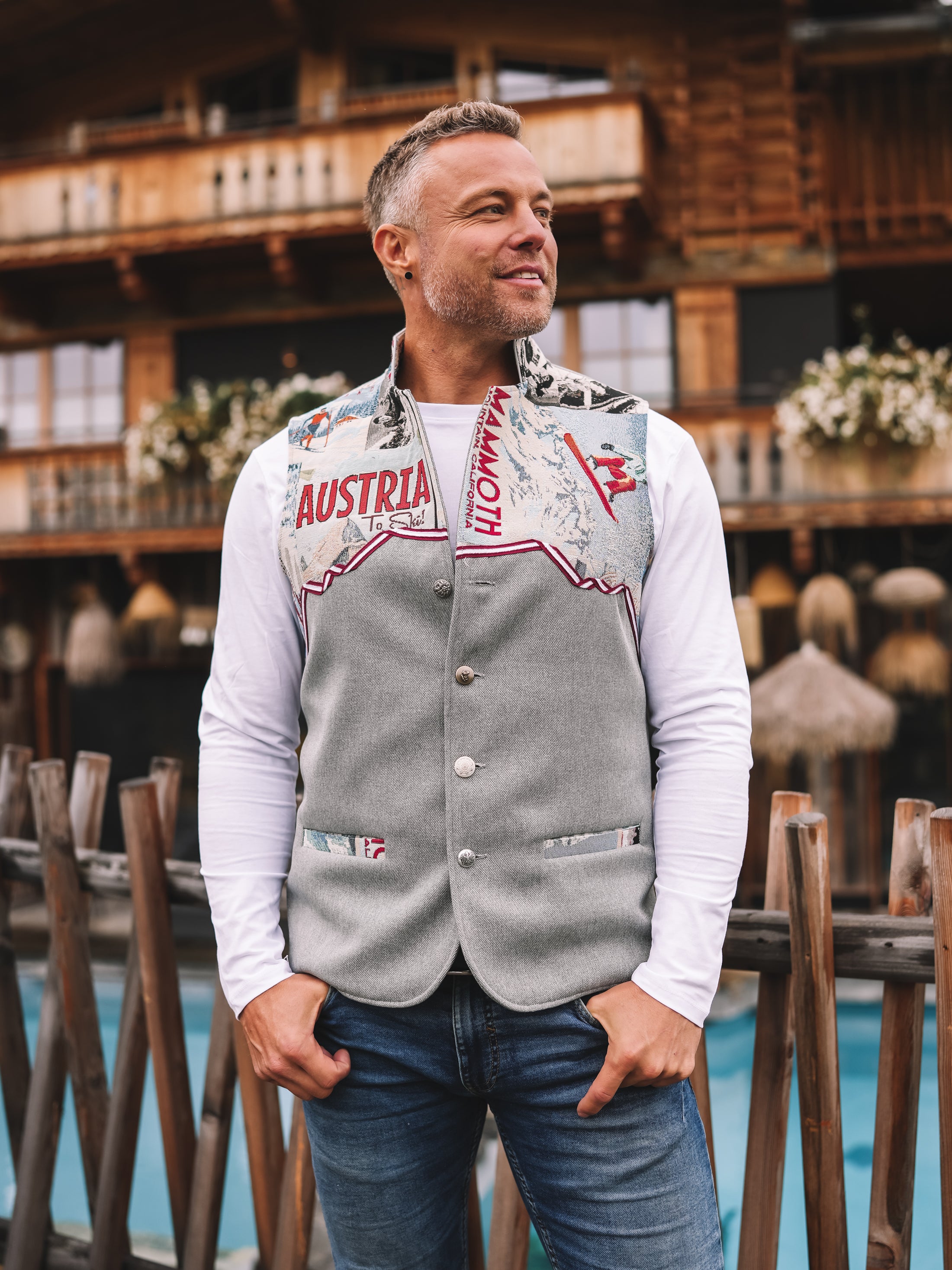 Das Gilet Alpine Heritage verkörpert alpinen Stil mit sportlicher Eleganz. Die Vorderseite zeigt ein charakterstarkes Design mit Ski- und Austria-Motiven – inspiriert von der klassischen Winterkultur der Alpen.