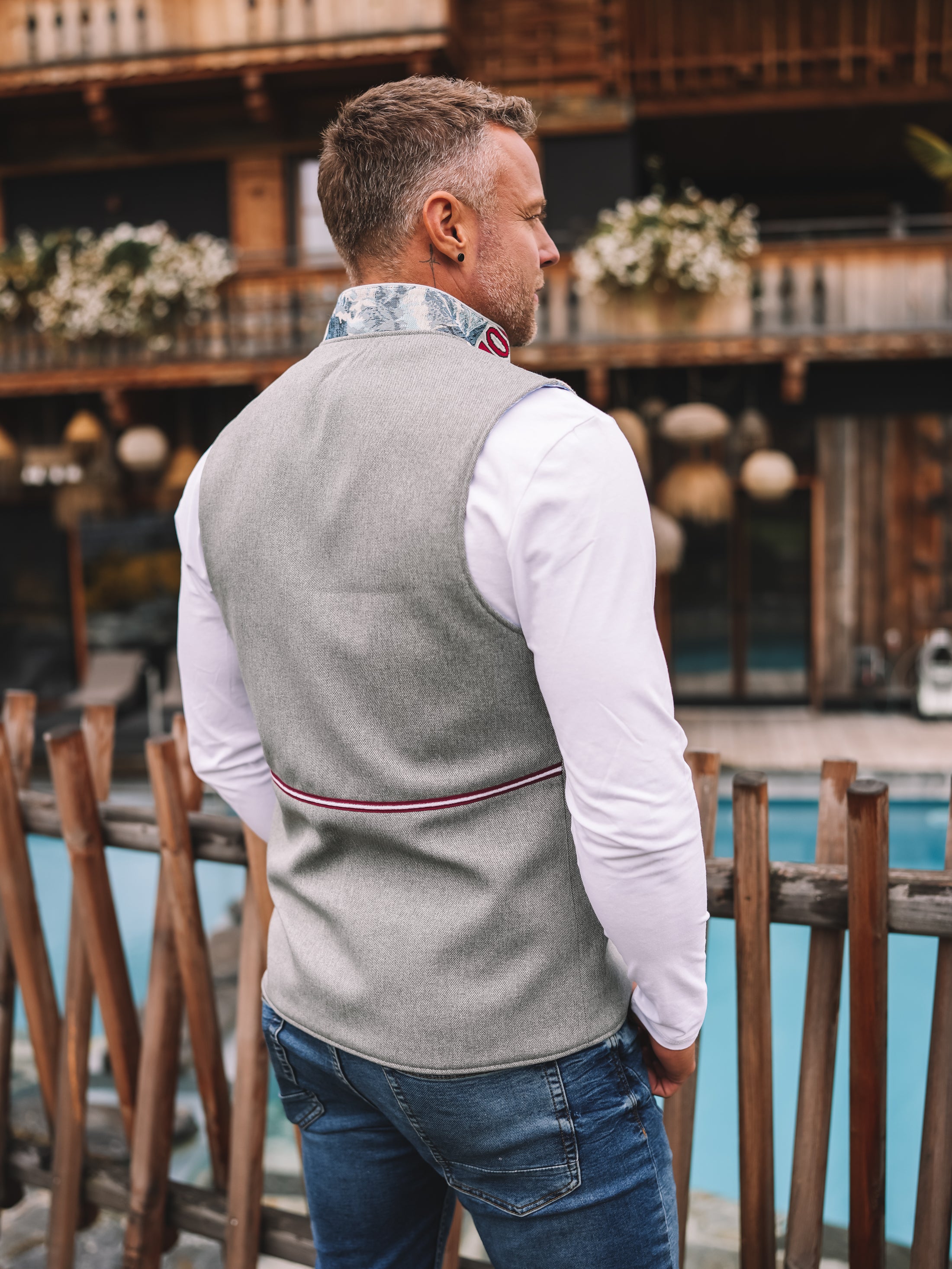 Gefertigt aus hochwertigem Stoff und mit viel Liebe zum Detail entsteht ein Look, der zugleich authentisch und zeitlos wirkt. Der Stehkragen verleiht dem Gilet eine markante Silhouette, während dezente Akzente den modernen Charakter unterstreichen.