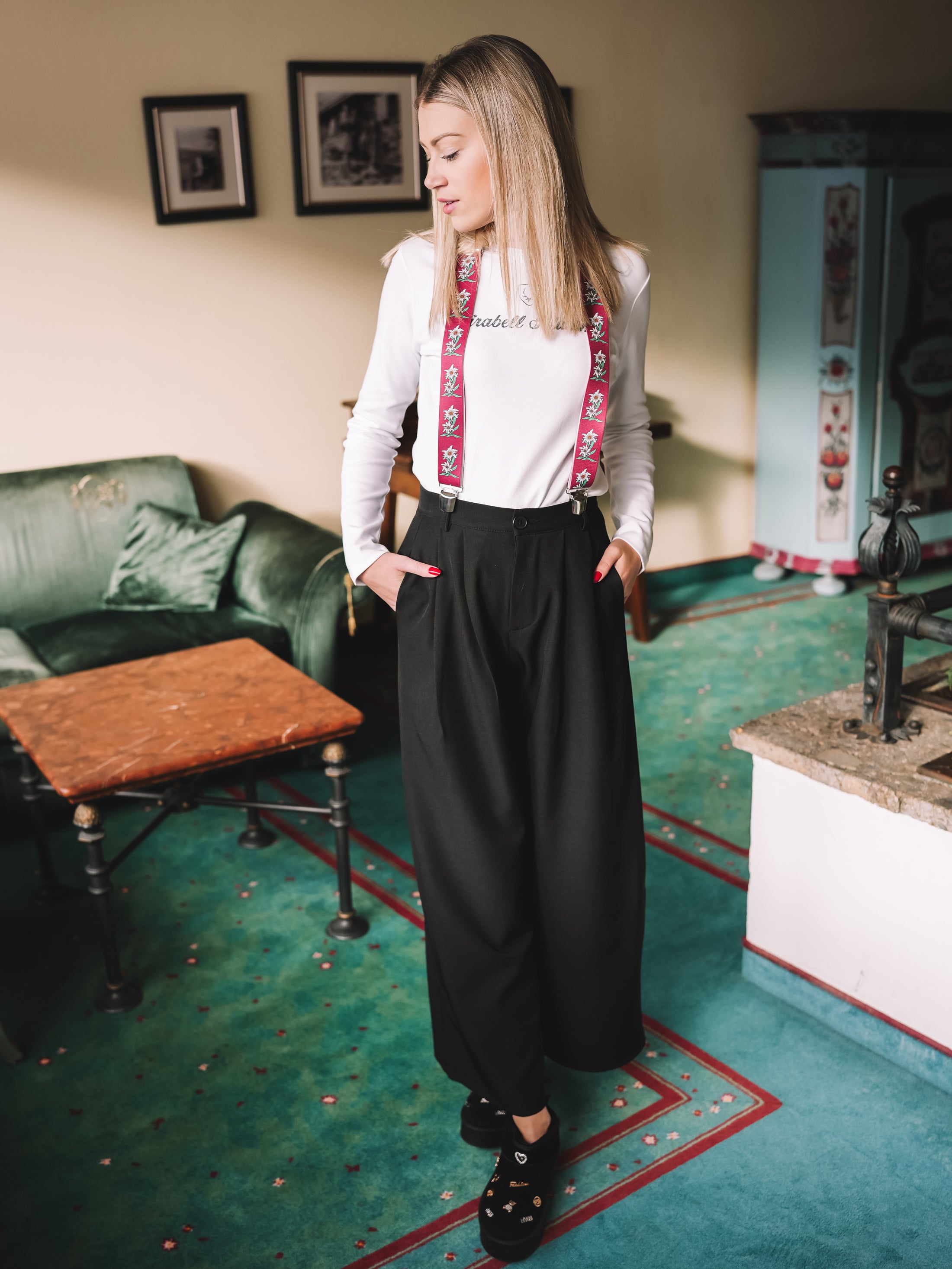 „Noir Flair“ verbindet weite Eleganz mit einer entspannten, fließenden Silhouette. Die Hose bewegt sich sanft bei jedem Schritt und schafft eine schöne Linienführung, die deinen Look mühelos veredelt. Das tiefe Schwarz wirkt edel und lässt sich vielseitig kombinieren – von cleanen Basics bis hin zu extravaganten Statement-Pieces.