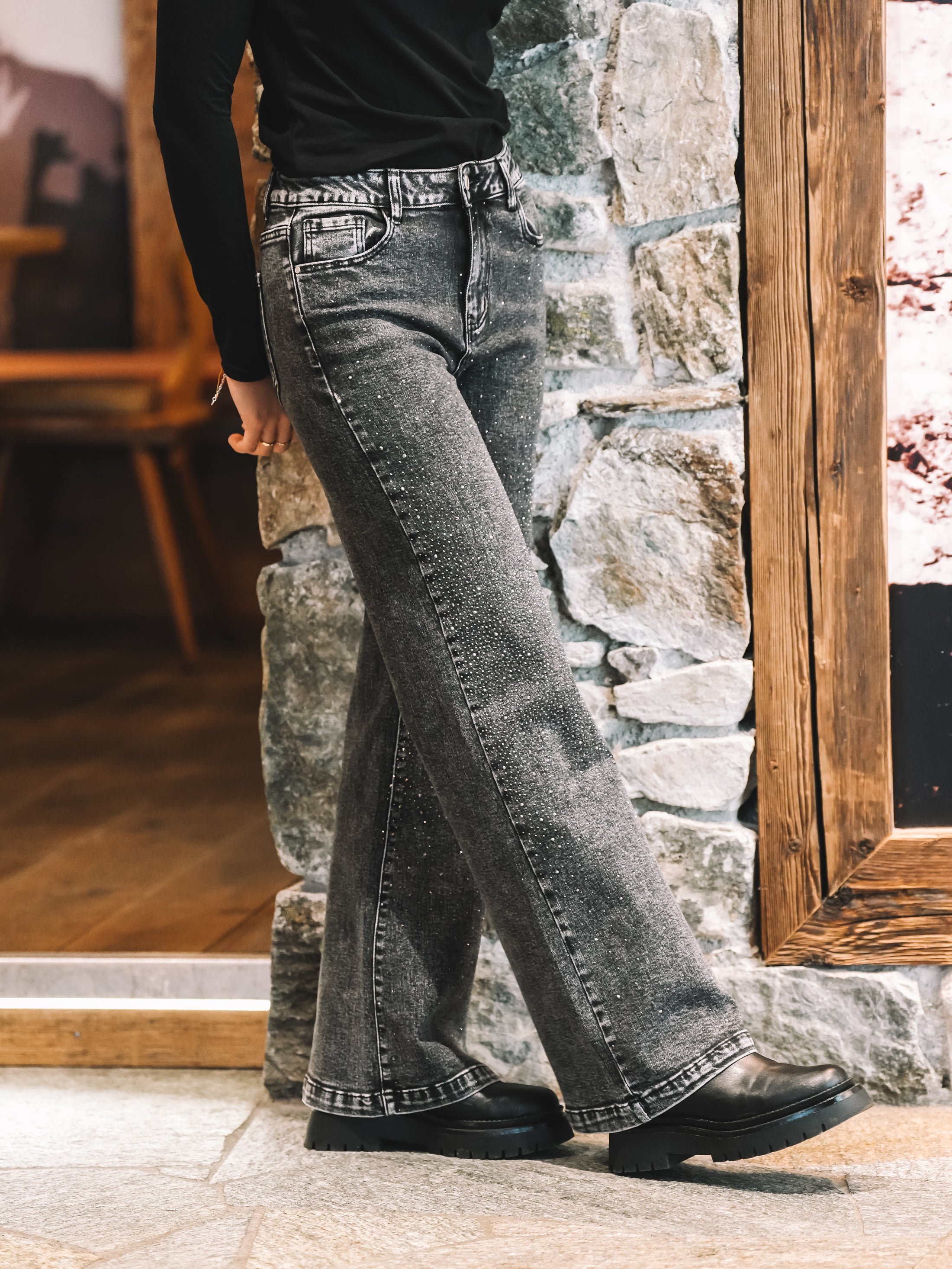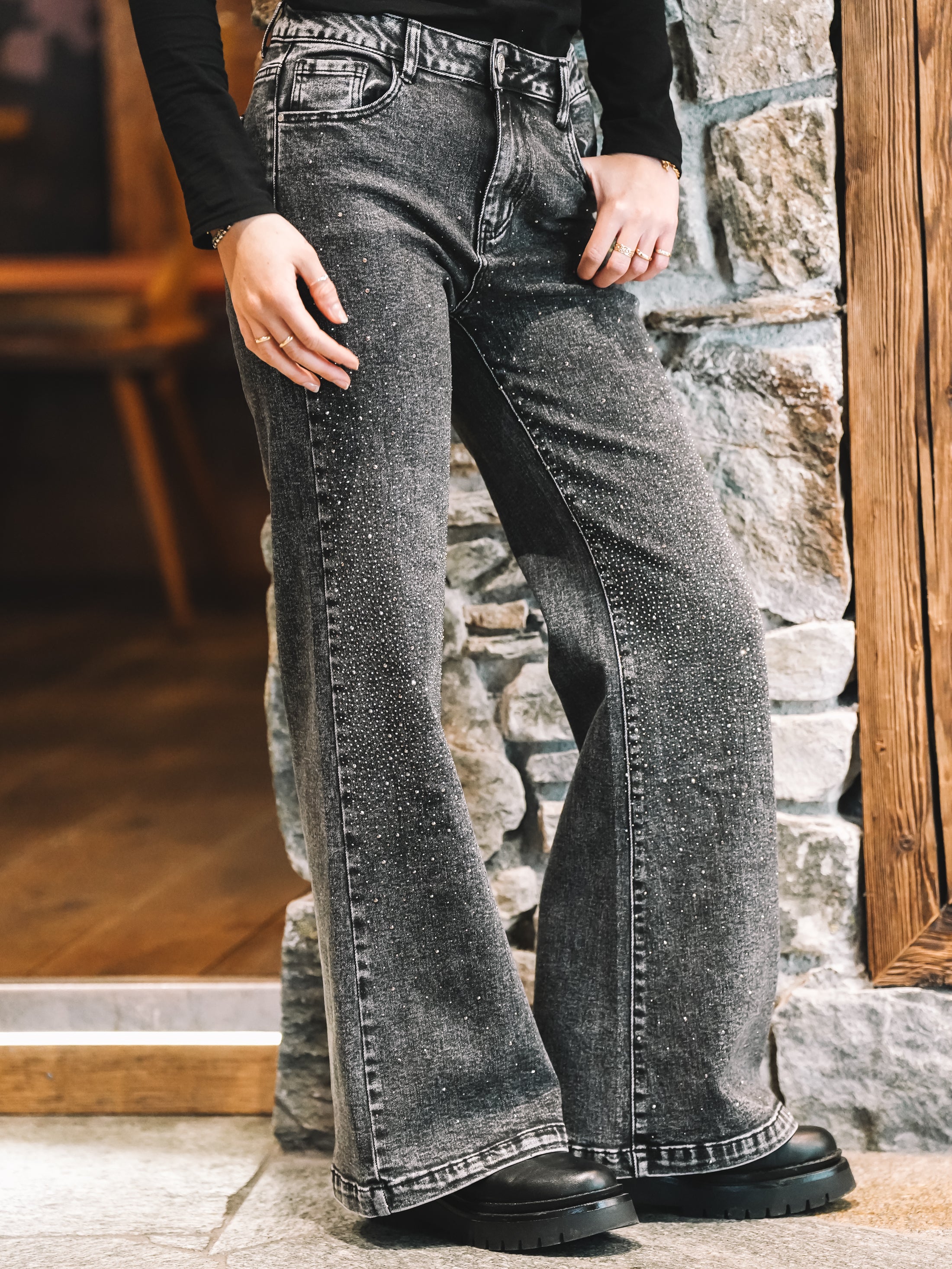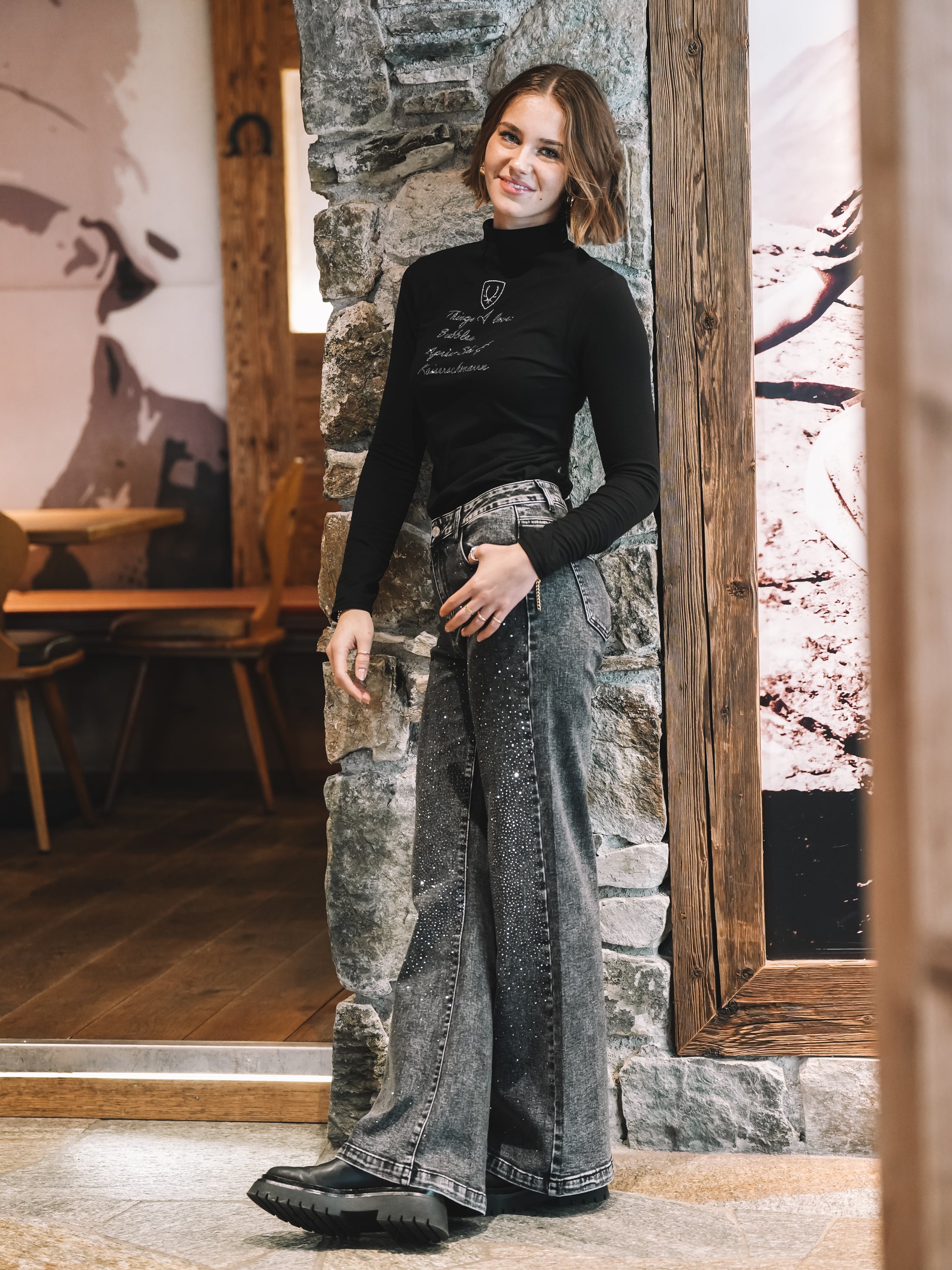 Der weite Beinverlauf schenkt der Silhouette Länge und diese mühelose Coolness, die sofort nach Fashion-Statement aussieht – ganz ohne „zu viel“. Ob mit schwarzem Shirt und Boots, mit Spitze für den Abend oder mit Hoodie für den Alpine-Lifestyle-Vibe: Stardust Denim macht jeden Look besonders.