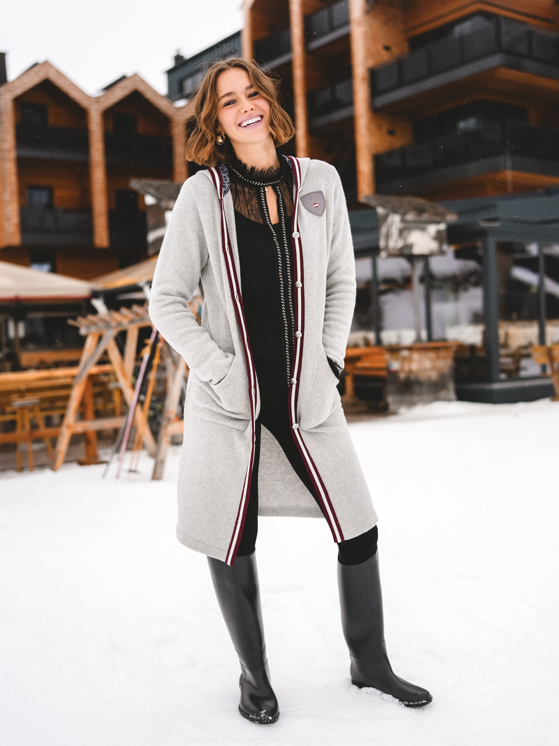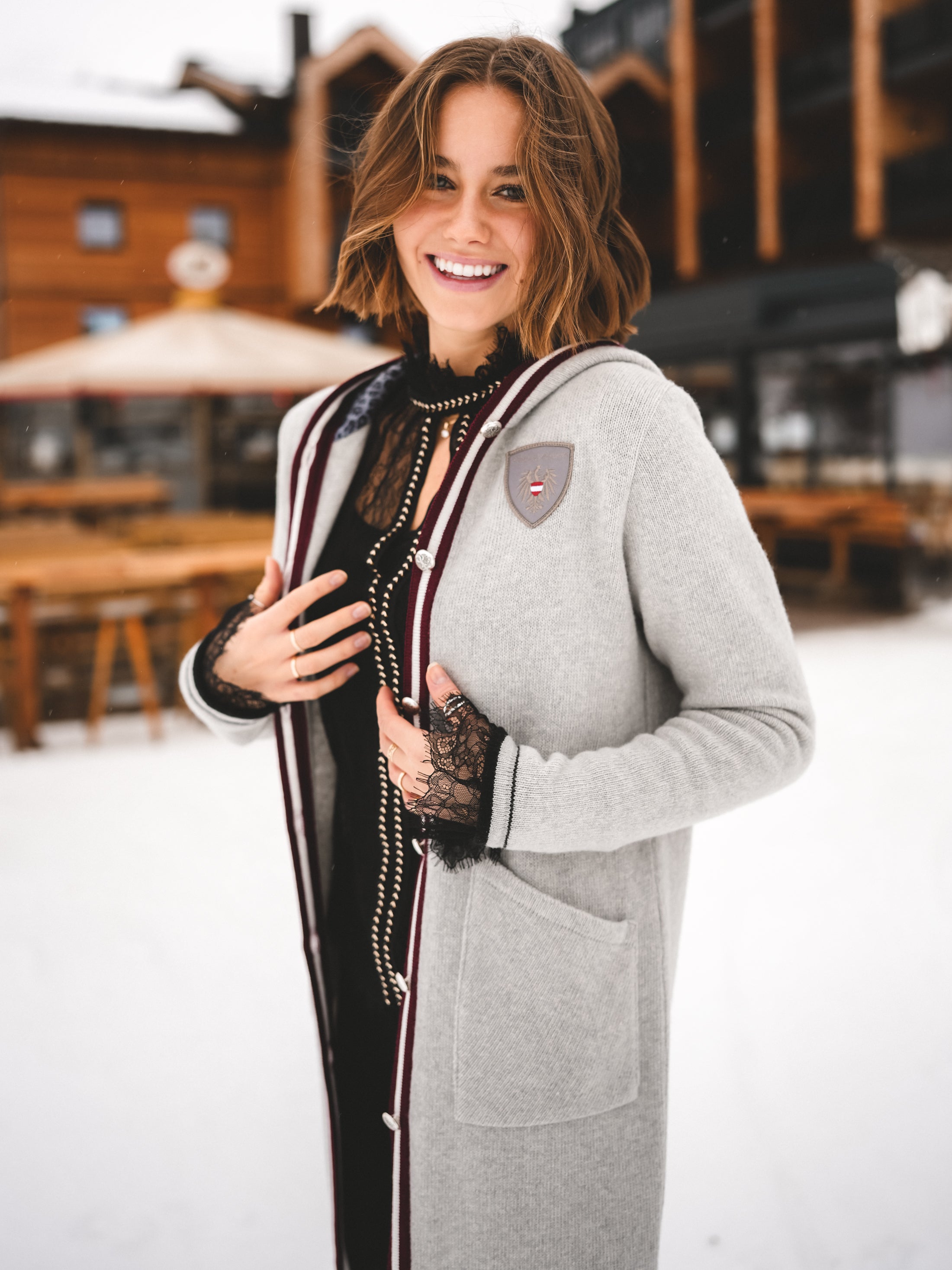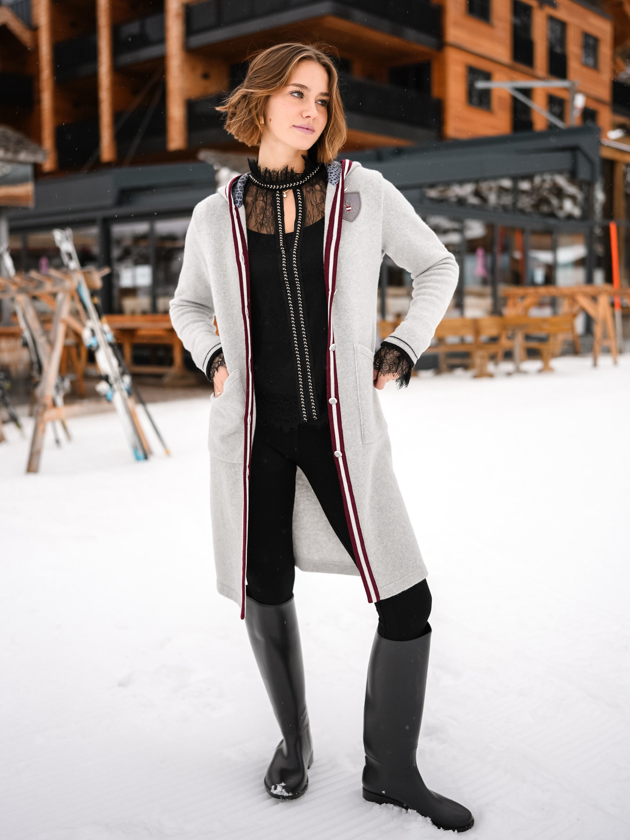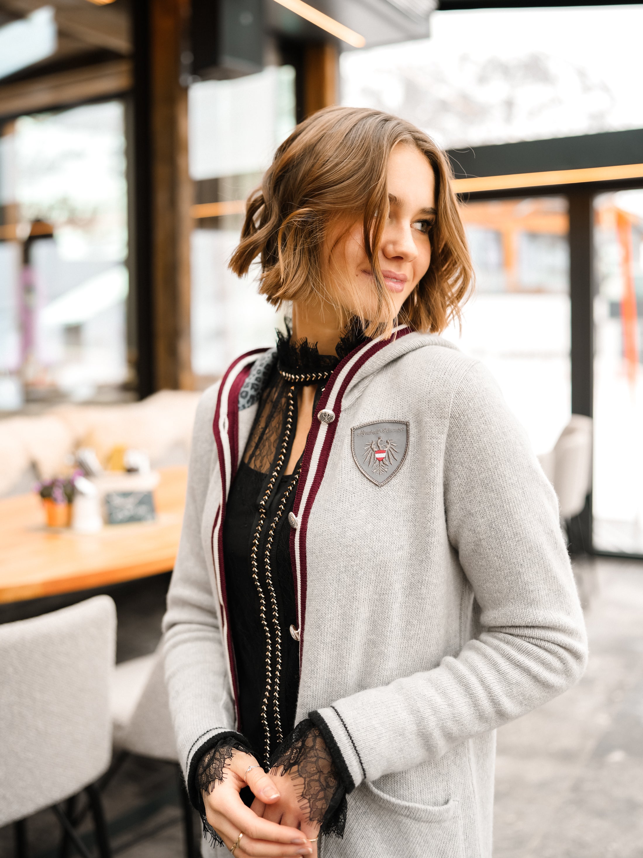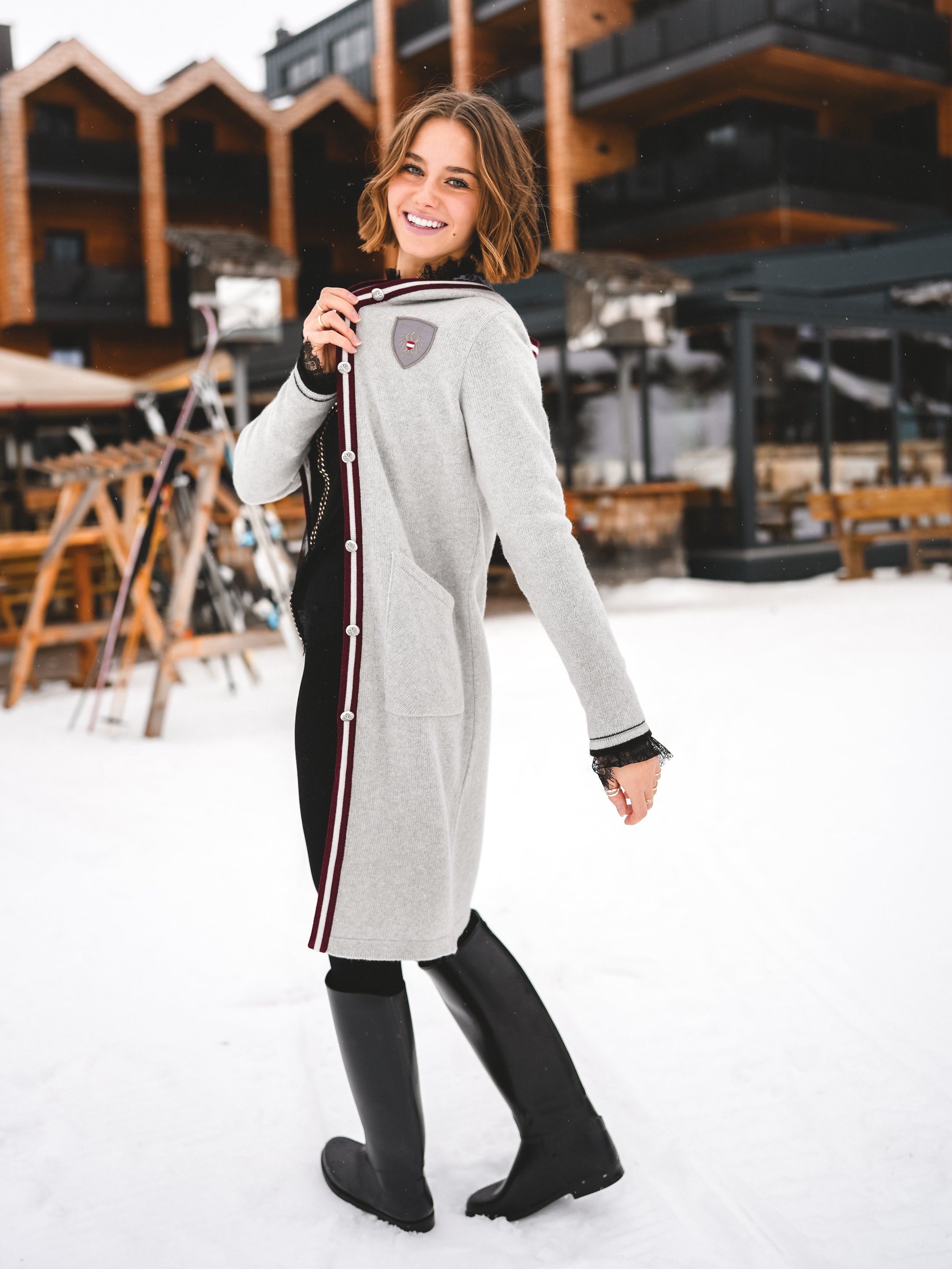 Ein Mantel, der das Gefühl echter alpiner Eleganz in jeden deiner Schritte legt. Alpenglück verzaubert mit seinem harmonischen Design, der markanten Rot-Weiß-Rot-Borte und der mit Leo gefütterten Kapuze, die jedem Look eine sanfte, gemütliche Note verleiht.