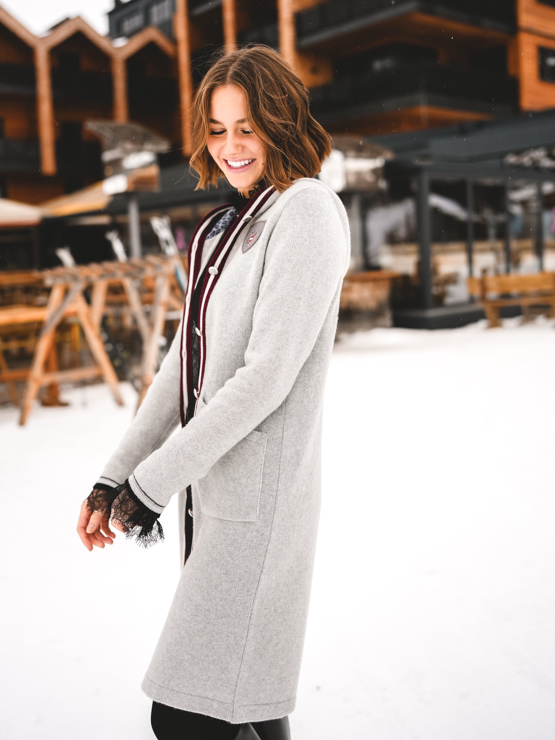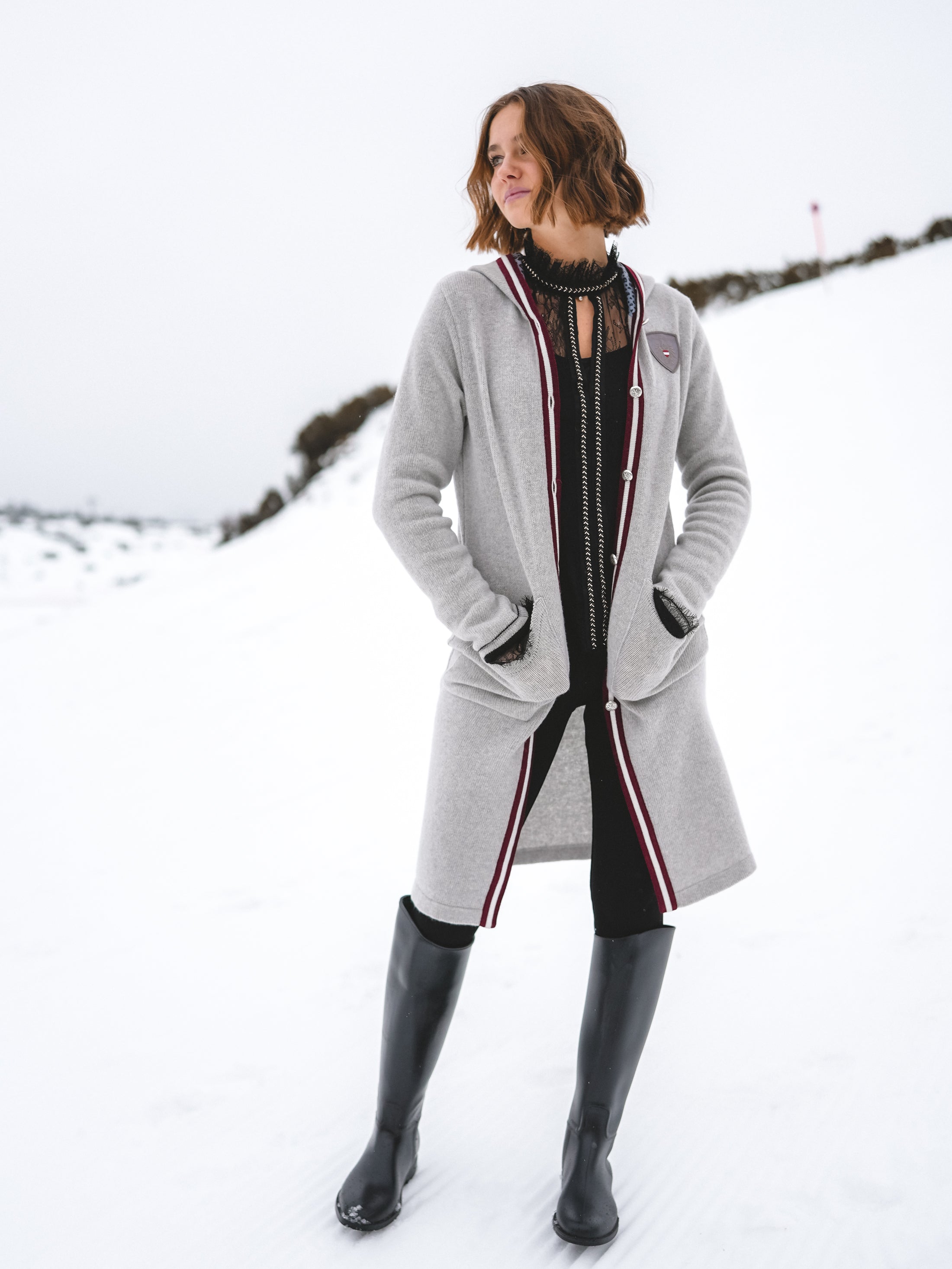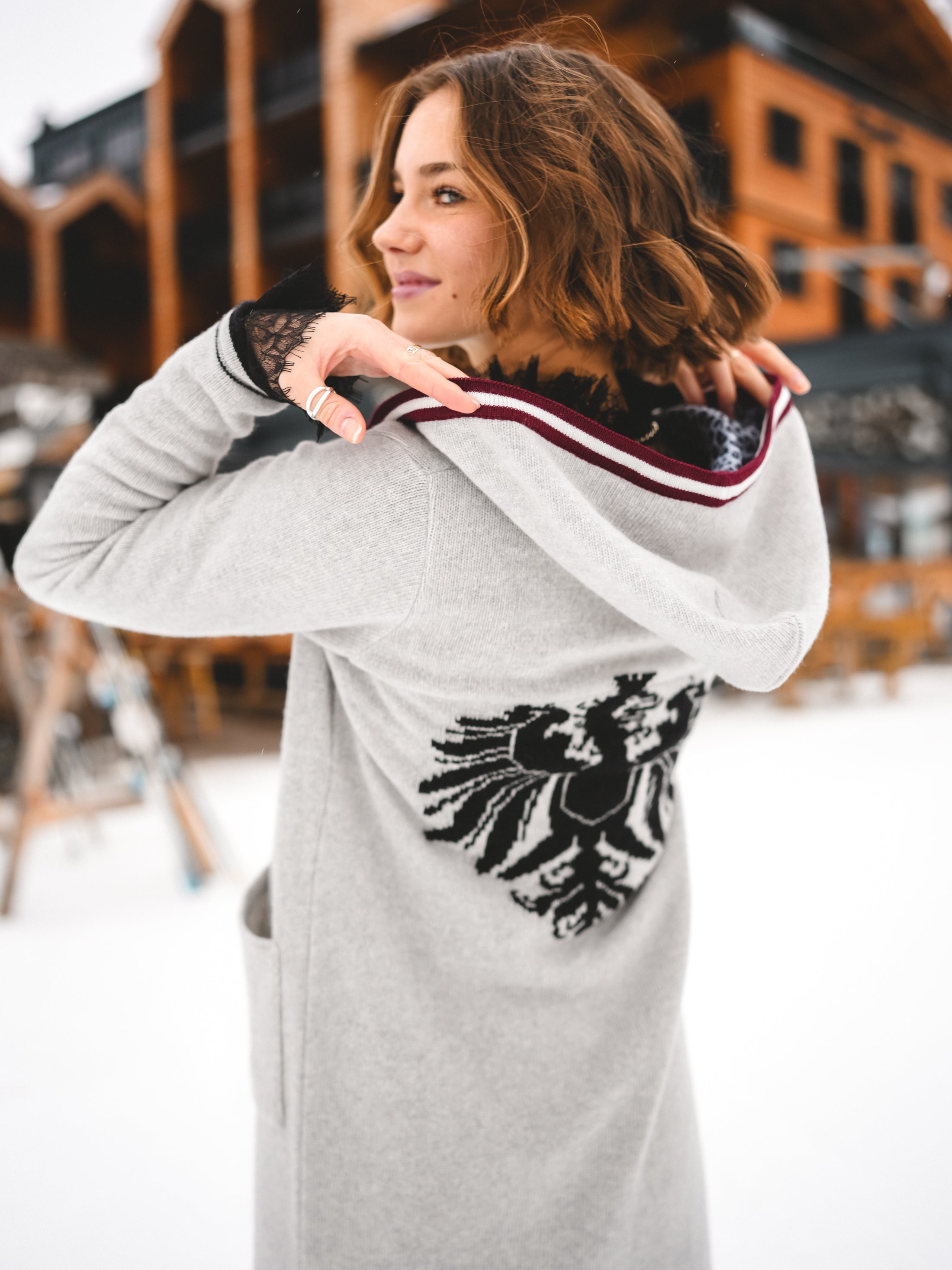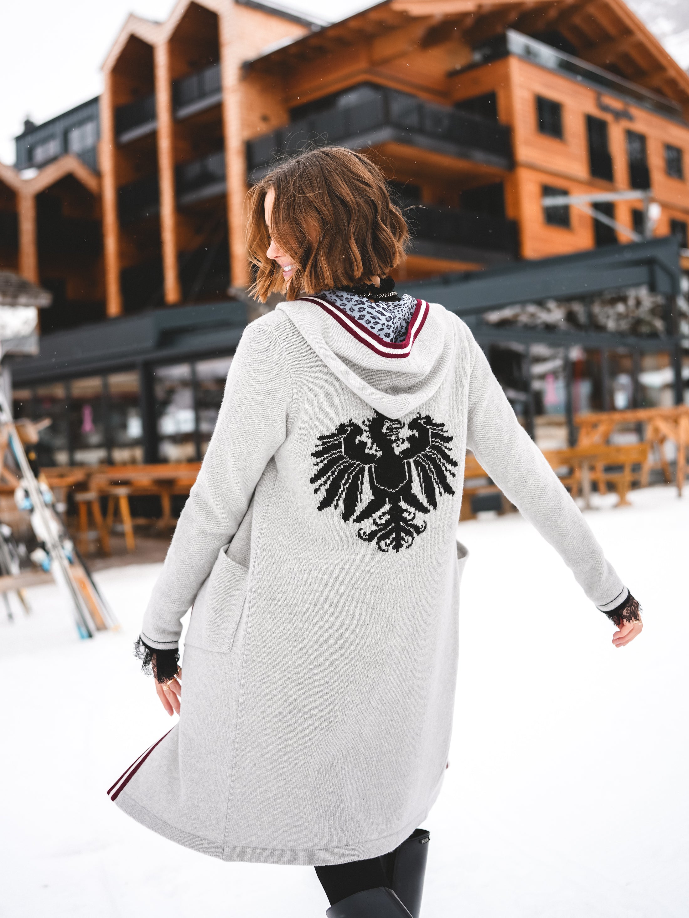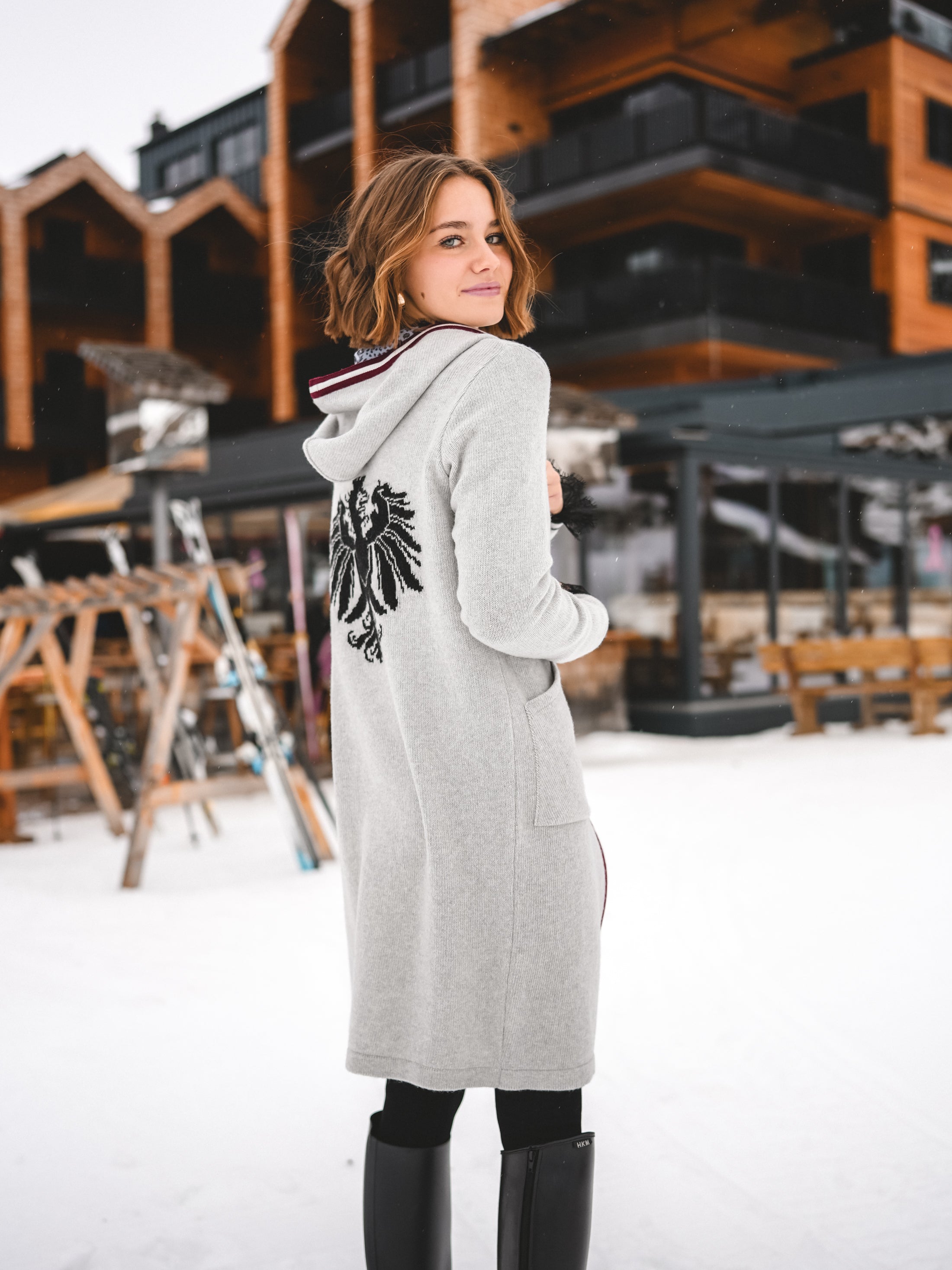 Am Rücken zeigt sich der kunstvoll eingestrickte Adler – ein Statement voller Charakter und alpiner Stärke. Praktische Taschen, edle Knöpfe und die wertige Haptik vervollständigen diesen besonderen Begleiter.