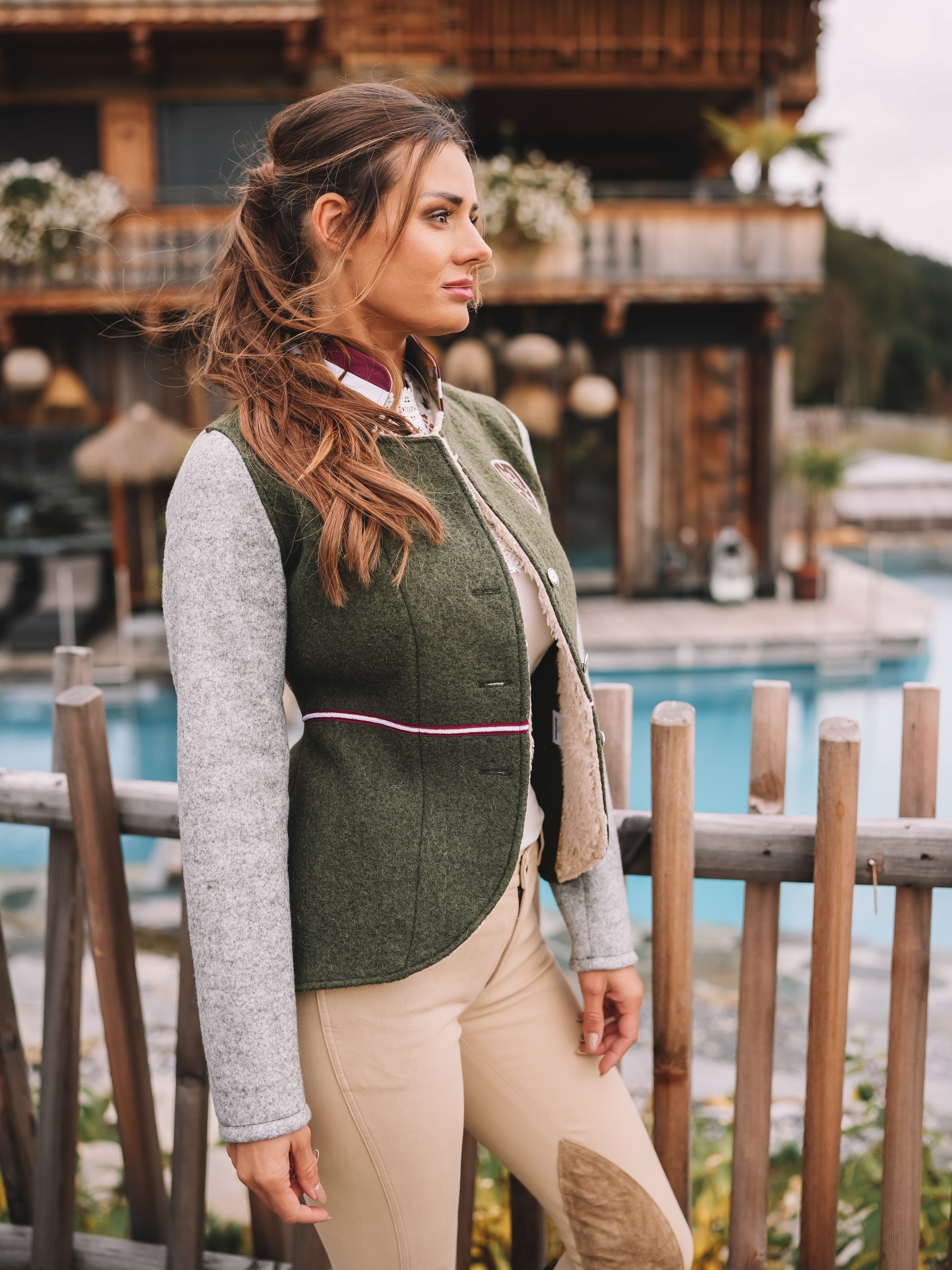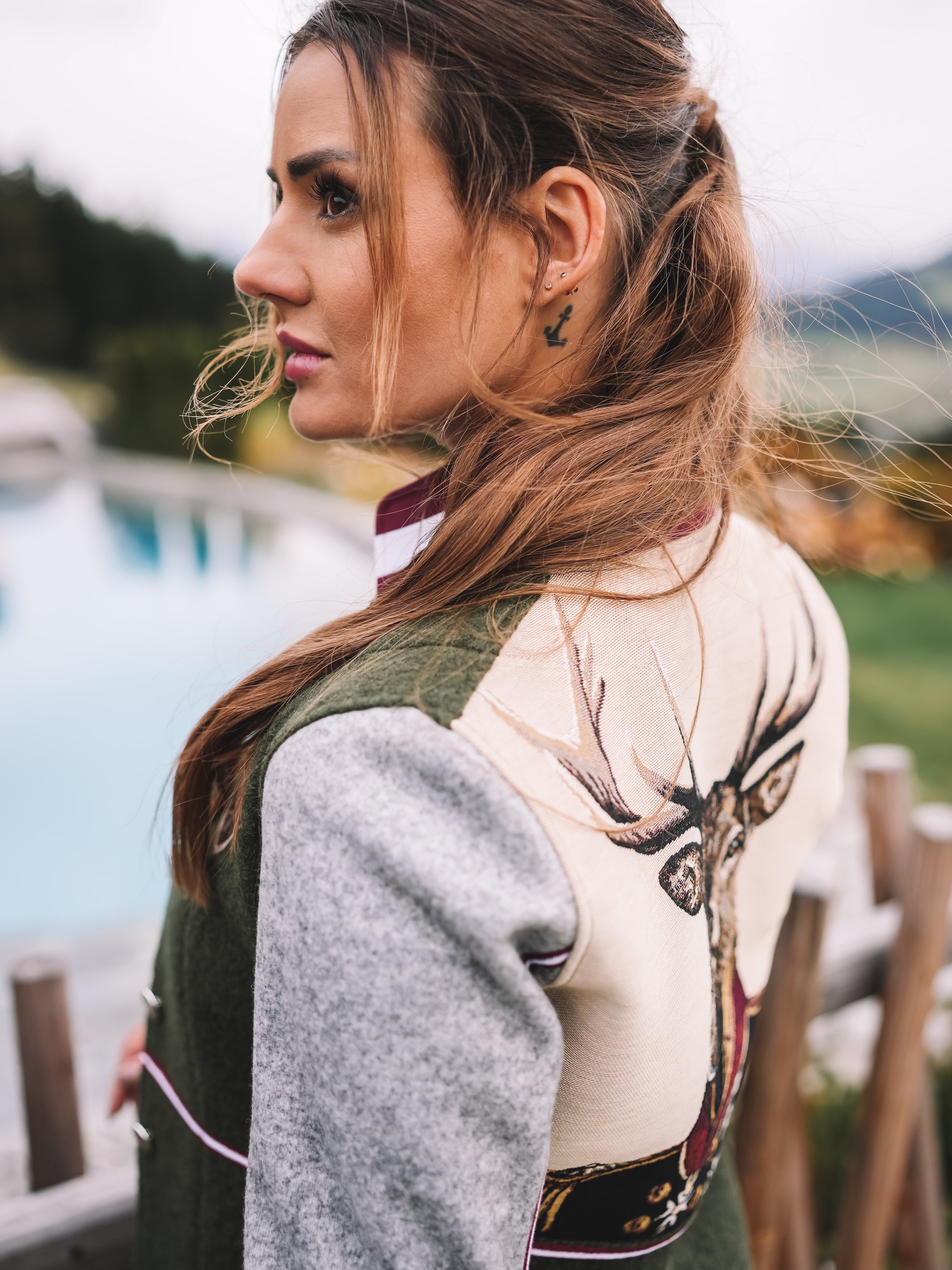 Majestätisch, elegant und voller Charakter – die Alpenkönigin verkörpert alpine Weiblichkeit in ihrer prachtvollsten Form. Das große Hirschmotiv am Rücken macht die