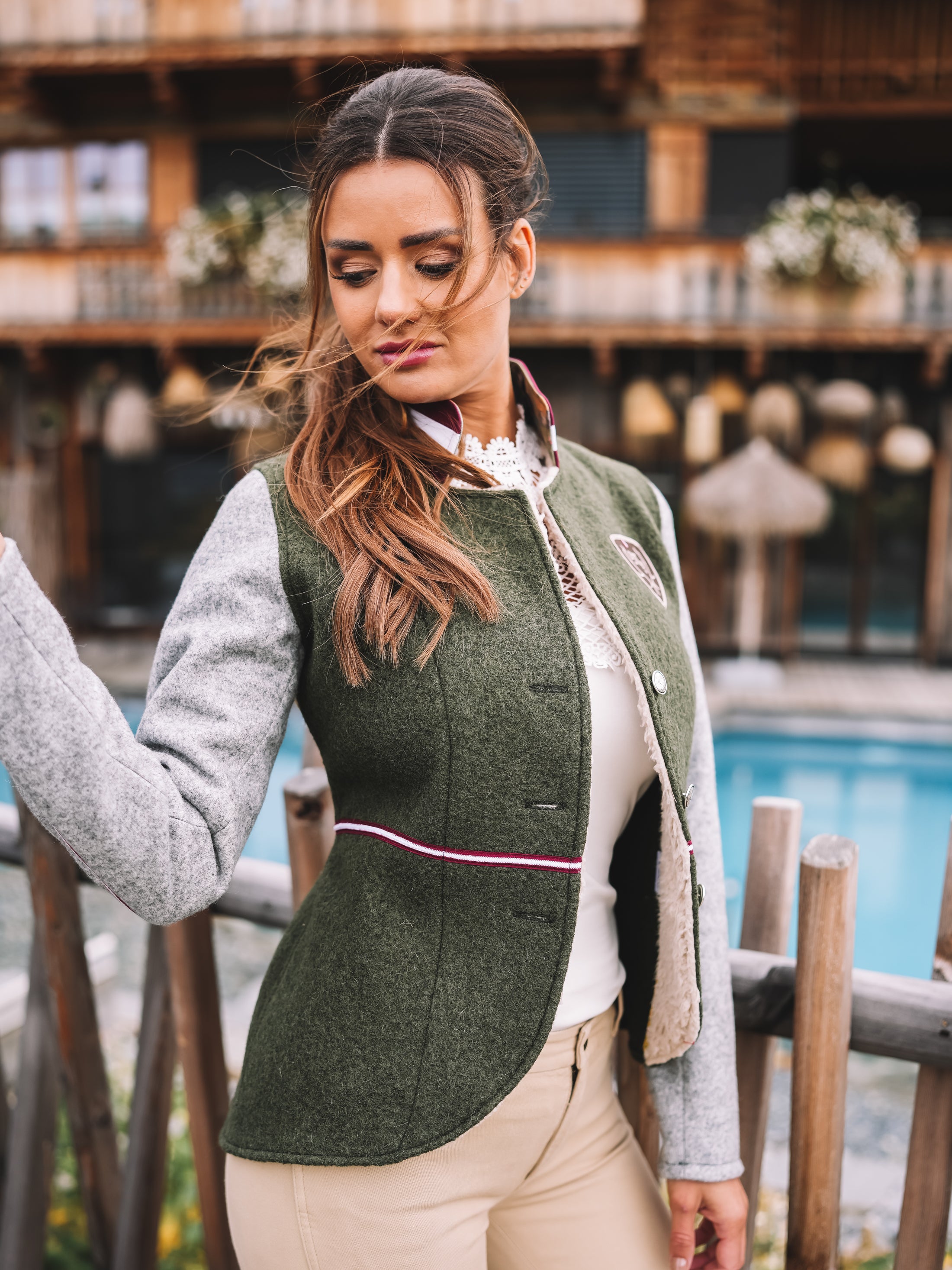 Feine Kontraste in Grün und Grau, kombiniert mit Rot-Weiß-Rot-Details und sorgfältiger Schnittführung, verleihen ihr eine zeitlose Silhouette. Ein Stück, das Tradition, Luxus und Individualität auf unverwechselbare Weise vereint.