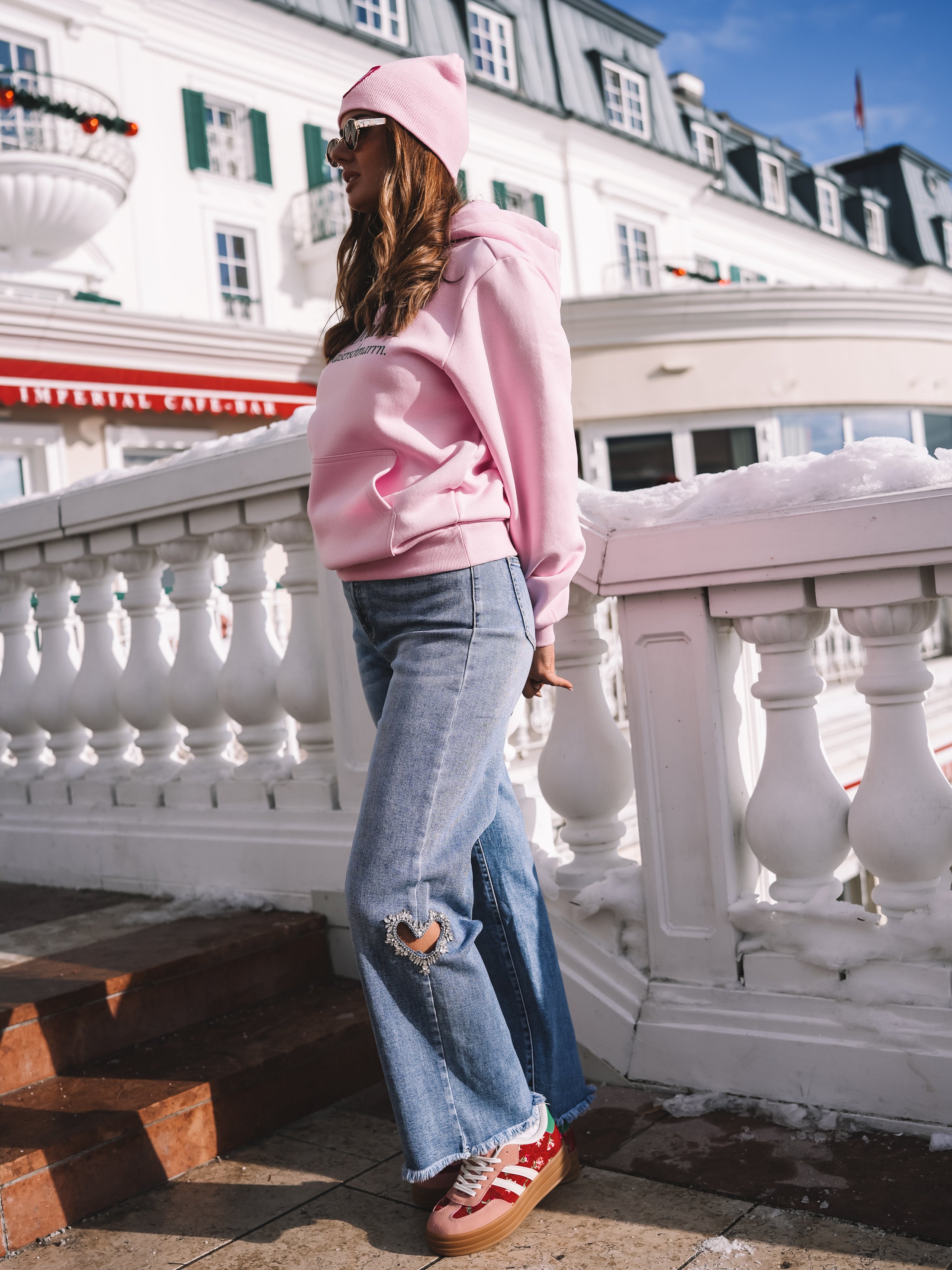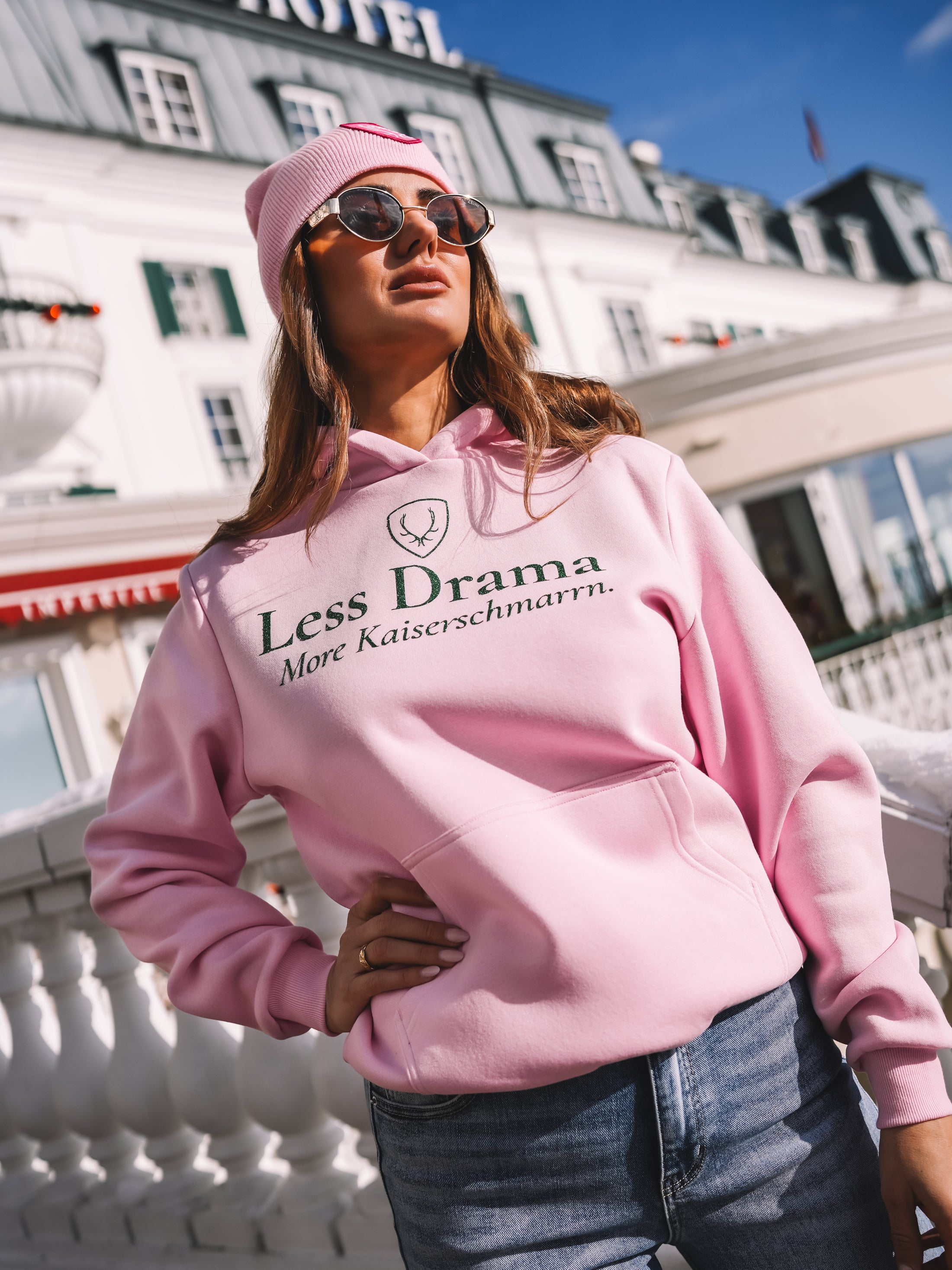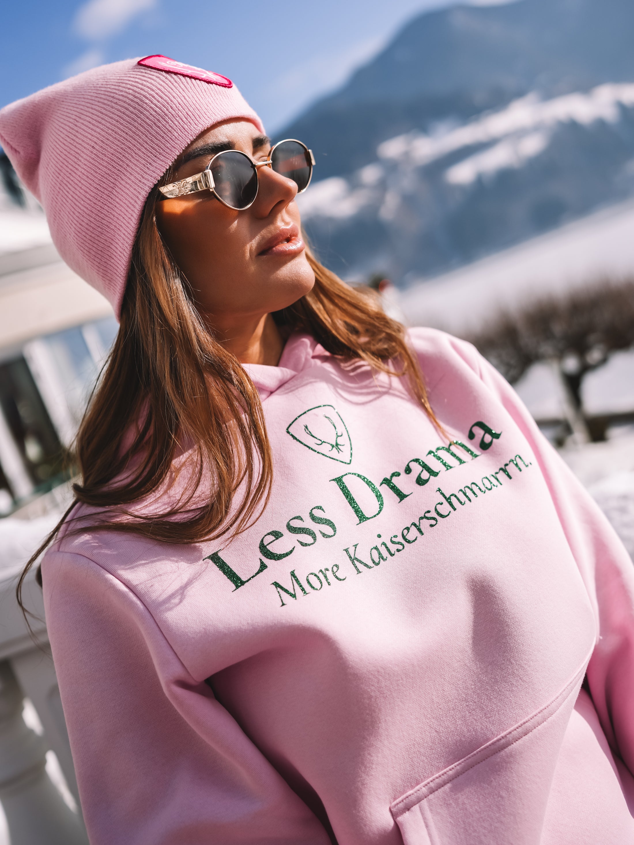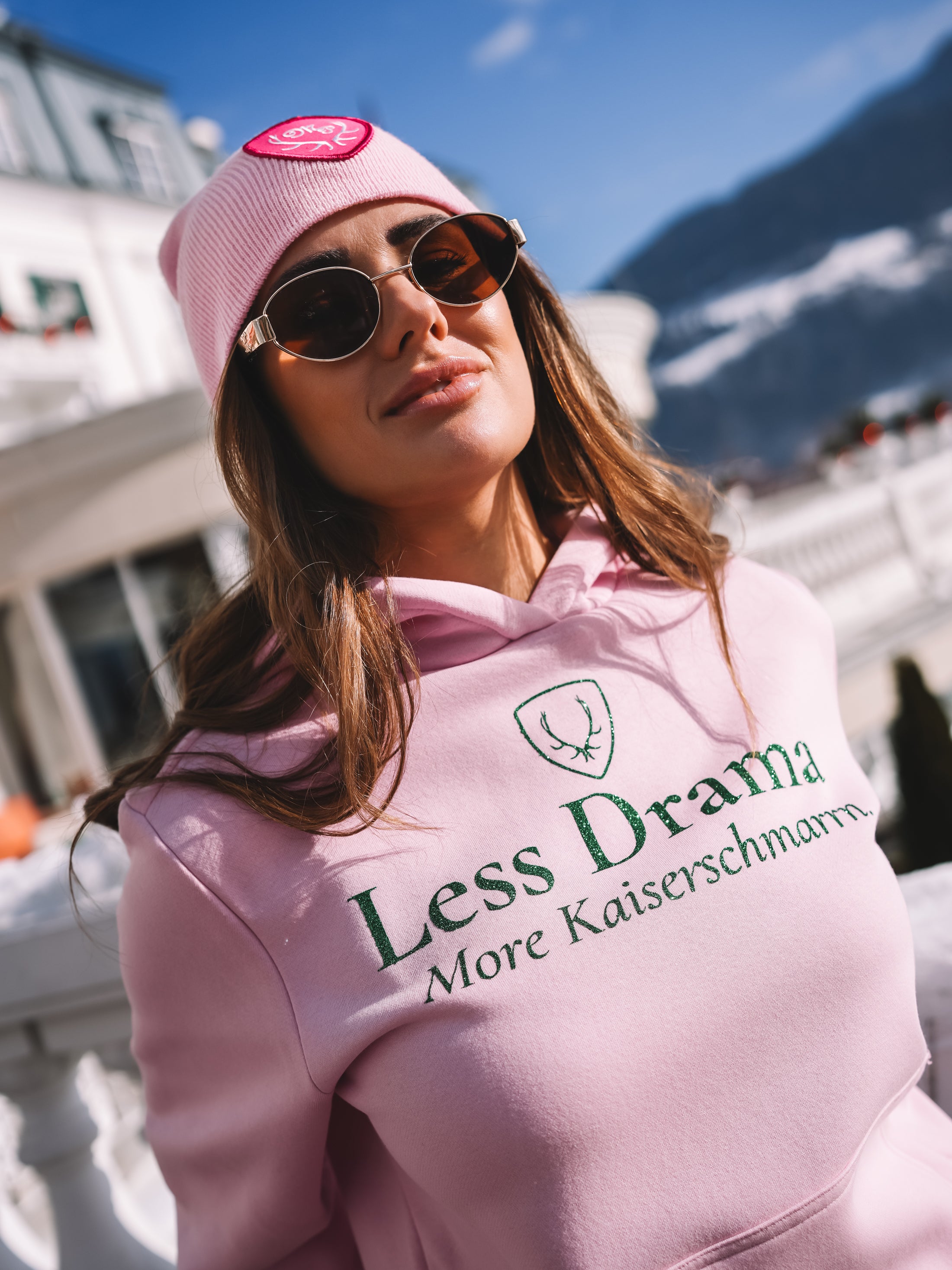Der sanfte Roséton verleiht dem Hoodie eine feminine Eleganz, während der Statement-Print dem Look Haltung und Charakter gibt. Die entspannte Silhouette sorgt für einen modernen, selbstverständlichen Auftritt – perfekt zwischen Alpine Chic und urbanem Glamour.