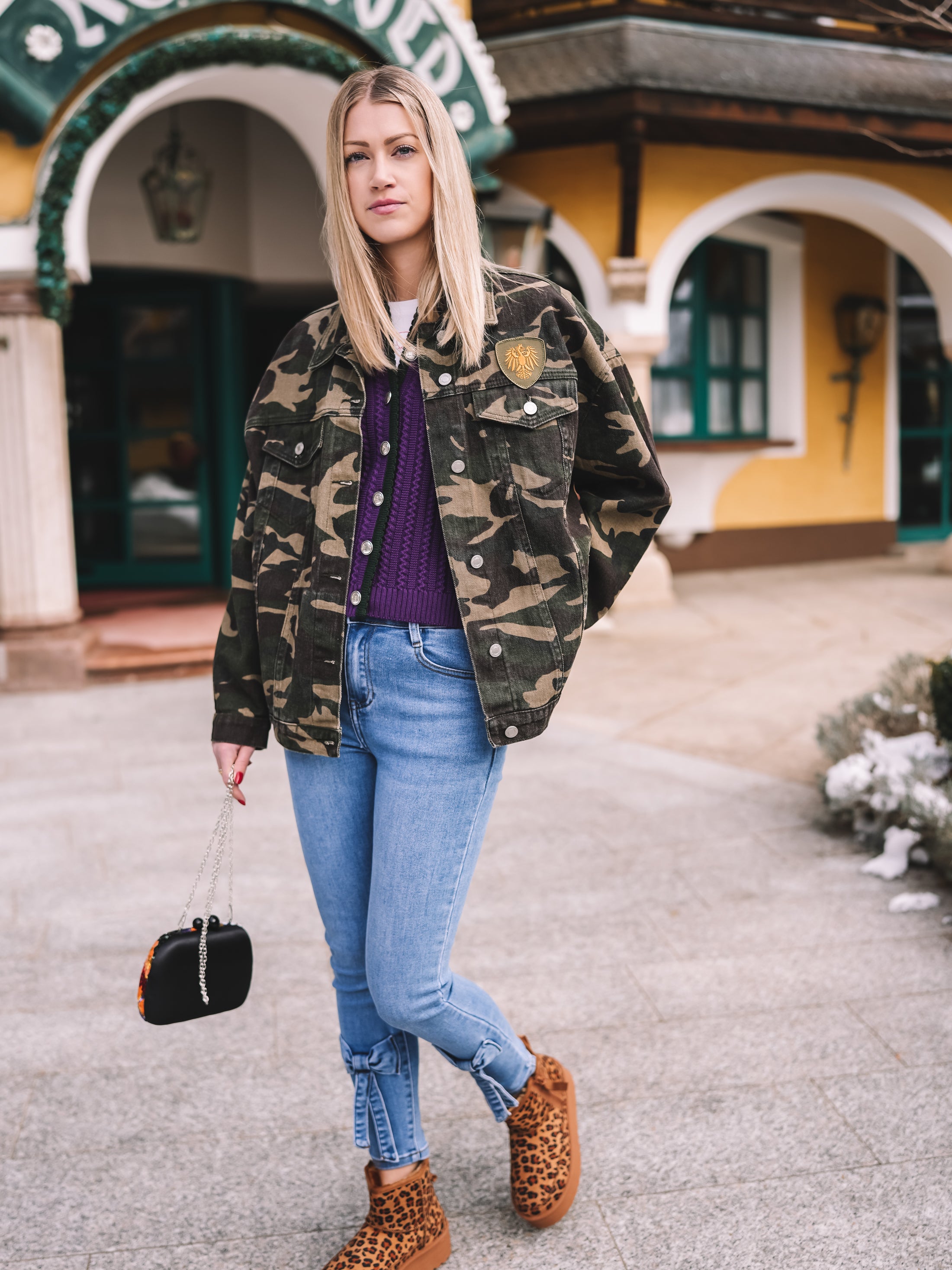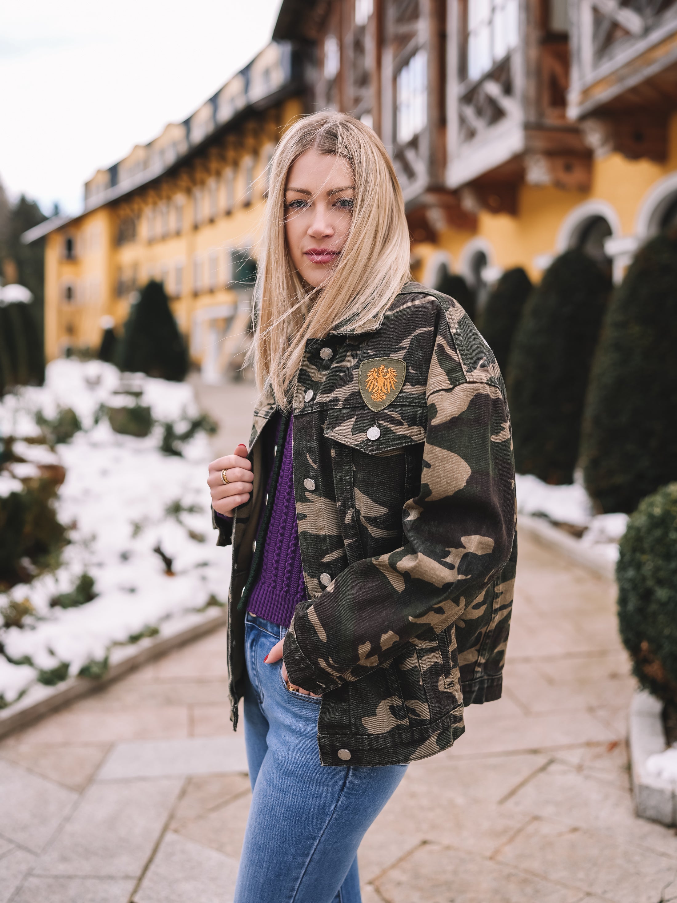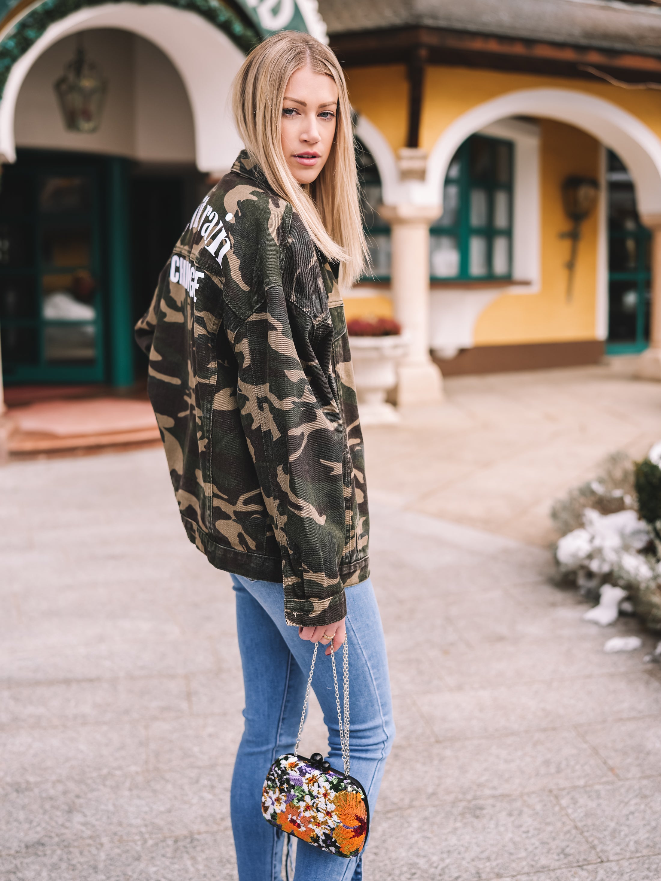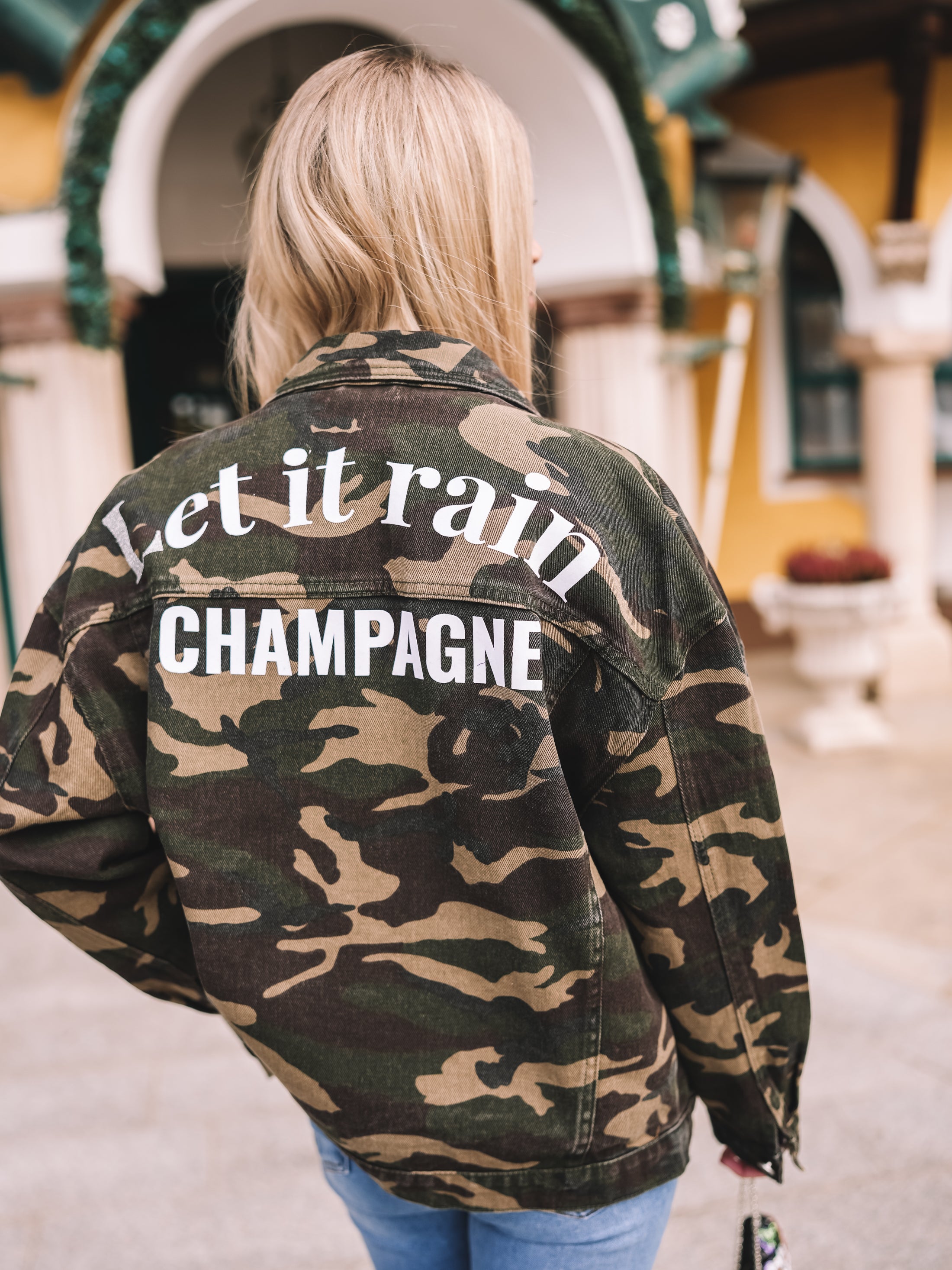 „Let it rain Champagne“ ist eine Oversized-Jacke mit Attitude – Camouflage trifft auf Fashion-Statement. Der markante Schriftzug am Rücken verleiht der Jacke genau jene selbstbewusste Energie, die jedes Outfit sofort spannender macht.
