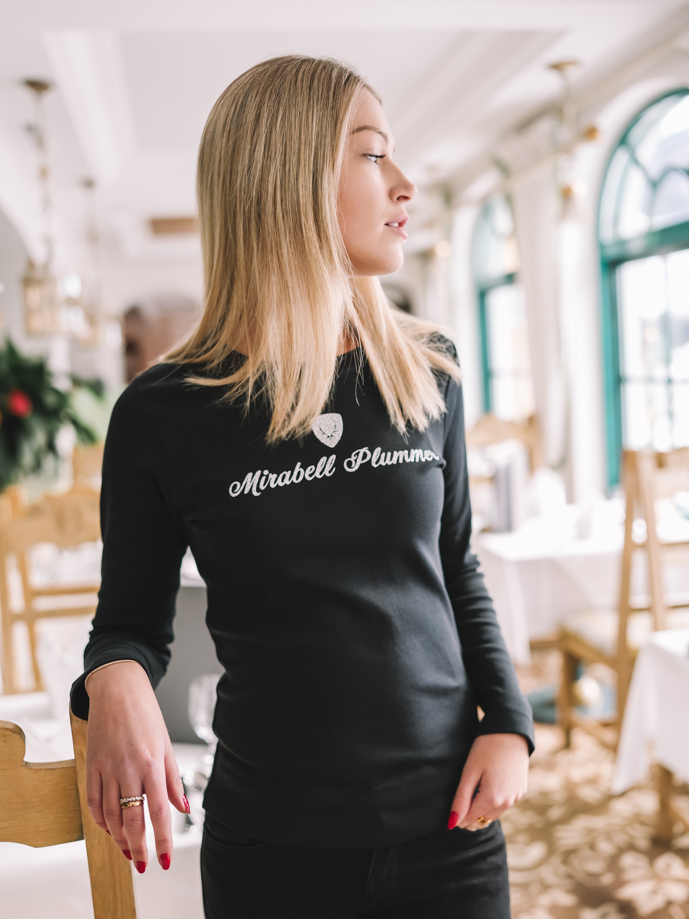 Die Spark Edition fängt genau das ein, was alpine Eleganz so besonders macht: ein Hauch Glanz, ein Statement aus Style und Persönlichkeit. Das schwarze Langarmshirt trägt den glitzernden „Mirabell Plummer“ Schriftzug wie ein edles Signature-Detail – dezent, aber mit wirkungsvoller Ausstrahlung.