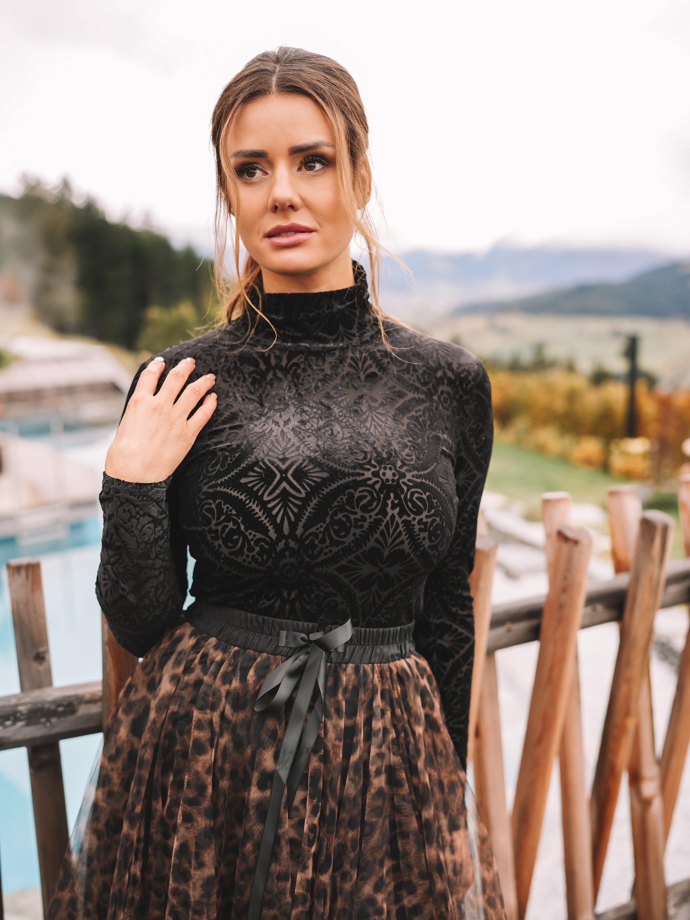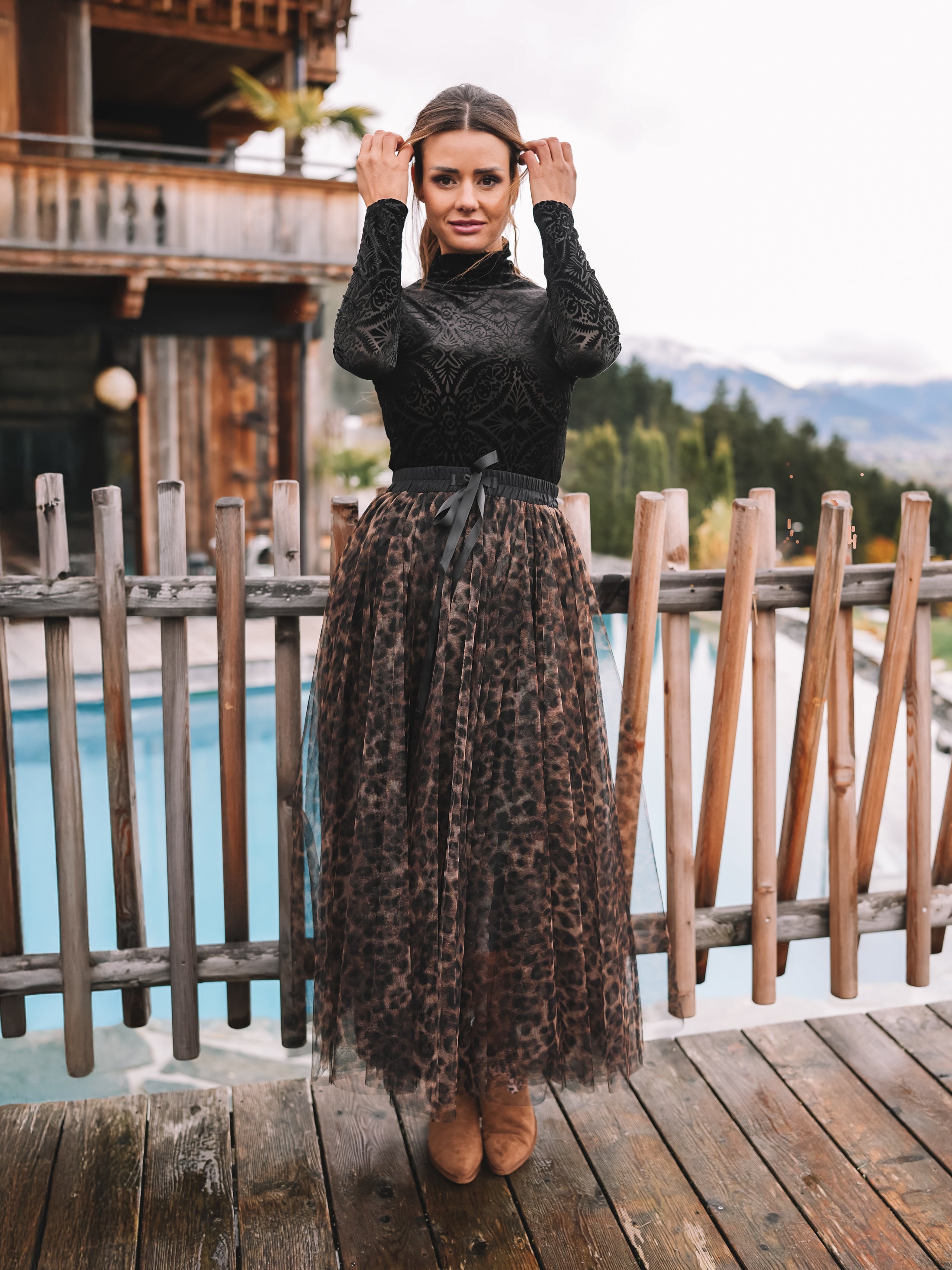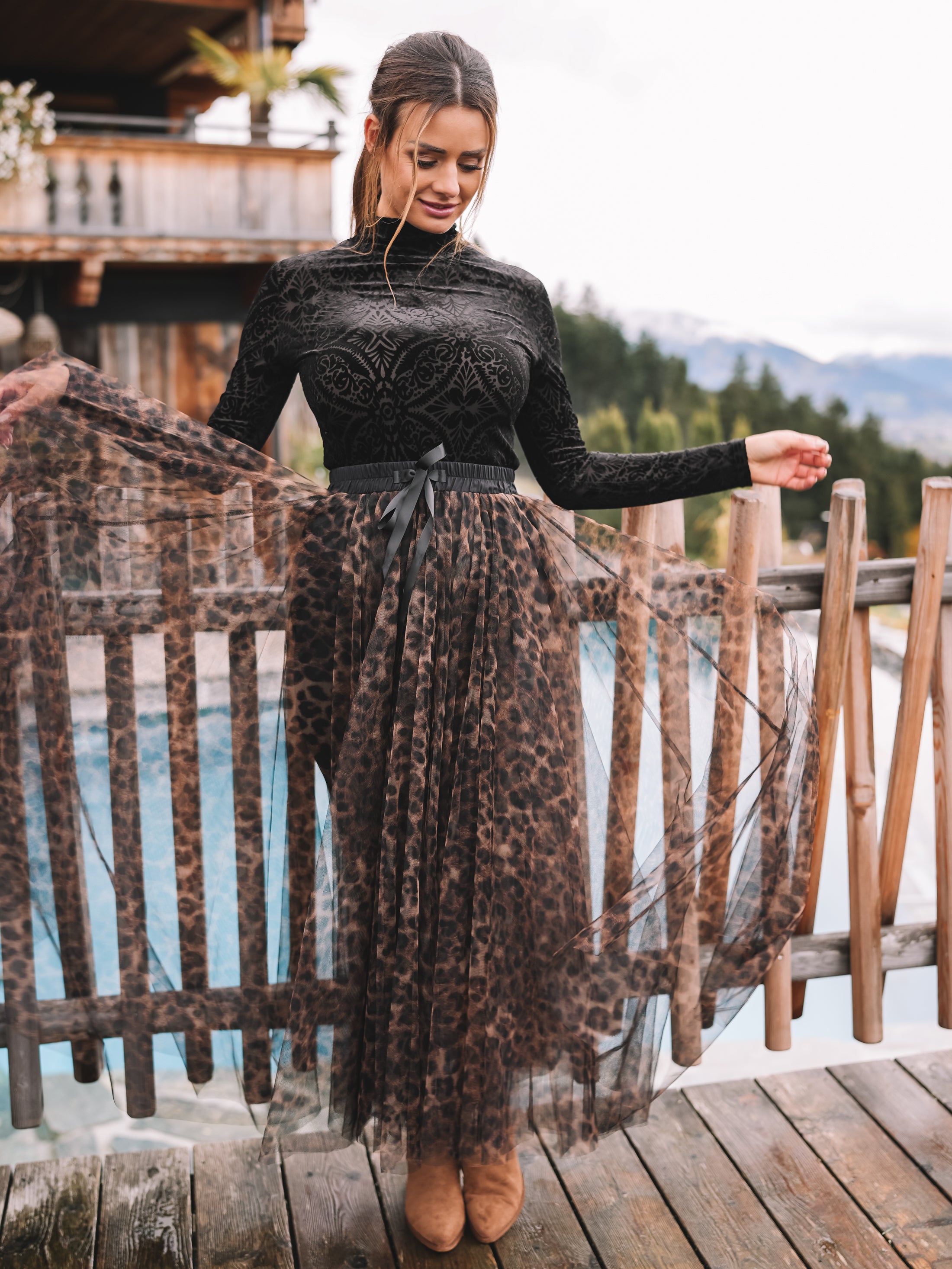 Der Rock „Alpine Leopard“ ist ein sanfter Blickfang mit starker Ausstrahlung. Gefertigt aus feinem Tüll mit braunem Leoprint, bringt er Leichtigkeit in die Bewegung und Charakter in den Look. Der eingearbeitete Unterrock sorgt für angenehmen Tragekomfort, ohne dem transparenten Spiel des Tülls seine Wirkung zu nehmen.