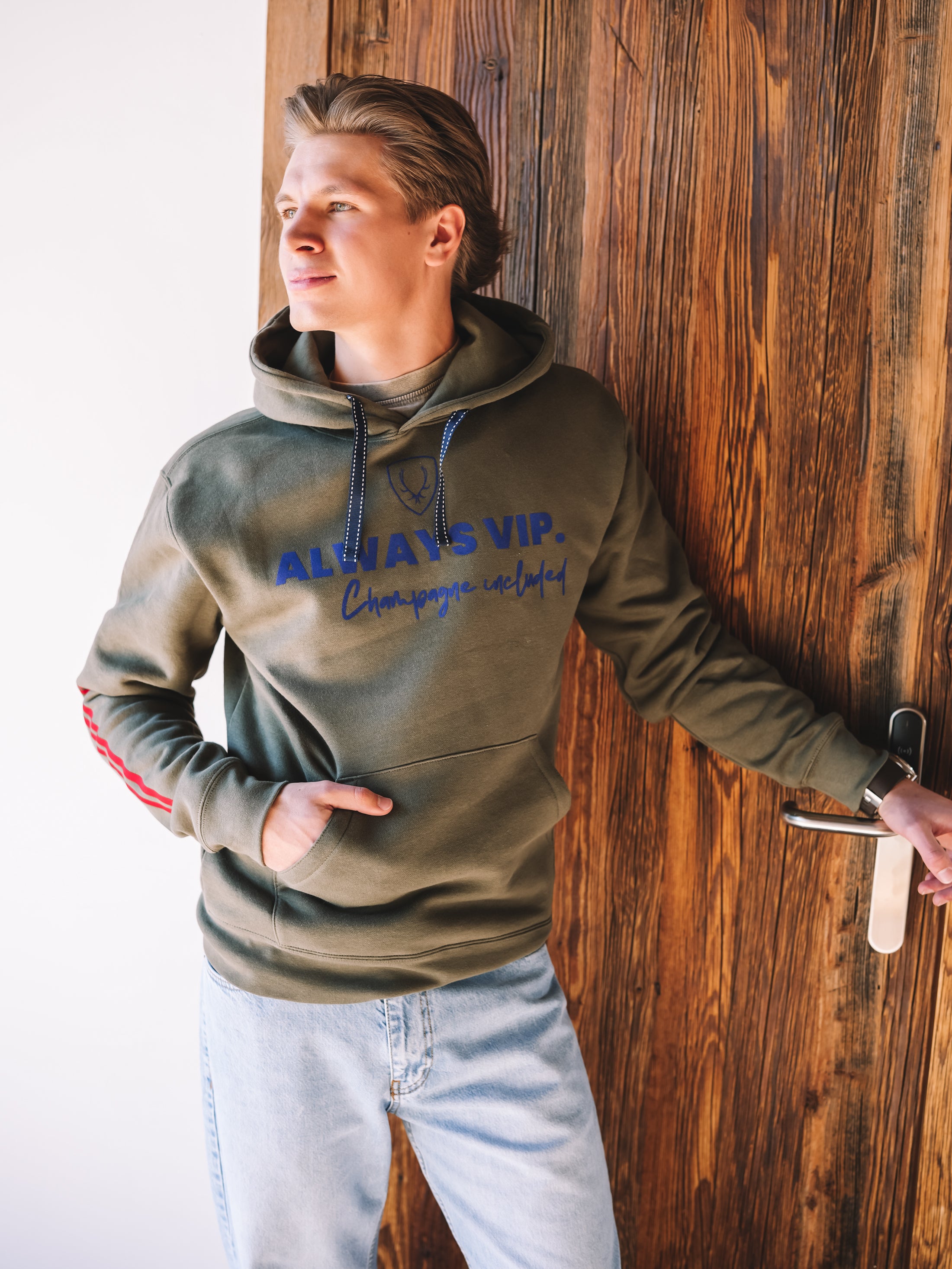 „Club Level“ verbindet alpine Lässigkeit mit einem Augenzwinkern Luxus – ein Hoodie für Männer, die ihren Stil entspannt tragen und wissen, dass ein guter Auftritt manchmal ganz einfach ist.