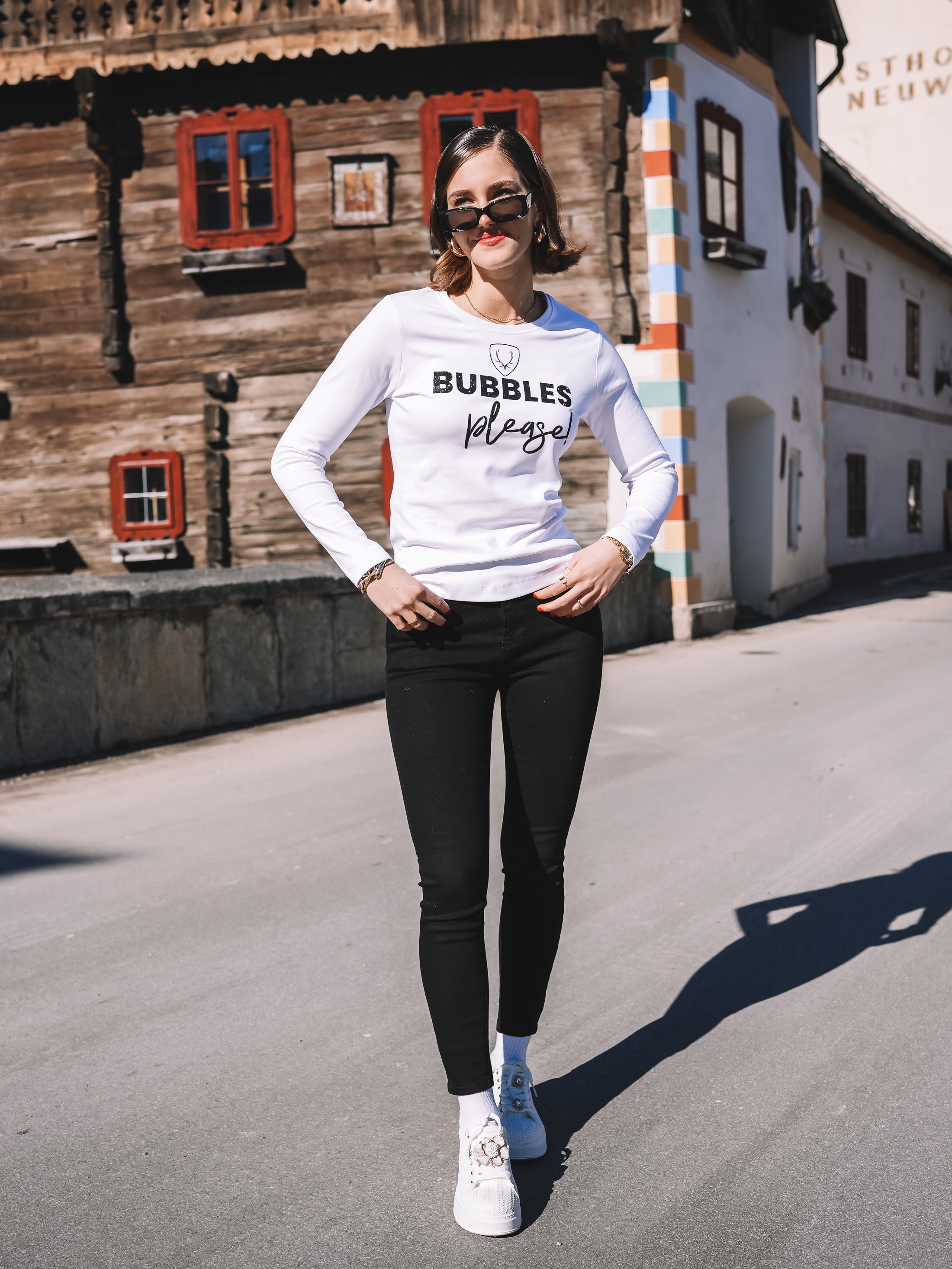 Ein Hauch von Leichtigkeit. Ein Statement mit Augenzwinkern. „Champagne Mood“ steht für dieses besondere Lebensgefühl: spontan, stilvoll, ein bisschen verspielt – und immer mit einem Funkeln in den Augen. Der klare Weißton wirkt frisch und feminin, während der „Bubbles Please“-Print selbstbewusst zeigt, wie man durchs Leben geht: mit Genuss, nicht mit Stress.