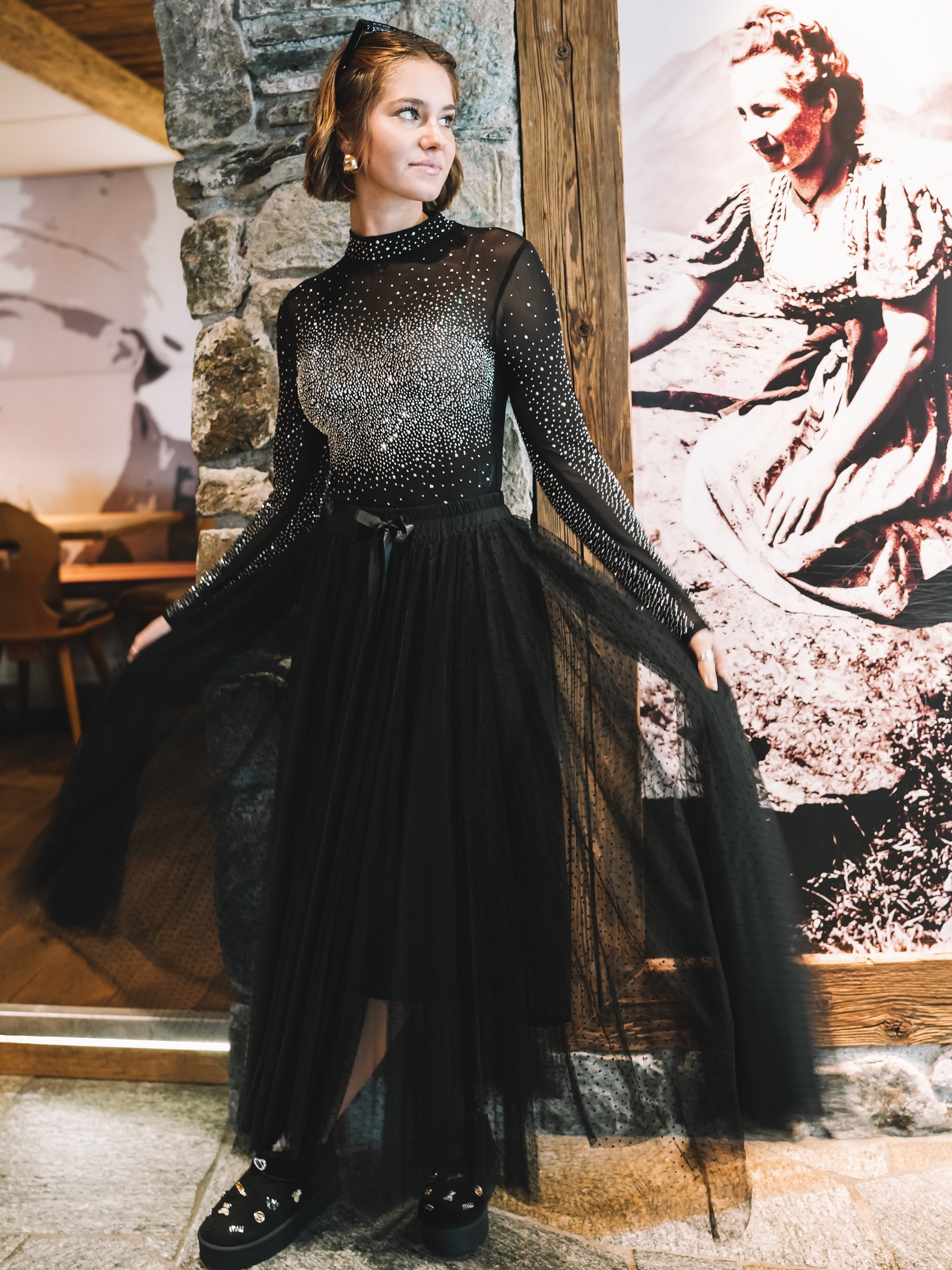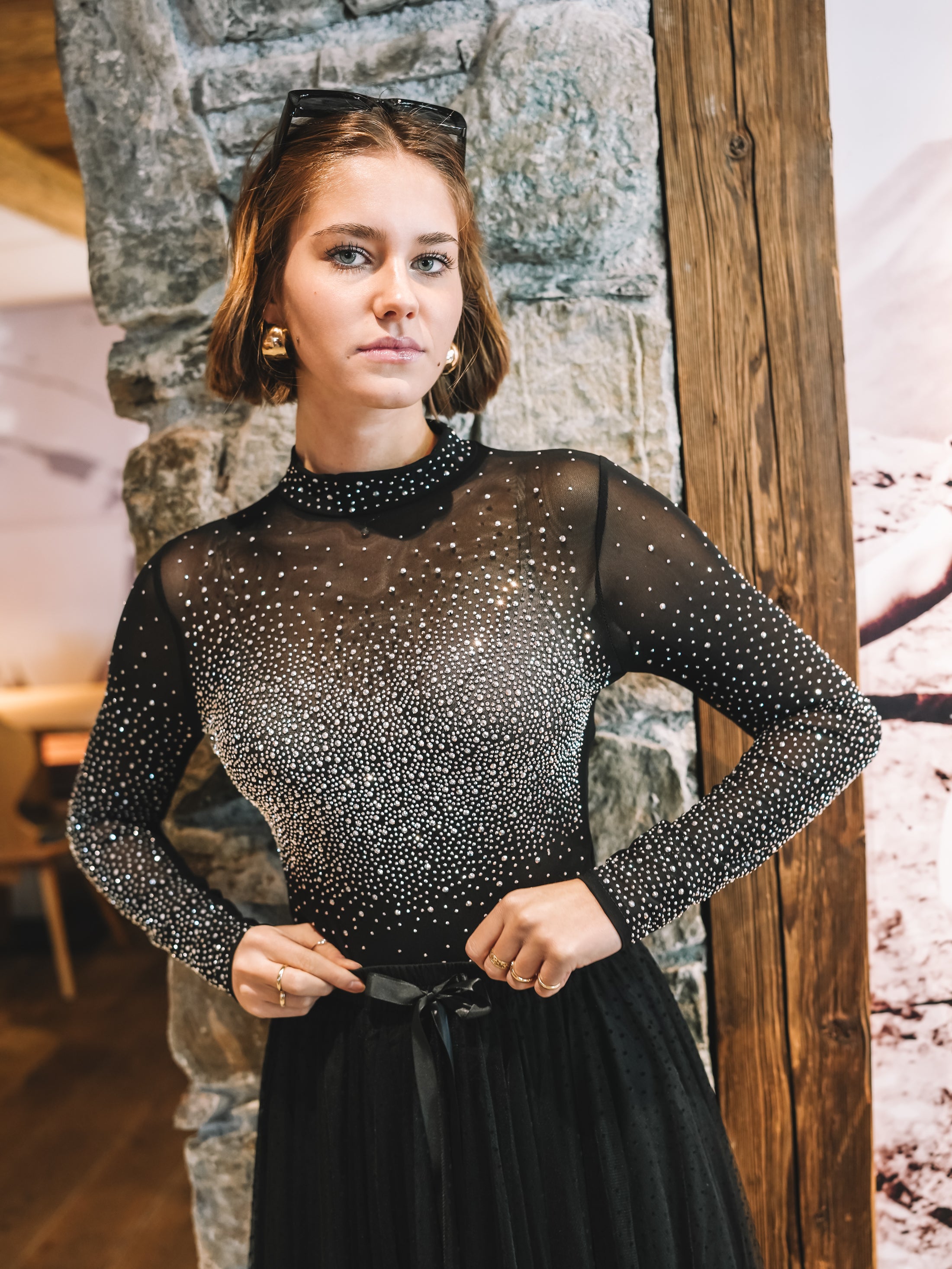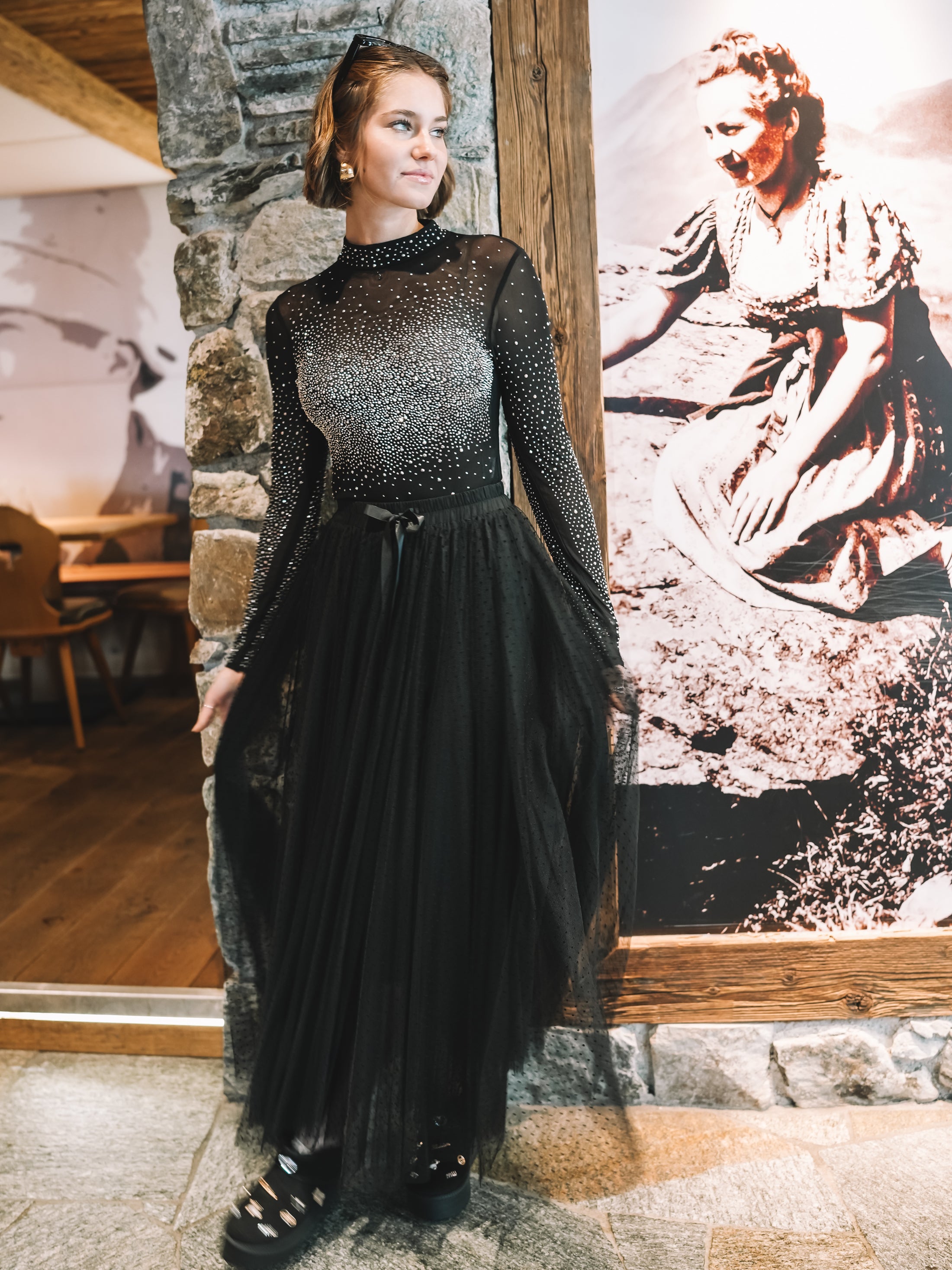 Die Strasssteine sind dicht gesetzt und erzeugen einen edlen, funkelnden Effekt, der an einen Sternenhimmel erinnert. Ob zu einer fließenden Hose, einem Rock oder als glamouröser Kontrast zu cleanen Silhouetten – Midnight Empress zieht Blicke magisch an und bleibt dabei stilvoll und feminin.