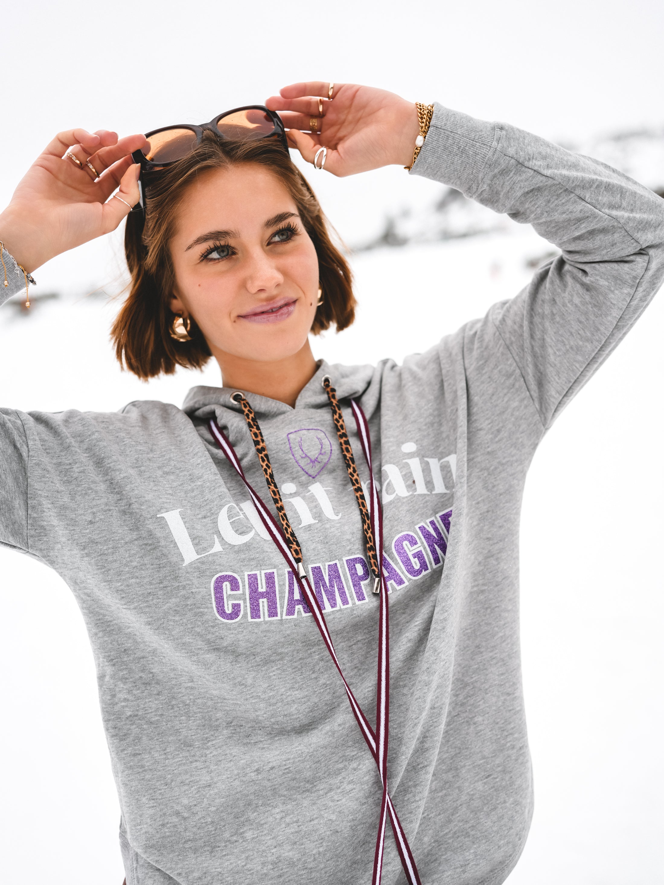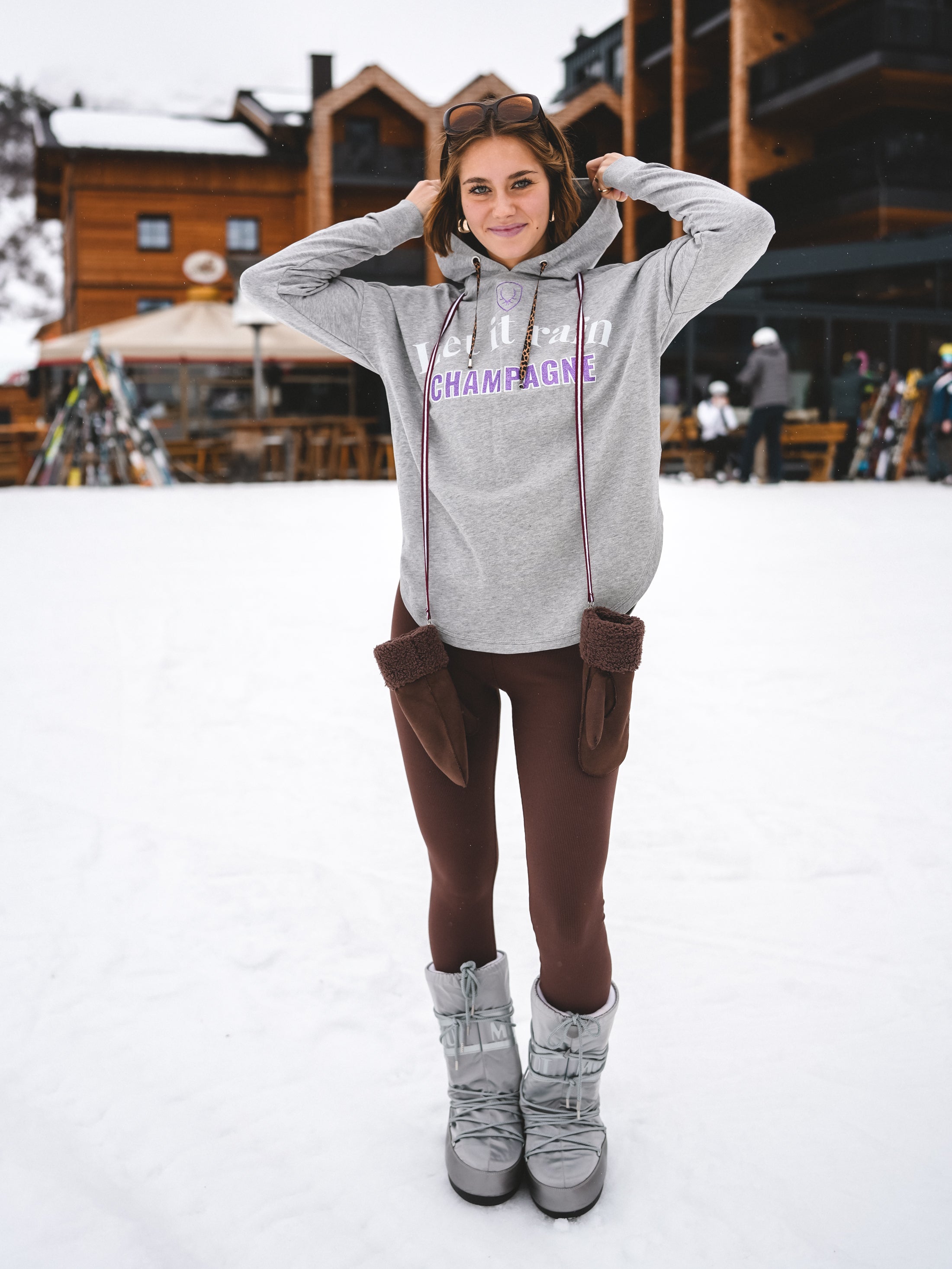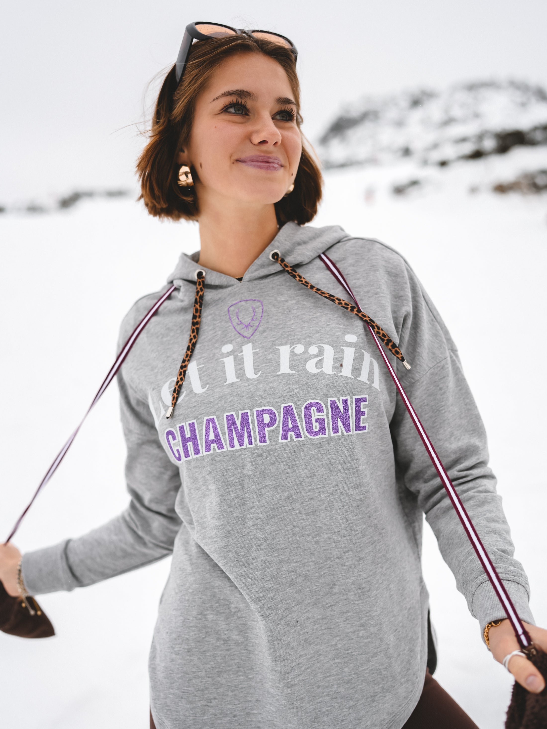 Grau, lässig, aber mit Glam – Champagne Crush ist der Hoodie für alle, die ihren Alpine-Lifestyle mit einem Augenzwinkern tragen. Der „Let it rain Champagne“-Statement-Print setzt den Vibe sofort: Après-Ski, Bubbles, Sonnenterrasse – und dieses Gefühl, wenn der Tag nach Lieblingsmomenten schmeckt.