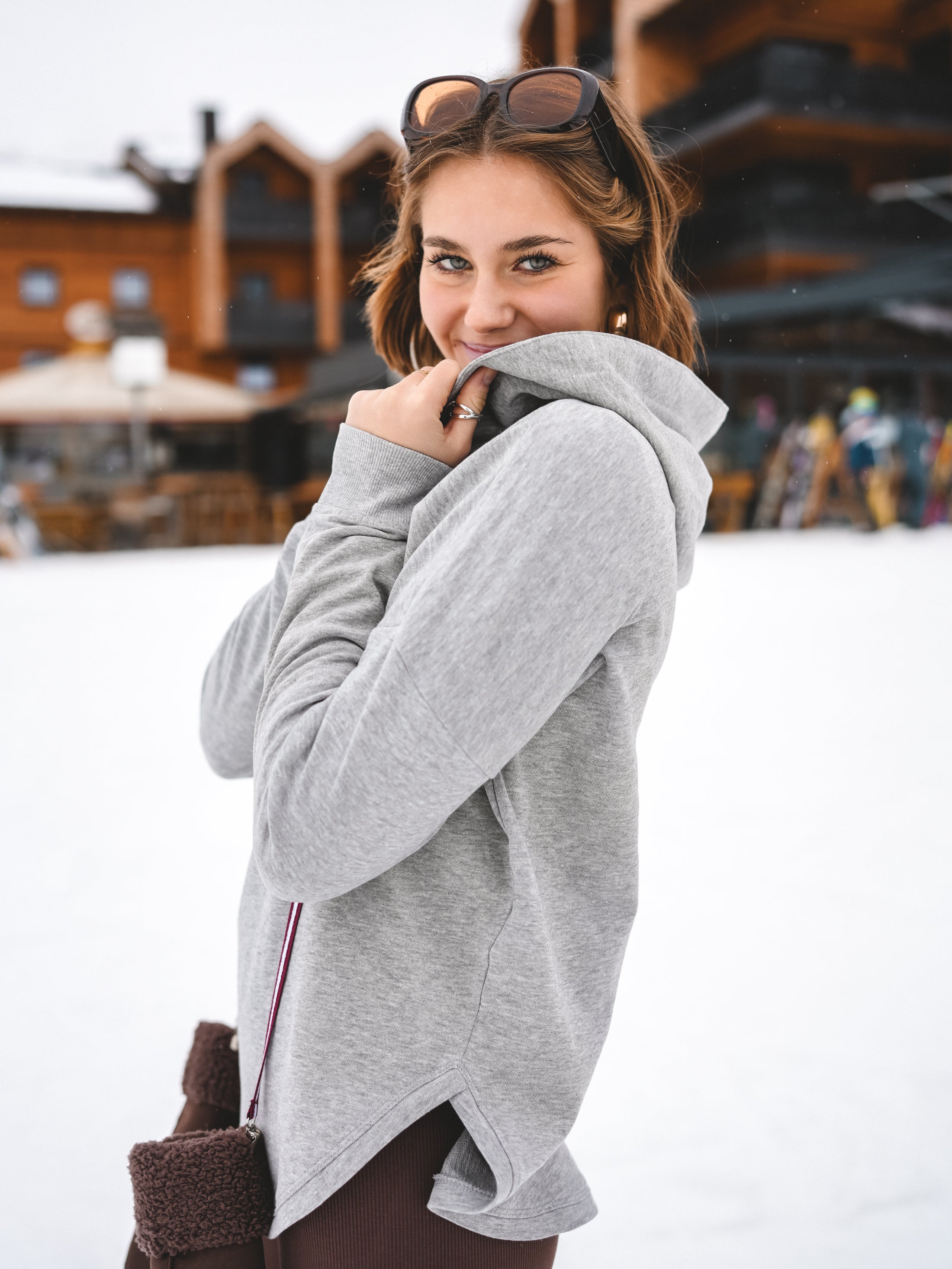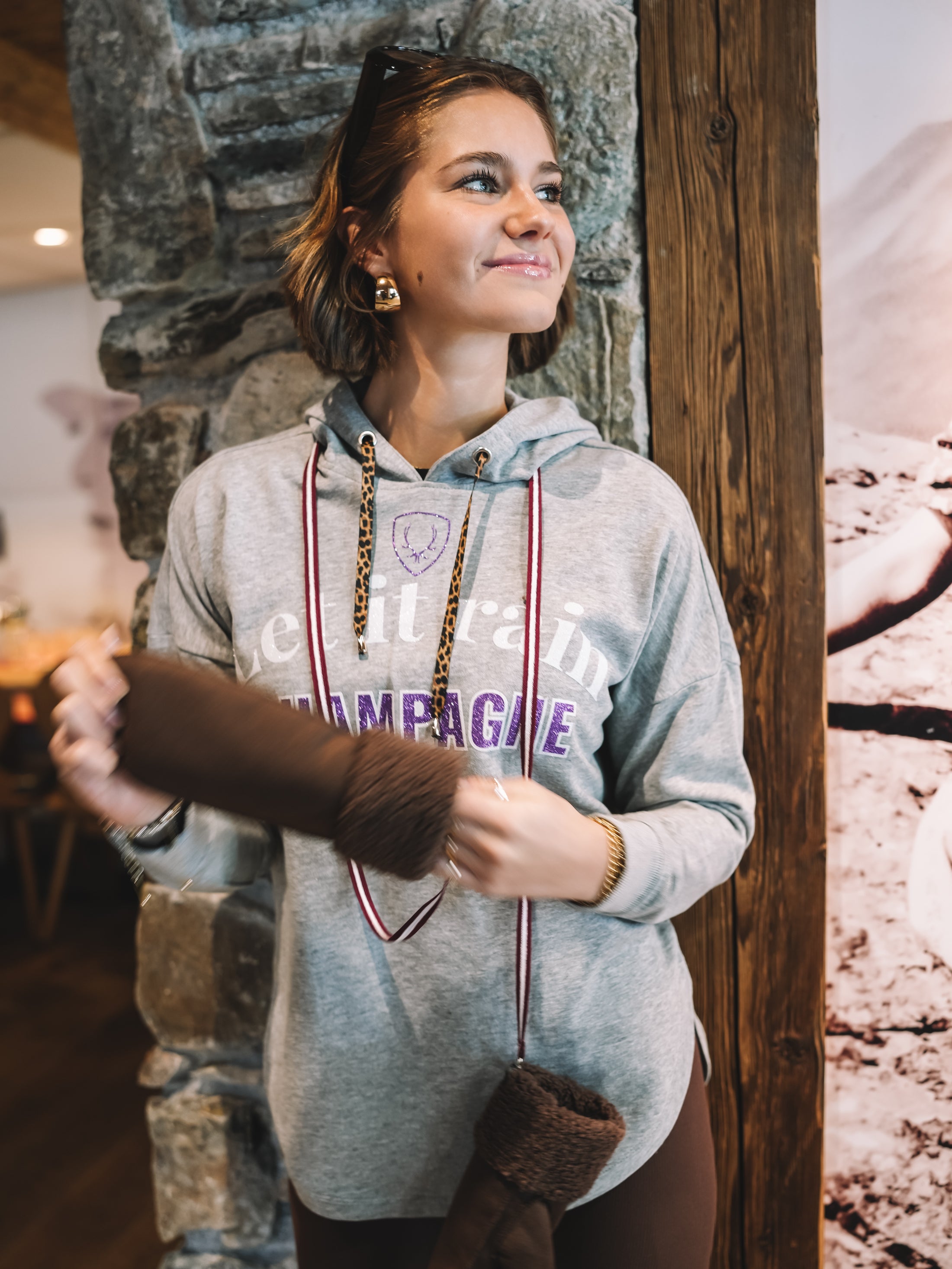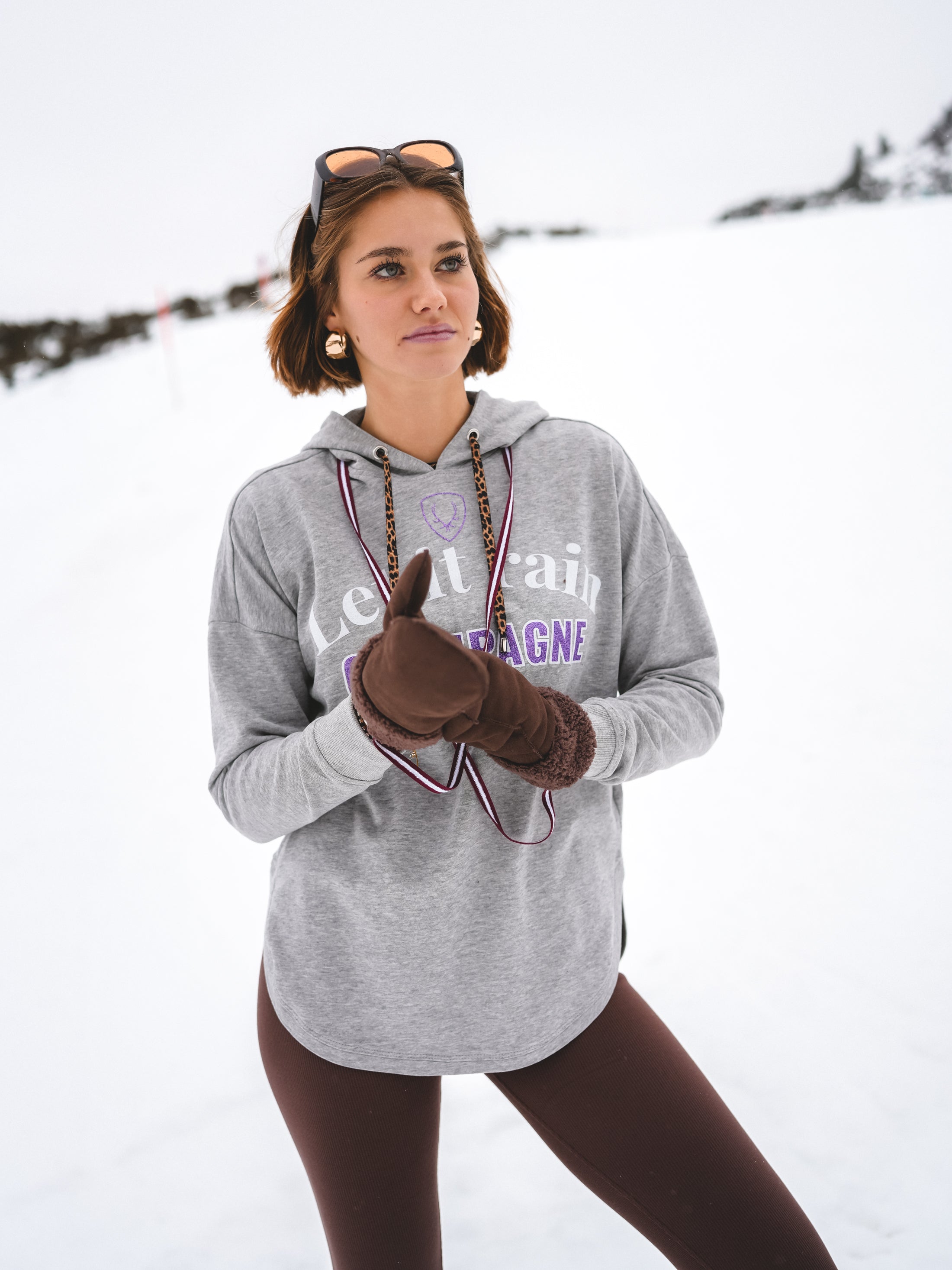 Grau, lässig, aber mit Glam – Champagne Crush ist der Hoodie für alle, die ihren Alpine-Lifestyle mit einem Augenzwinkern tragen. Der „Let it rain Champagne“-Statement-Print setzt den Vibe sofort: Après-Ski, Bubbles, Sonnenterrasse – und dieses Gefühl, wenn der Tag nach Lieblingsmomenten schmeckt.