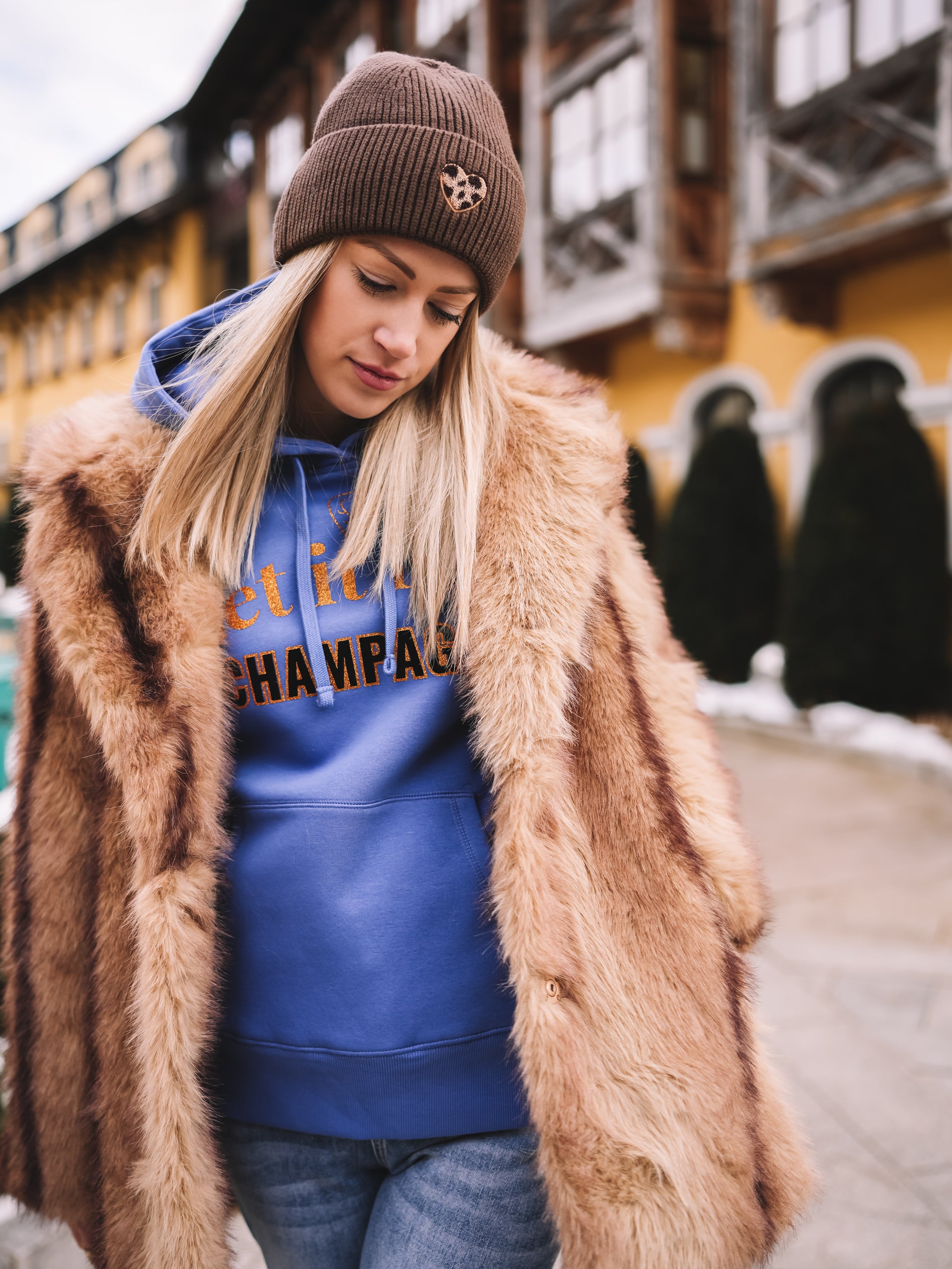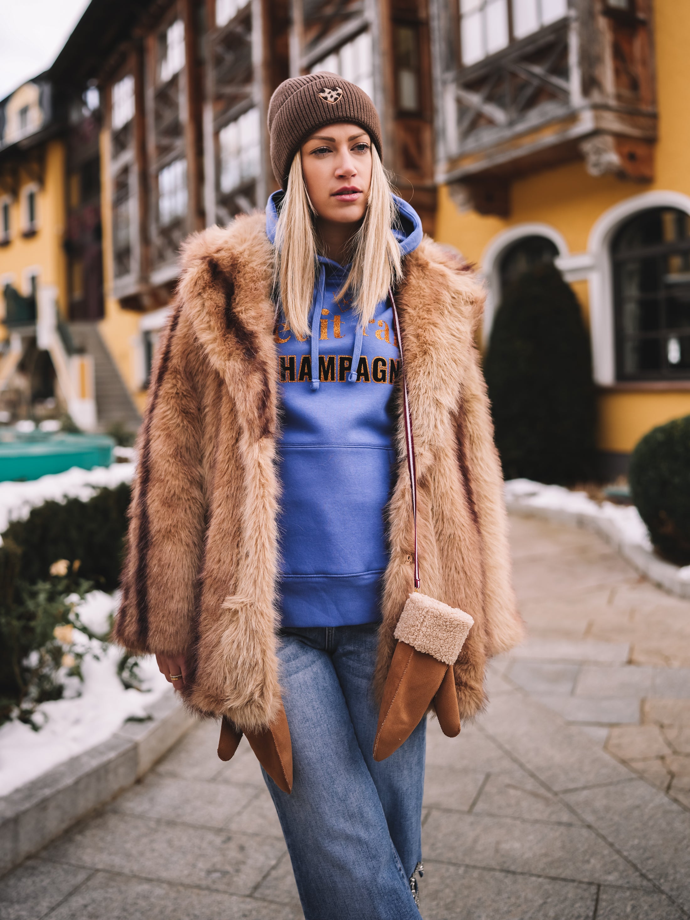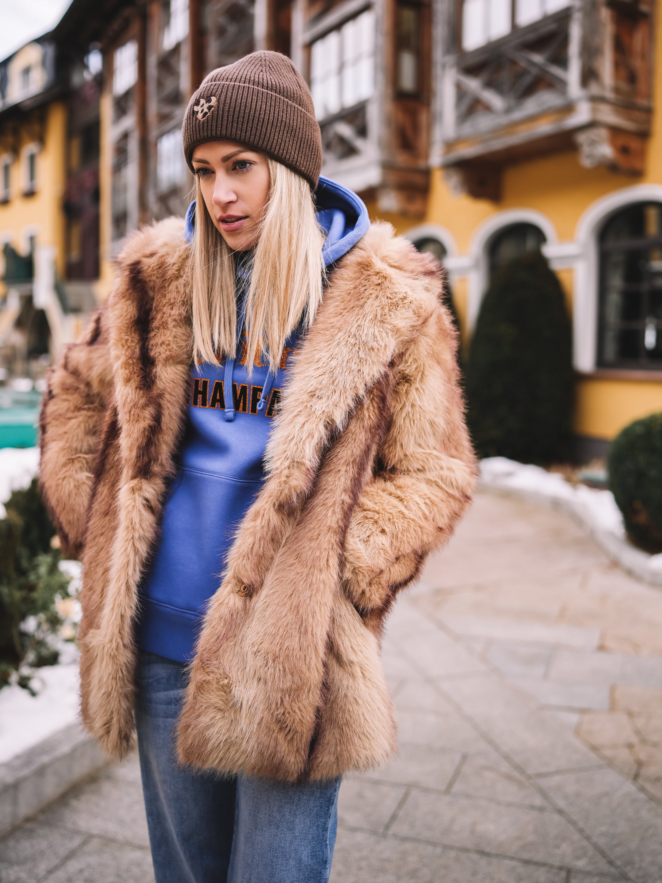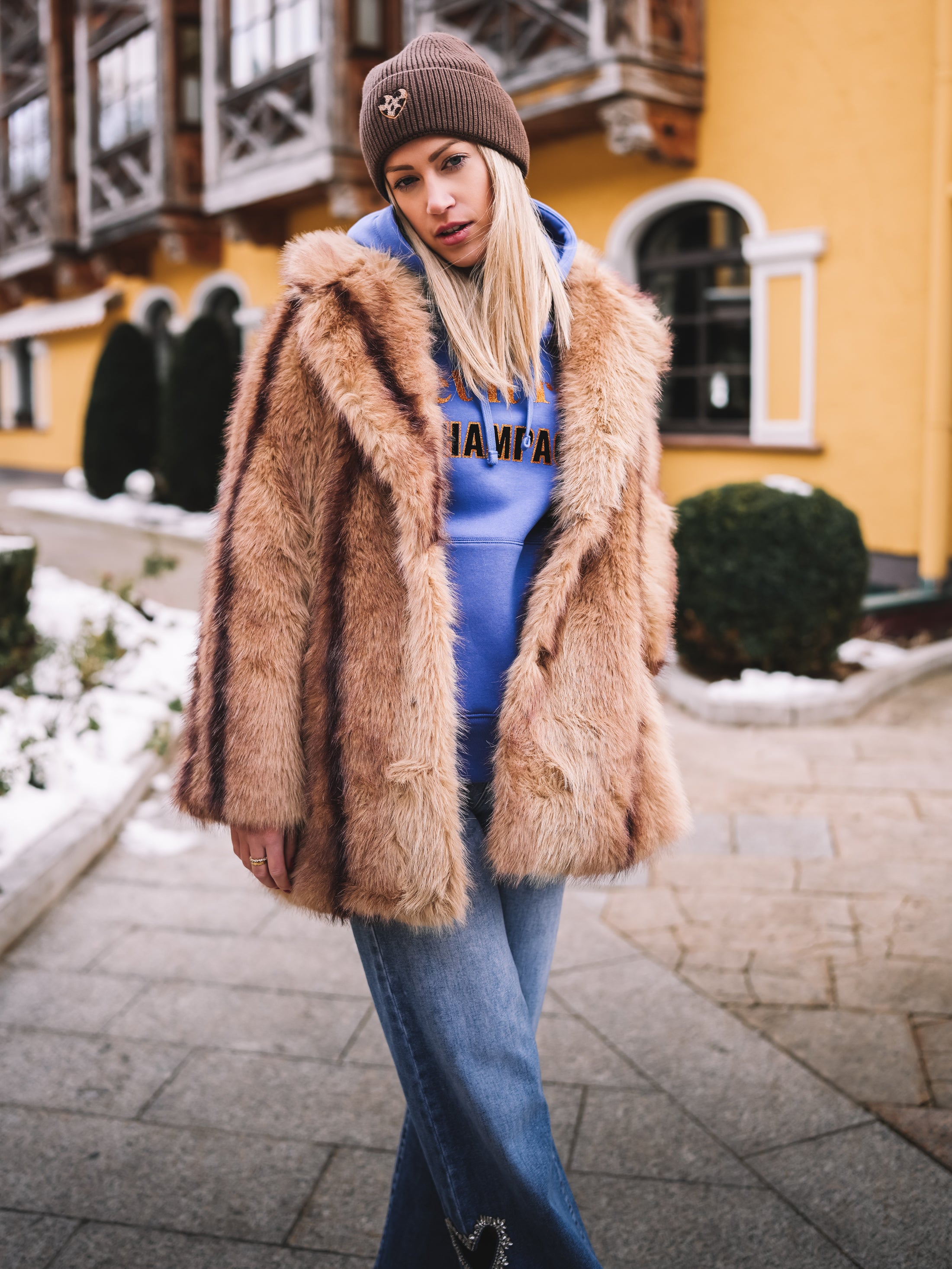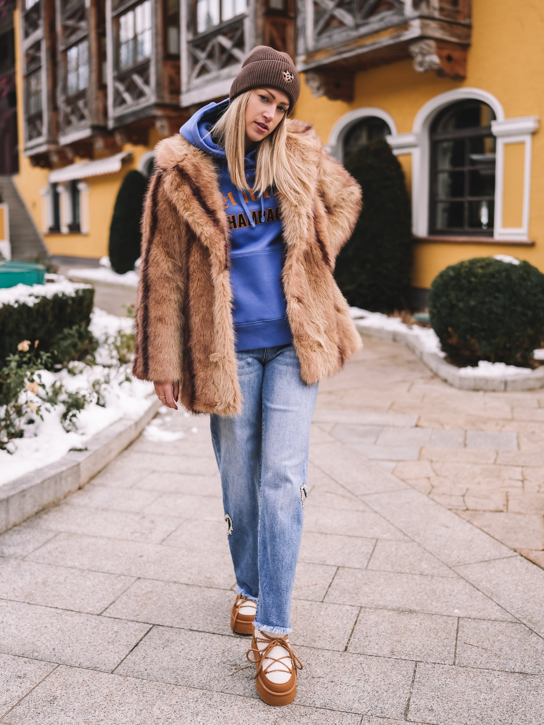 Der weiche Fall, die markanten natürlichen Farbnuancen und die luxuriöse Haptik machen ihn zu einem Statement-Piece, das sowohl im Alltag als auch bei besonderen Momenten strahlt. Ob beim Spaziergang durchs Winterdorf oder beim Dinner im Chalet – dieser Mantel begleitet dich mit stilvoller Präsenz und einem unverwechselbaren Touch Wildheit.