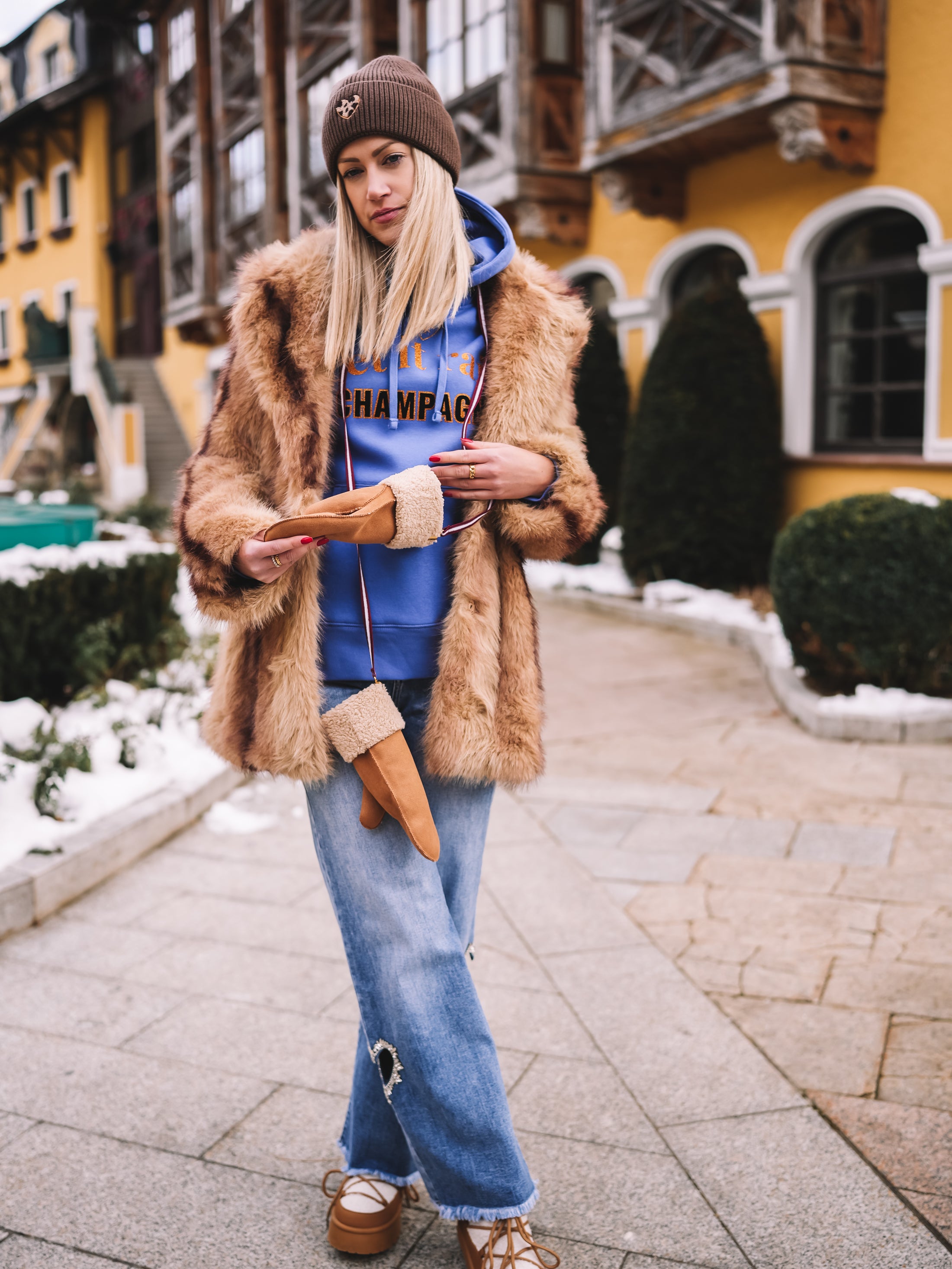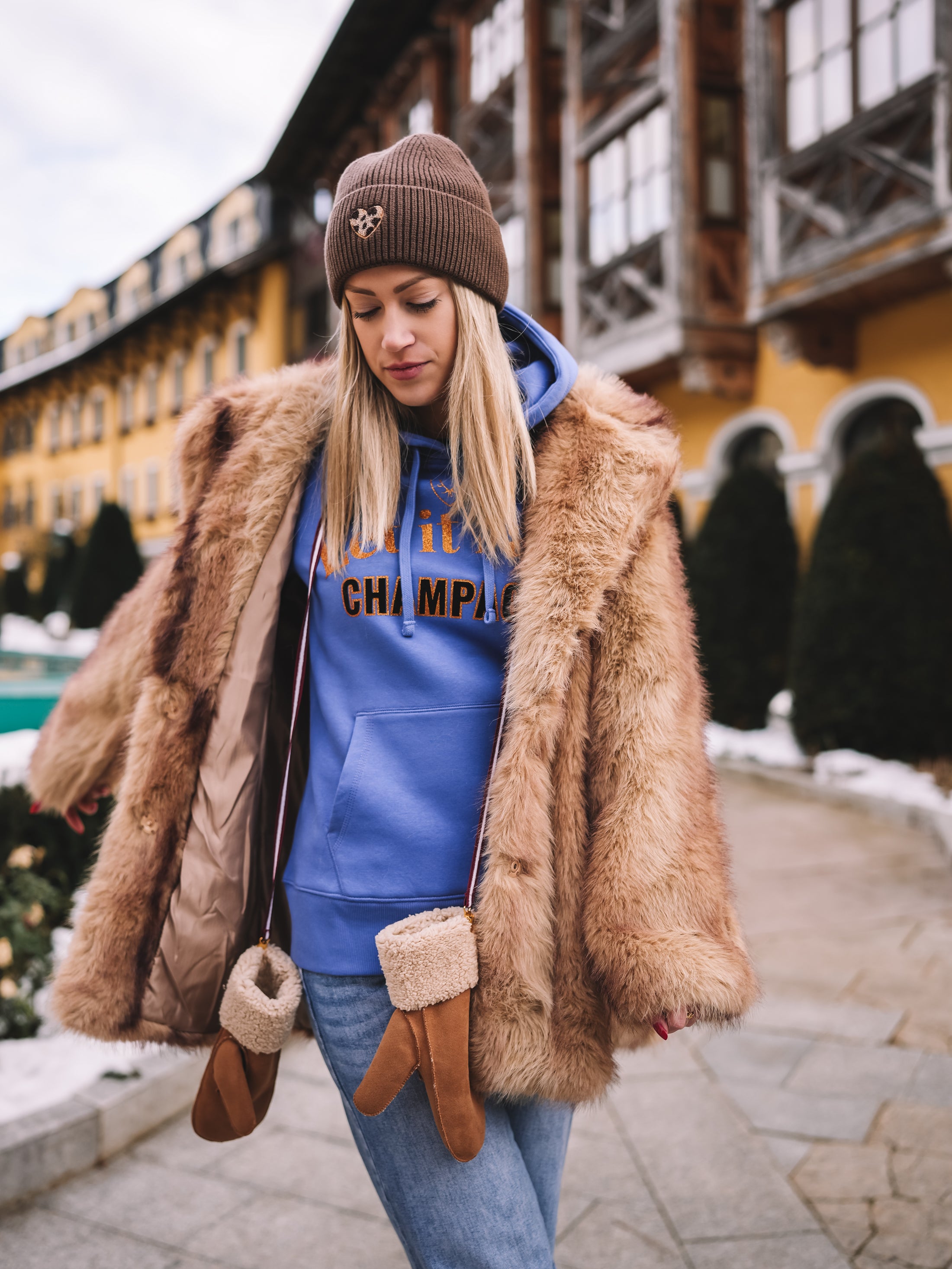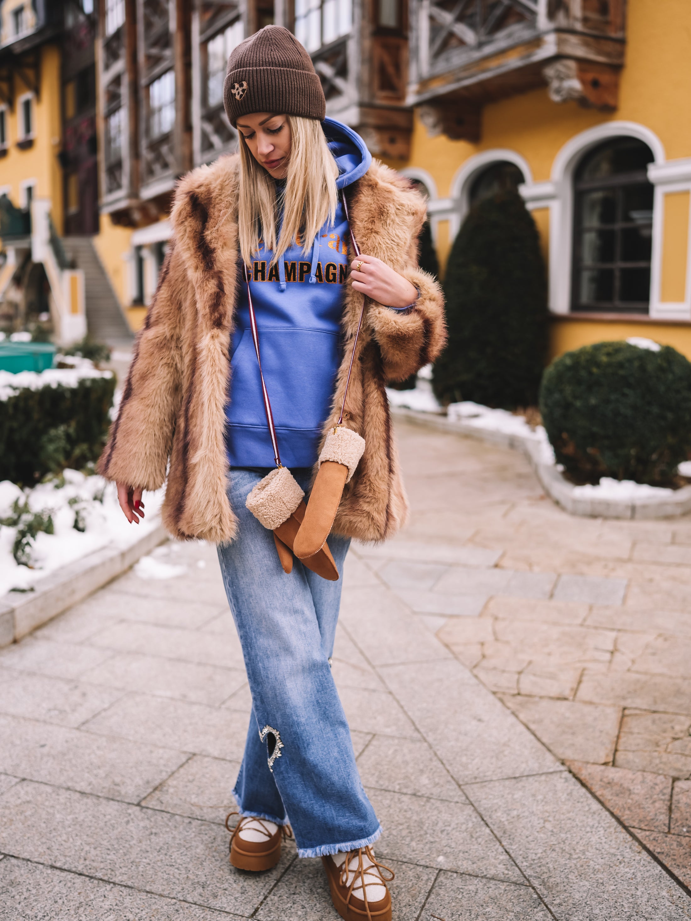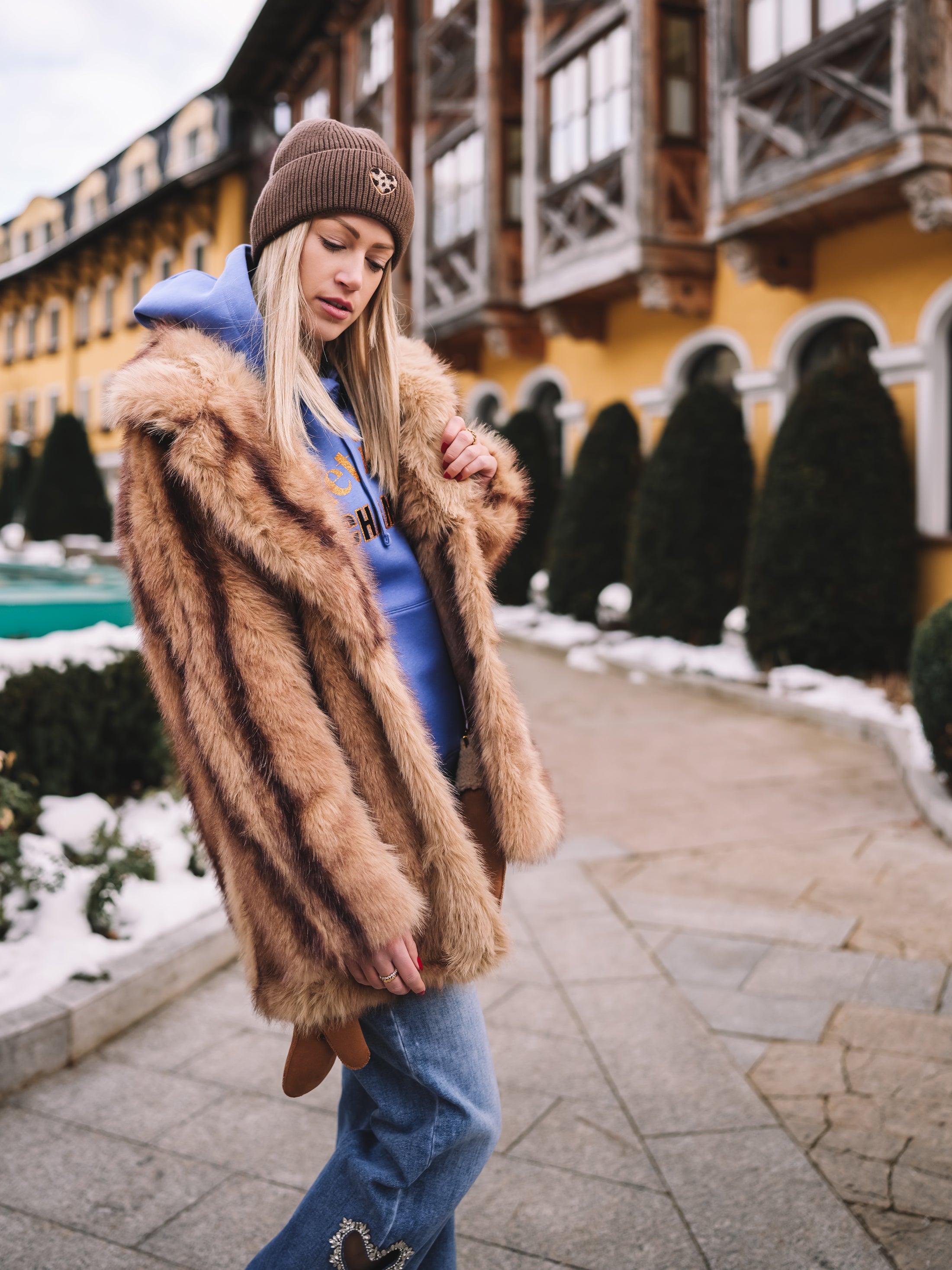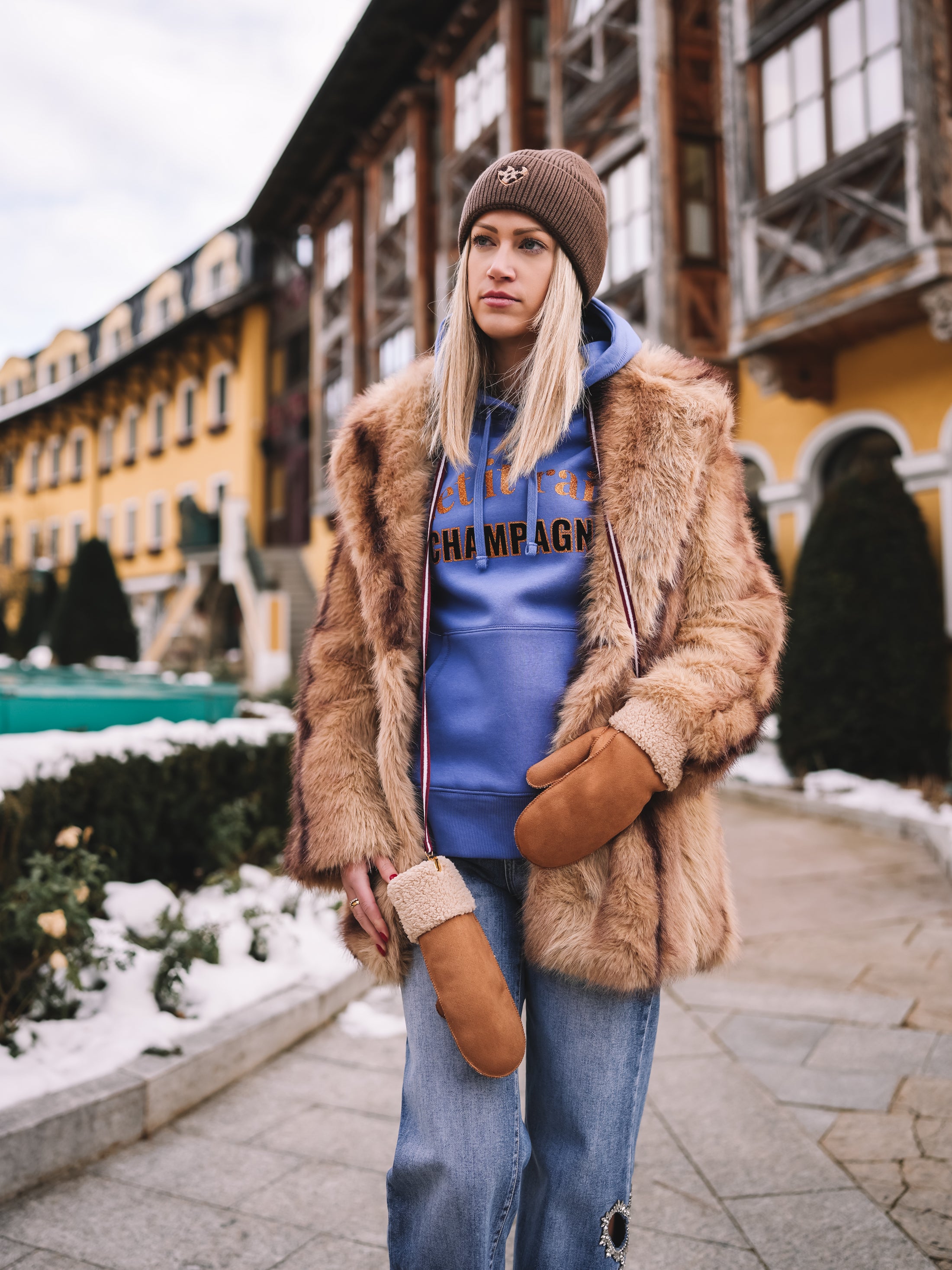 Der weiche Fall, die markanten natürlichen Farbnuancen und die luxuriöse Haptik machen ihn zu einem Statement-Piece, das sowohl im Alltag als auch bei besonderen Momenten strahlt. Ob beim Spaziergang durchs Winterdorf oder beim Dinner im Chalet – dieser Mantel begleitet dich mit stilvoller Präsenz und einem unverwechselbaren Touch Wildheit.