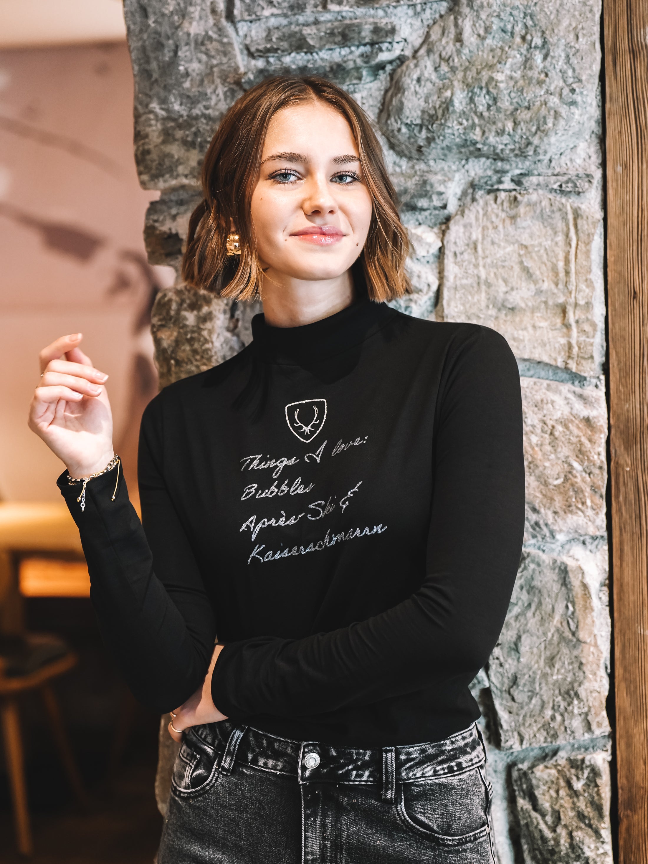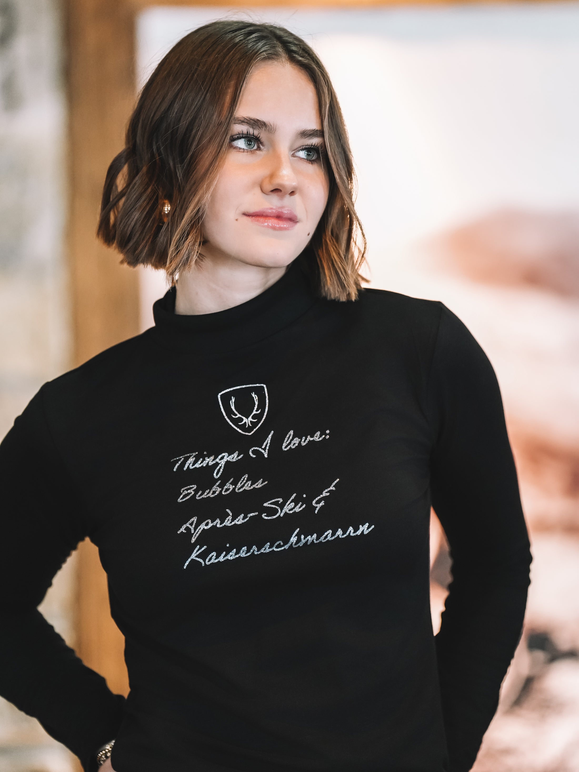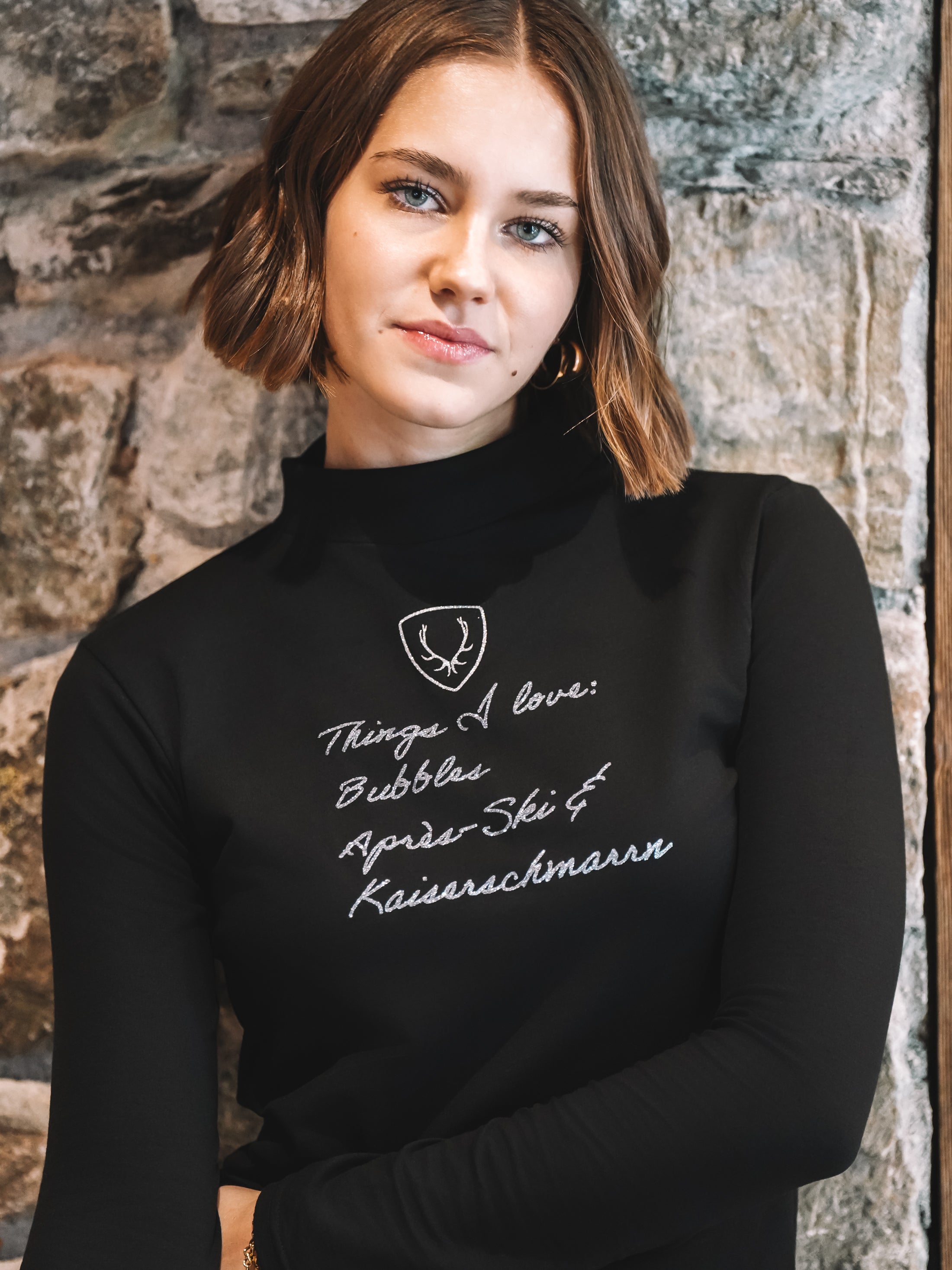 Der Schnitt sitzt schön feminin und lässt sich easy kombinieren – zu Jeans, Rock oder unter Jacken und Westen als stilvolle Basis. Ob unterwegs, beim Kaffee auf der Terrasse oder beim Après-Moment: Alpine Love List ist dieses Piece, das immer passt – und dabei trotzdem auffällt.