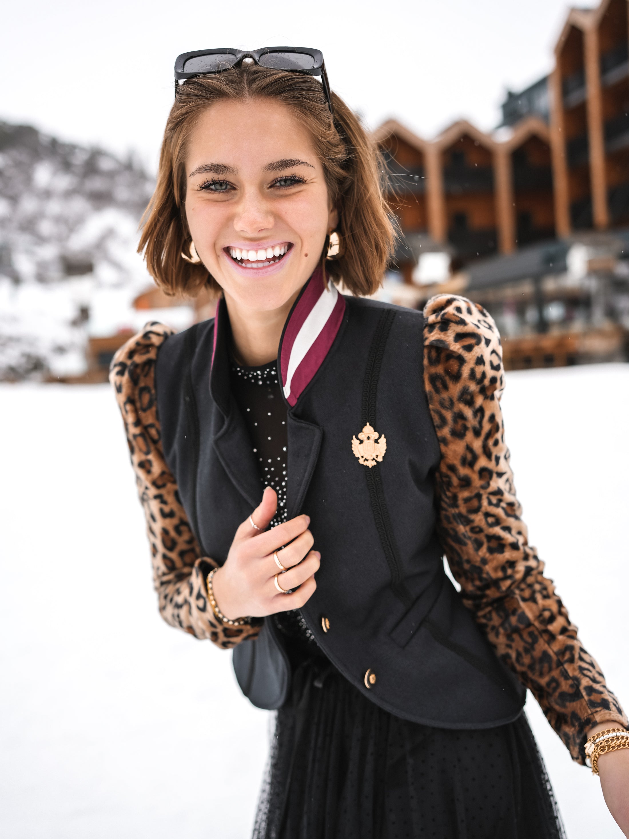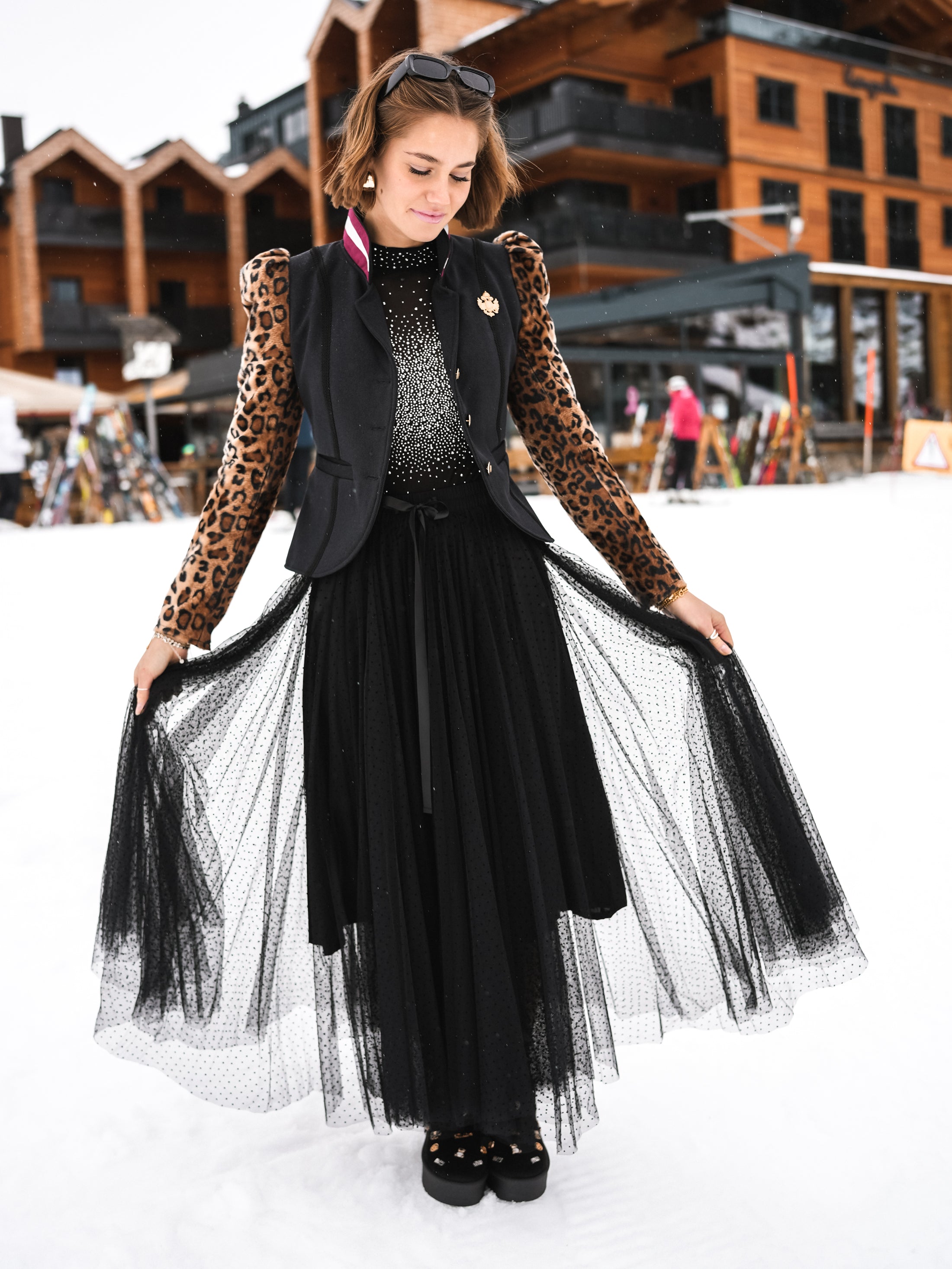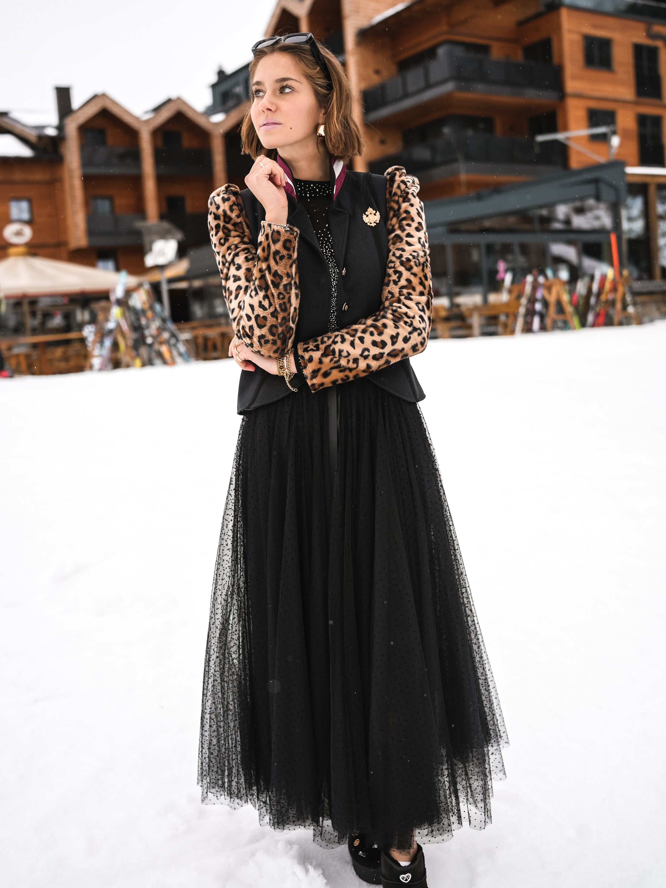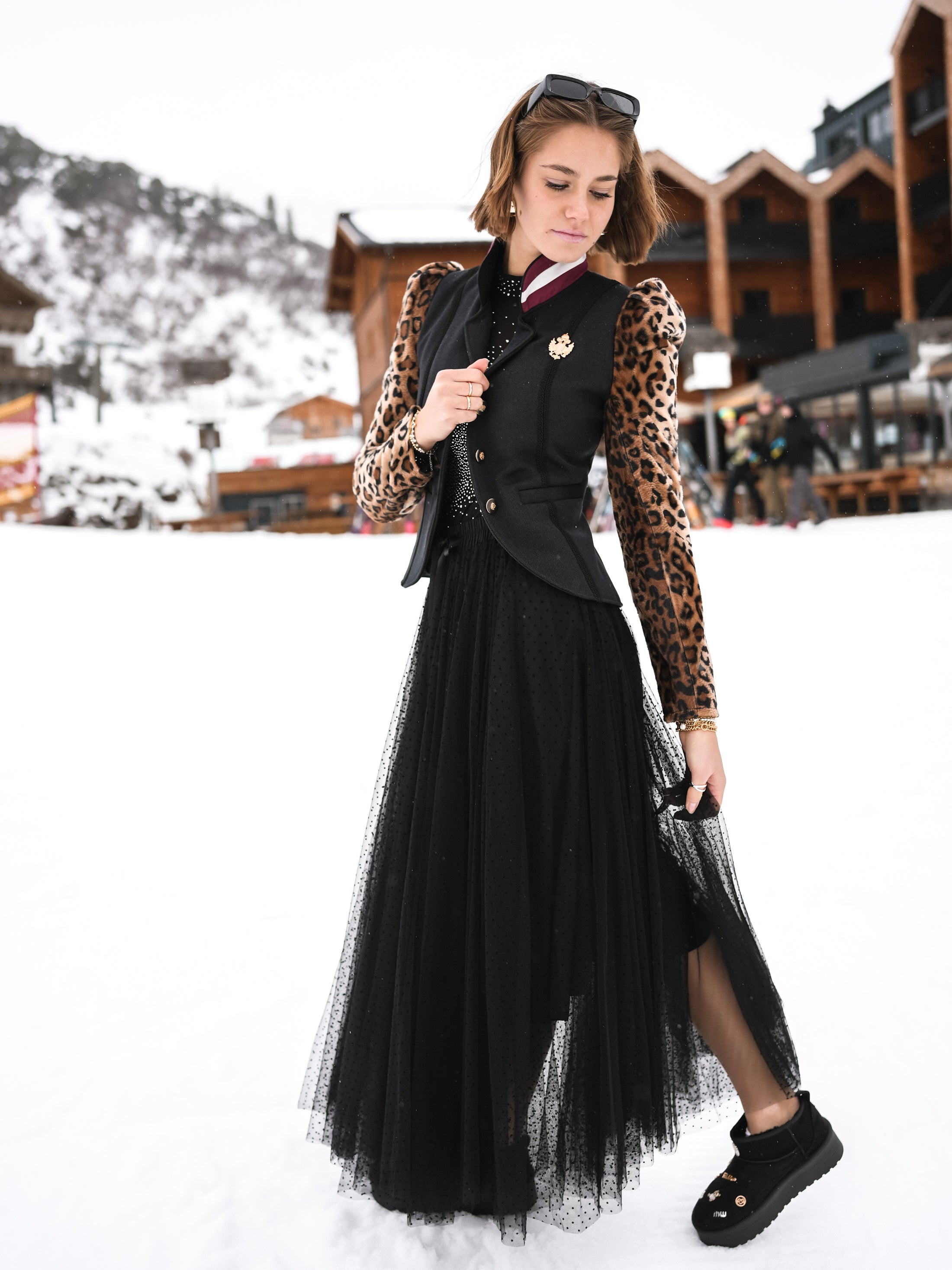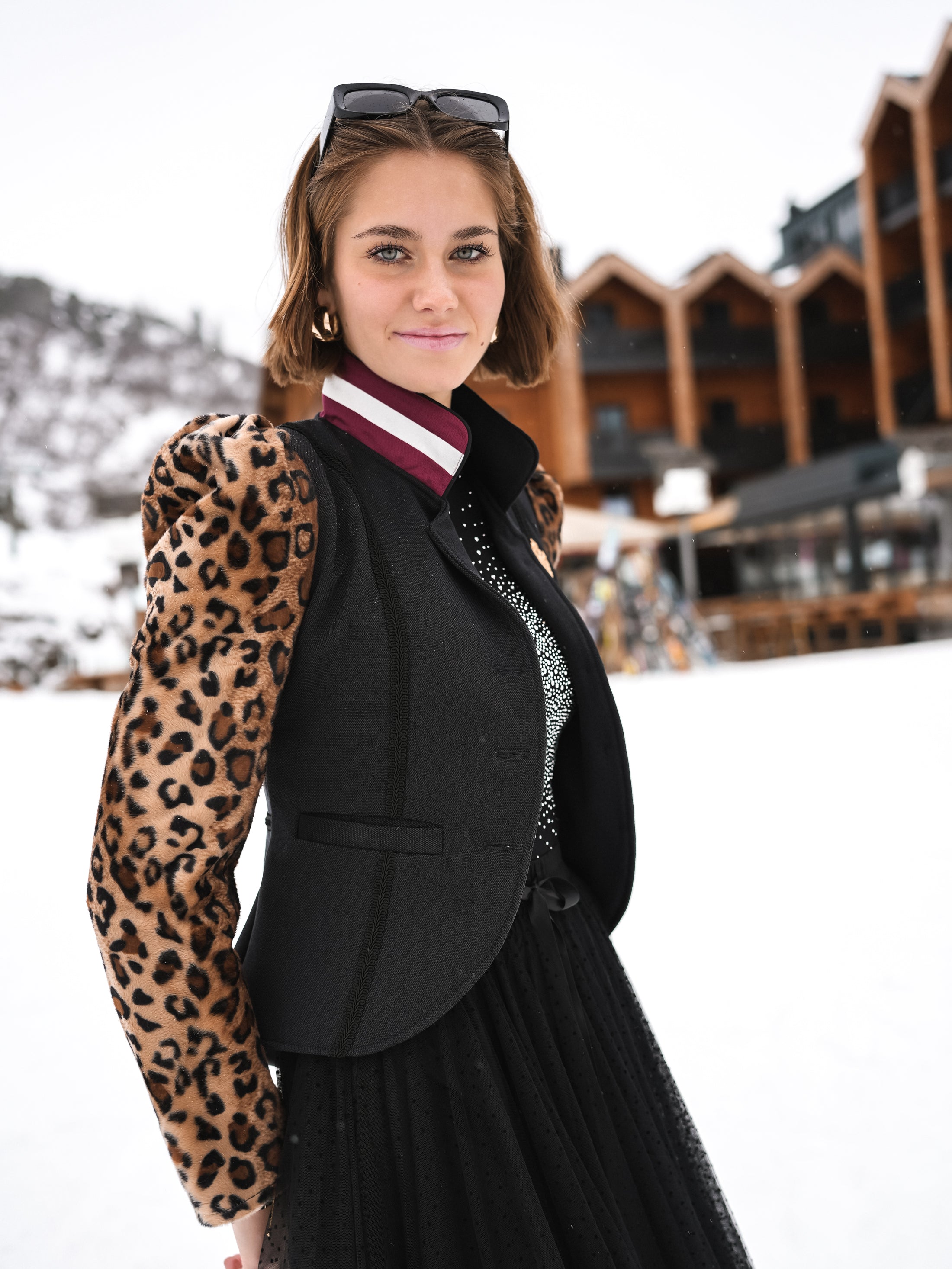 Erfahre pure Eleganz mit unserem Blazer "Leopard Crowned Elegance" – ein einzigartiges Meisterwerk. Dieser Blazer setzt neue Maßstäbe mit einem wahrhaft königlichen Design. Die besonderen Puffärmel mit Leoparden-Druck, der Kragen in Rot-Weiß-Rot, die feinen Zierbänder, Leistentaschen, echte Rehroserl am Revers, eine edle Adler Applikation aus Metall und ein funkelndes Hirschgeweih aus Strasssteinen machen diesen Blazer zu einem außergewöhnlichen Highlight.
