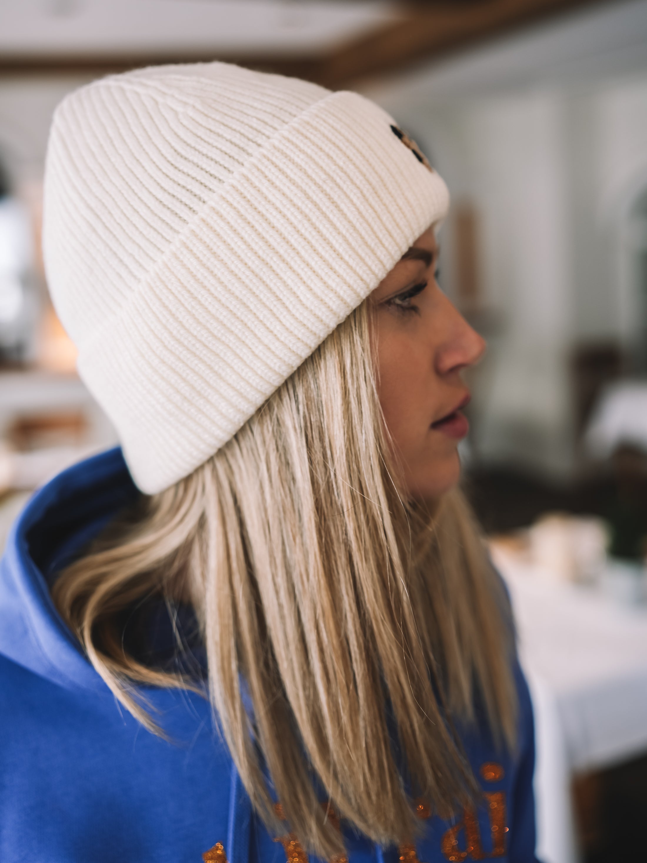 Die Mütze Alpine Lovelight bringt dieses zarte Funkeln in deinen Winterlook, das sofort Wärme und Stil ausstrahlt. Das weiche Ecru trifft auf ein kleines Leo-Herz, das wie ein charmantes Signature-Detail wirkt – feminin, alpin und mit einem Hauch verspielter Eleganz.