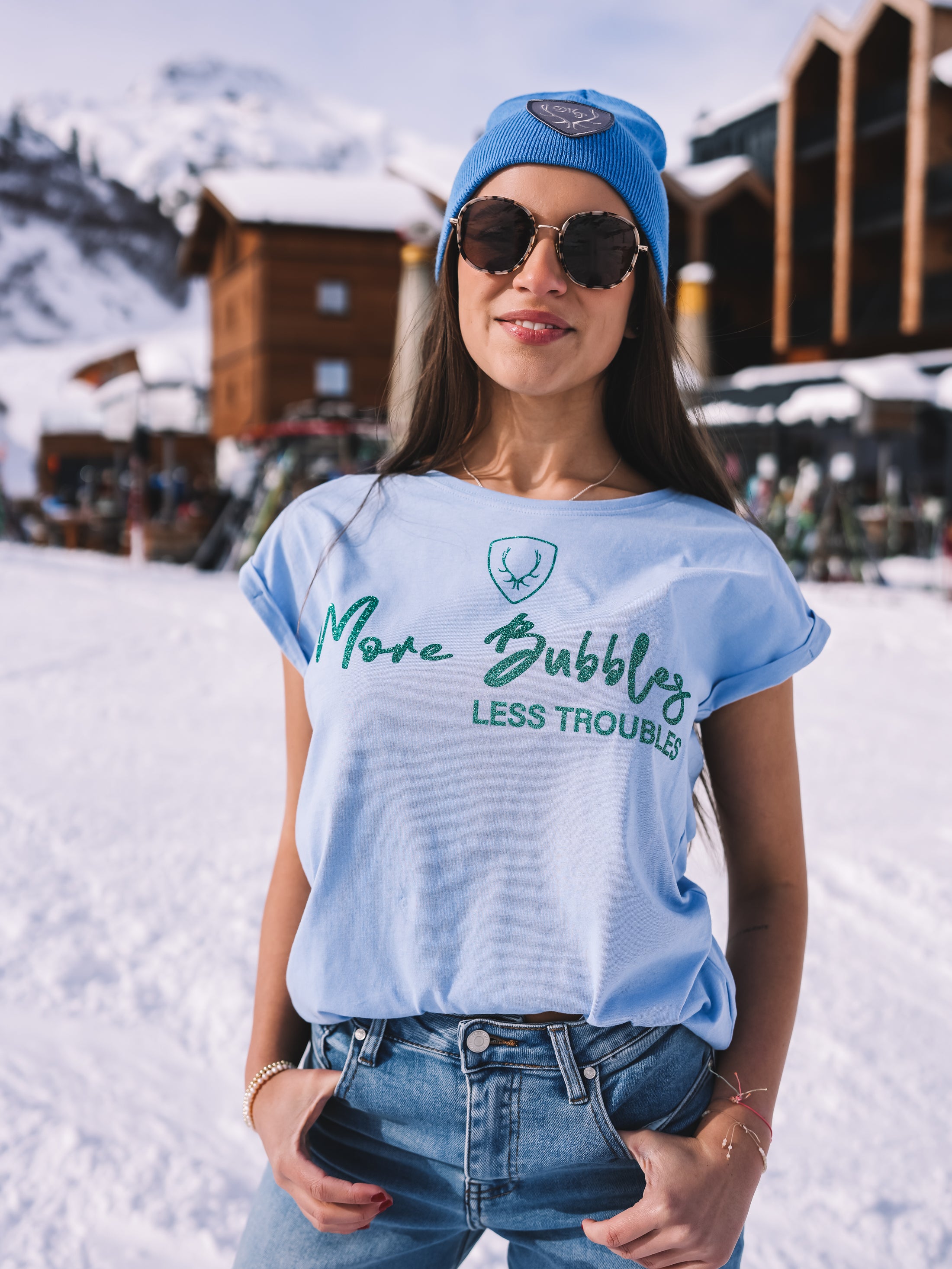Hellblau wie ein klarer Bergmorgen. Und dazu ein glitzernd grüner Print, der im Licht lebendig wird. „Fresh Statement“ steht für Leichtigkeit mit Charakter. Das sanfte Blau bringt Ruhe ins Outfit, während der schimmernde Schriftzug More Bubbles, Less Troubles ein funkelndes Highlight setzt – verspielt, selbstbewusst und mit genau der richtigen Portion Humor.