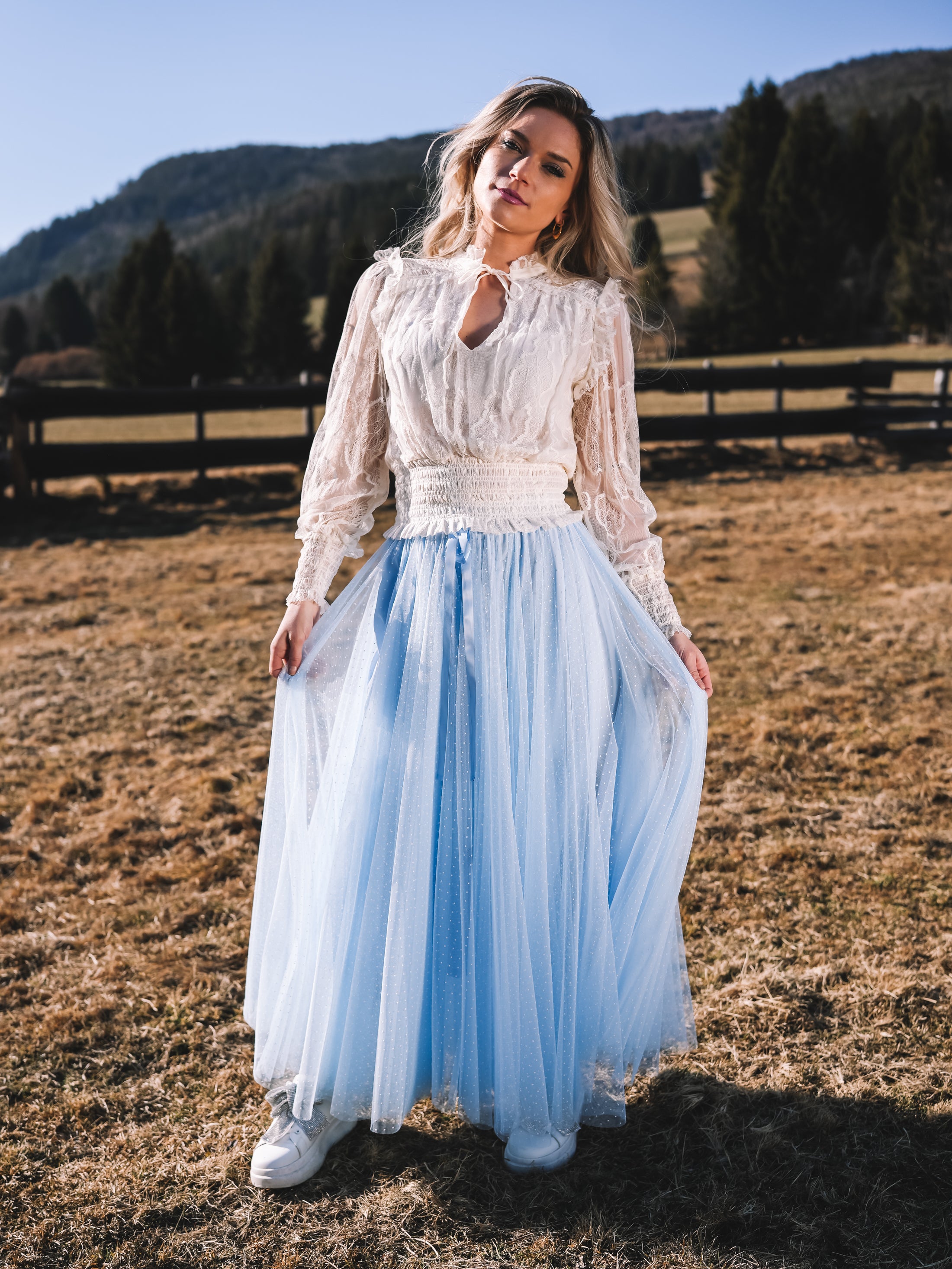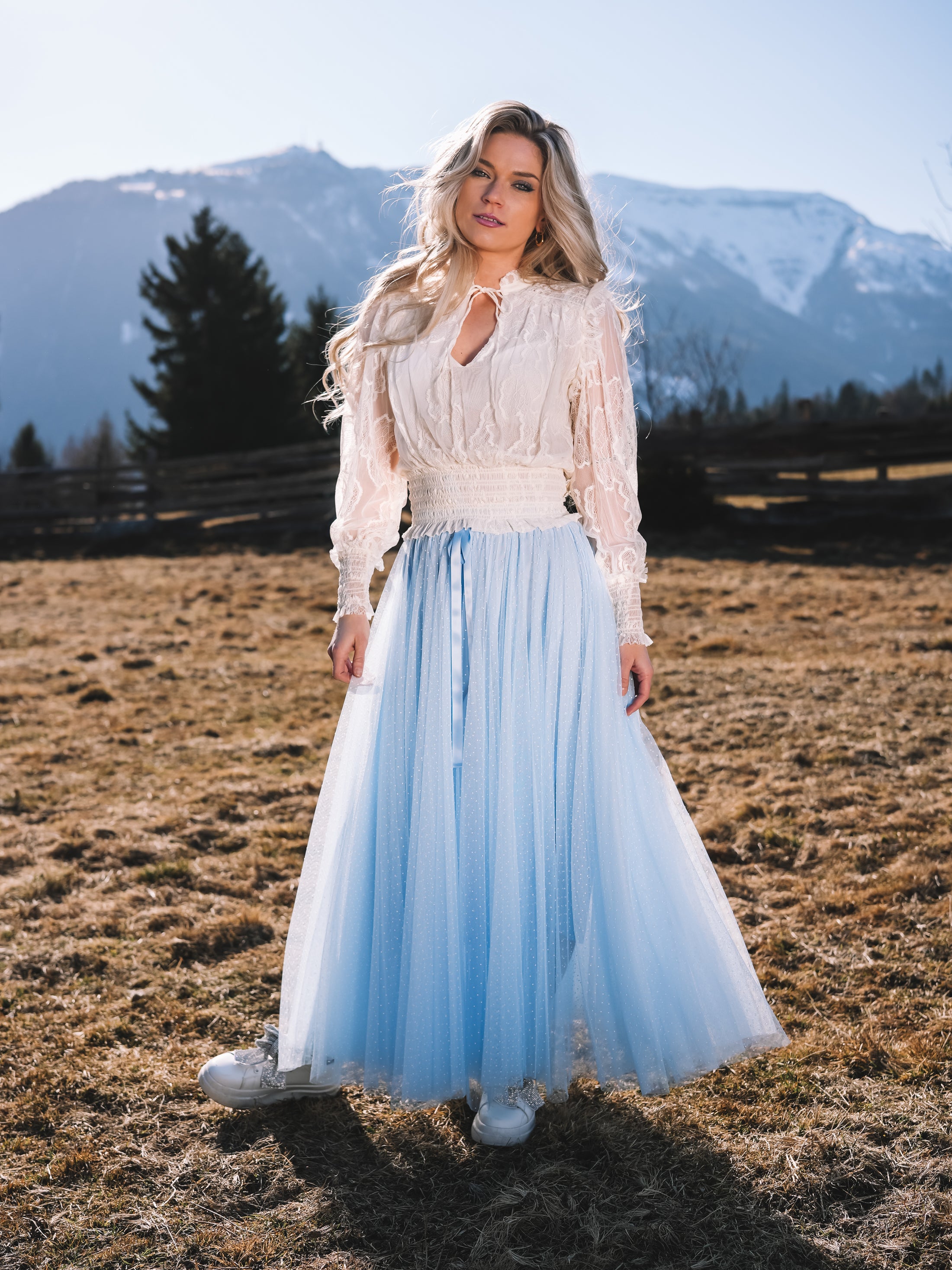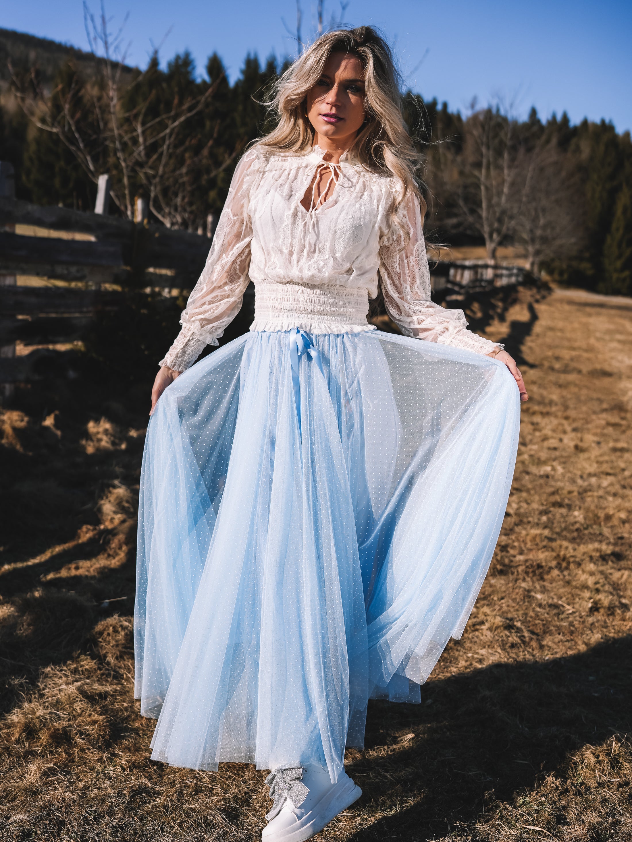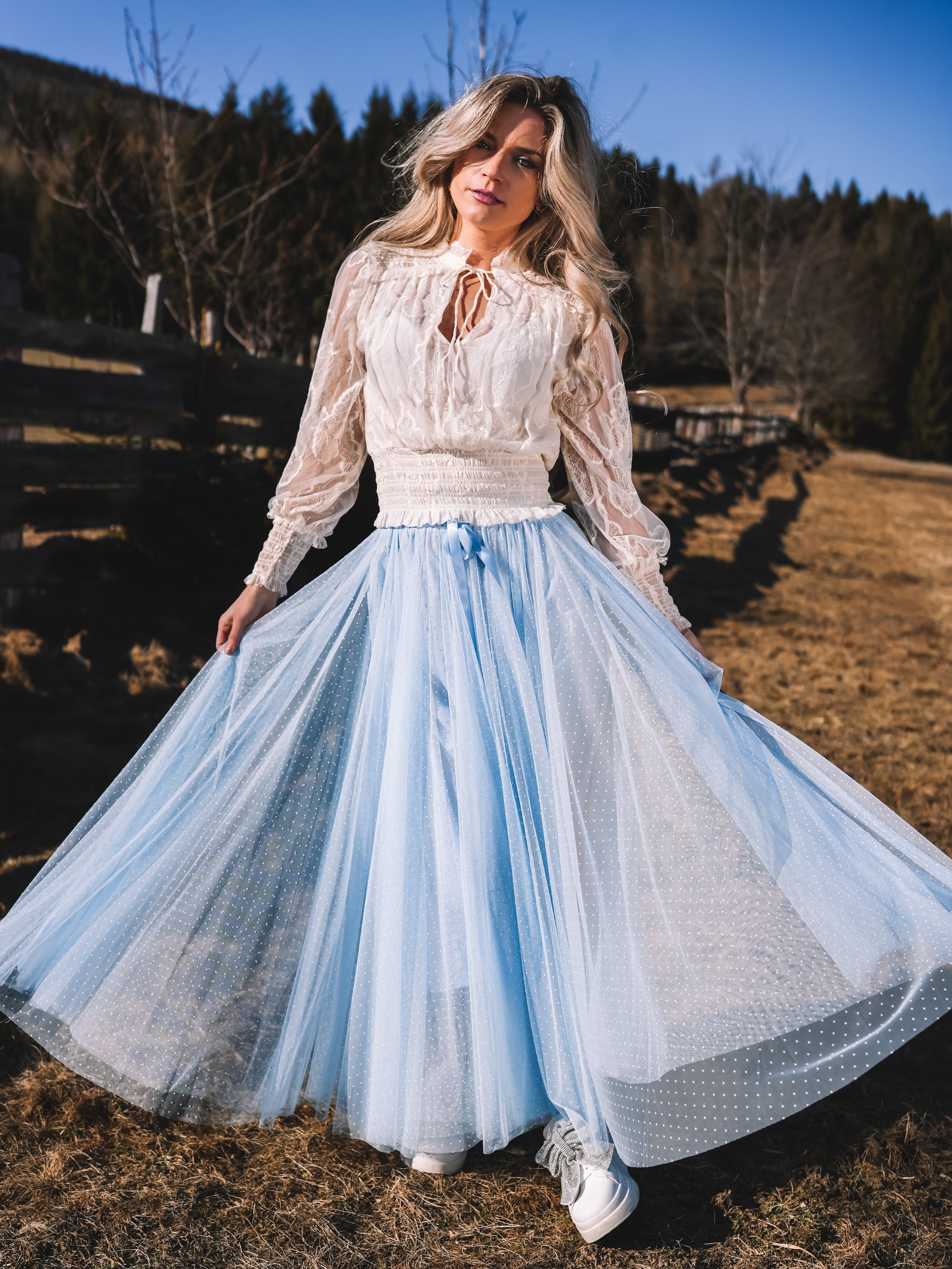 Der Tüllrock „Sky Whisper“ ist ein Hauch von Sommerhimmel zum Anziehen. In einem zarten Hellblau gehalten und mit feinen weißen Pünktchen versehen, strahlt er verspielte Eleganz und feminine Leichtigkeit aus.