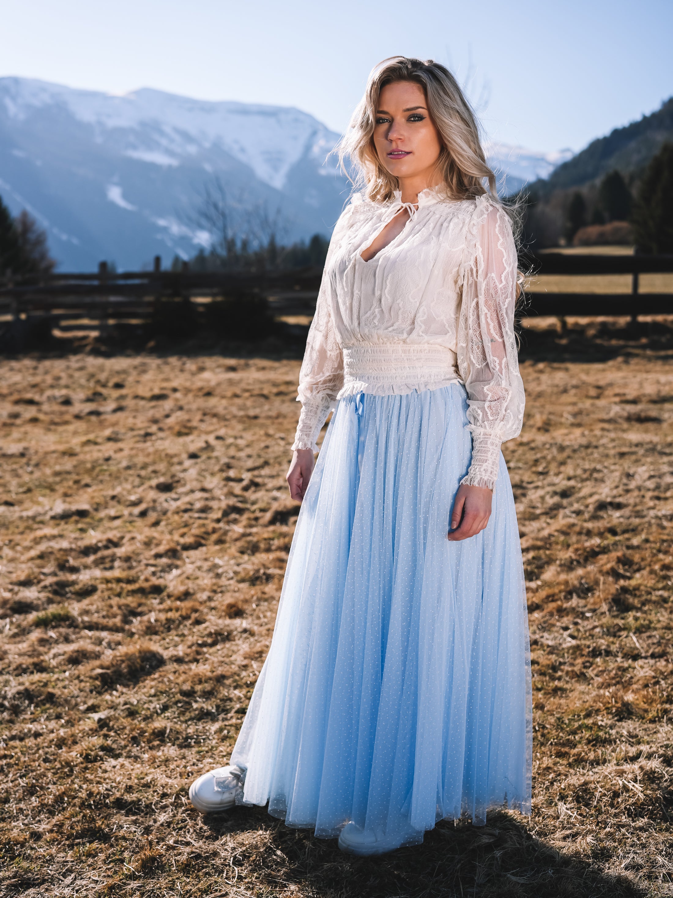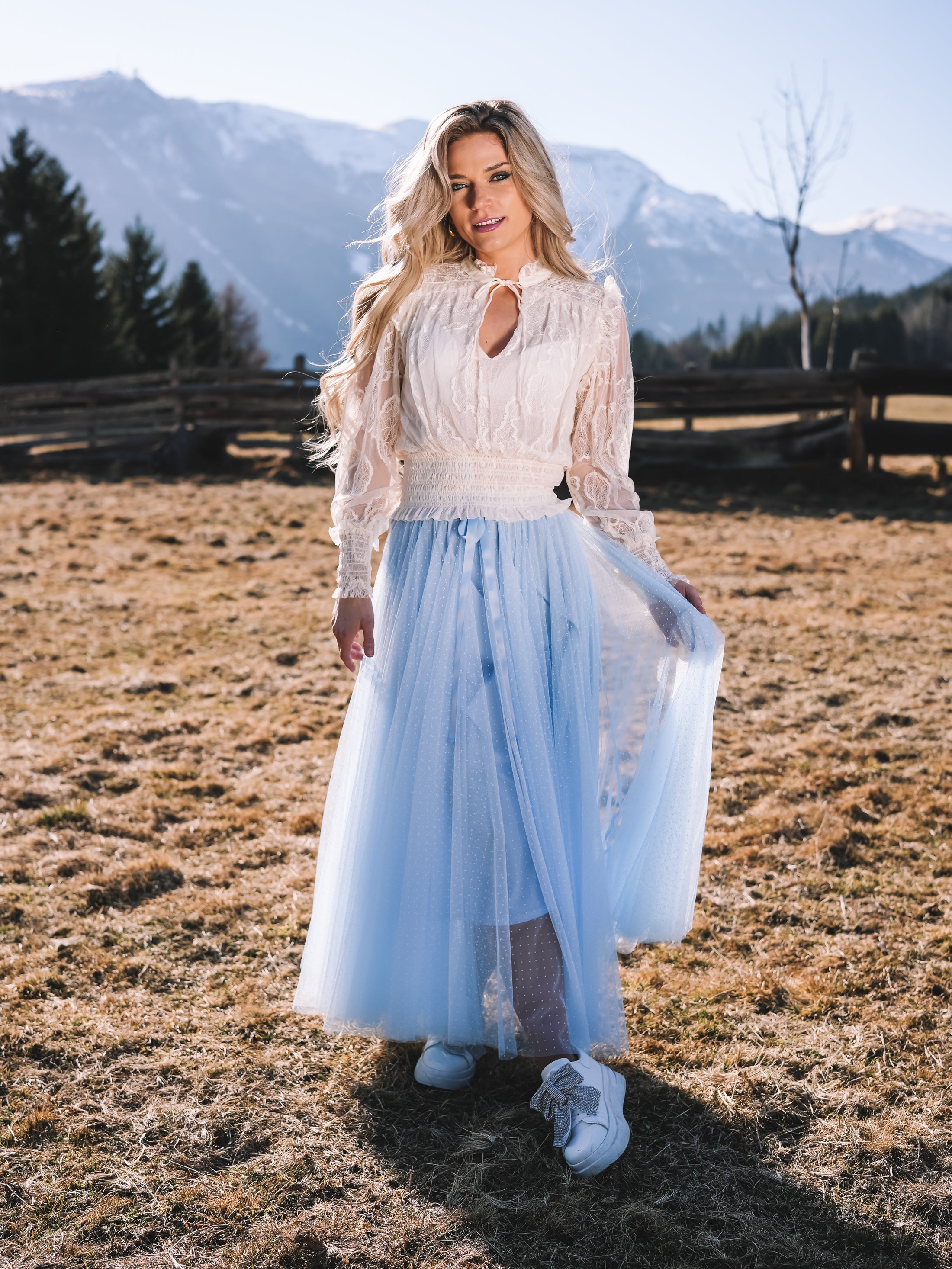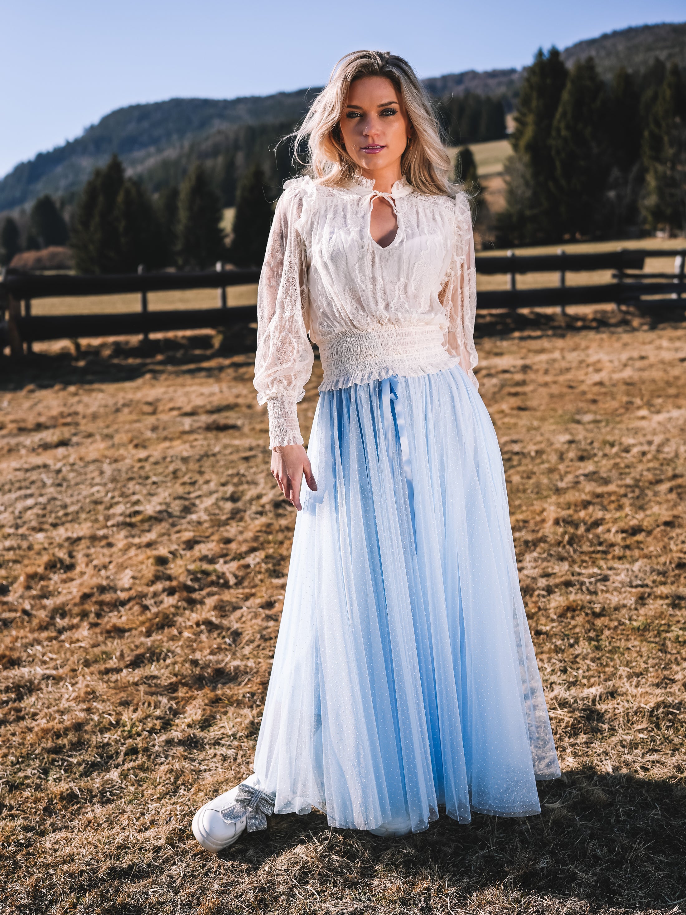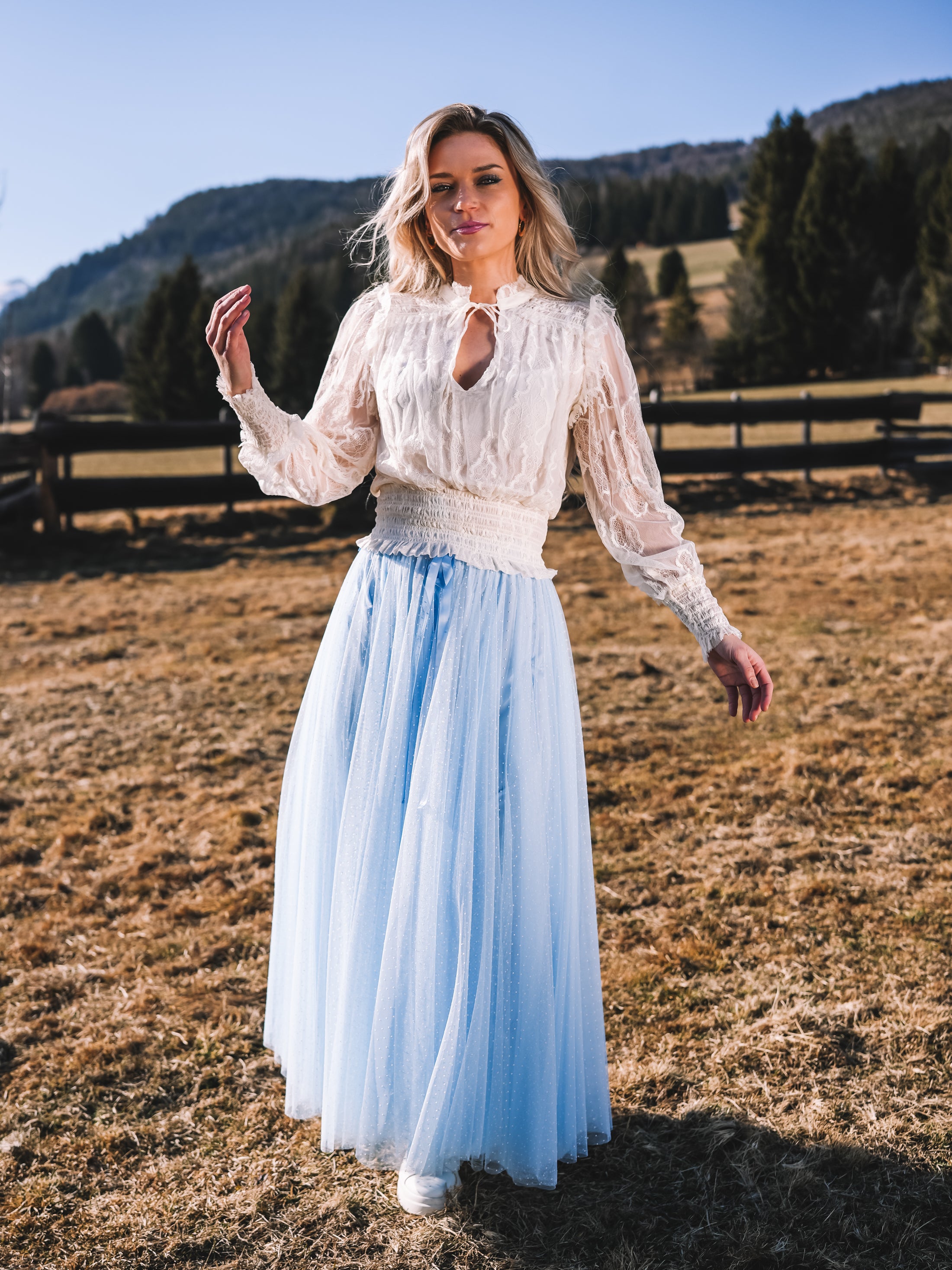 Der Tüllrock „Sky Whisper“ ist ein Hauch von Sommerhimmel zum Anziehen. In einem zarten Hellblau gehalten und mit feinen weißen Pünktchen versehen, strahlt er verspielte Eleganz und feminine Leichtigkeit aus.