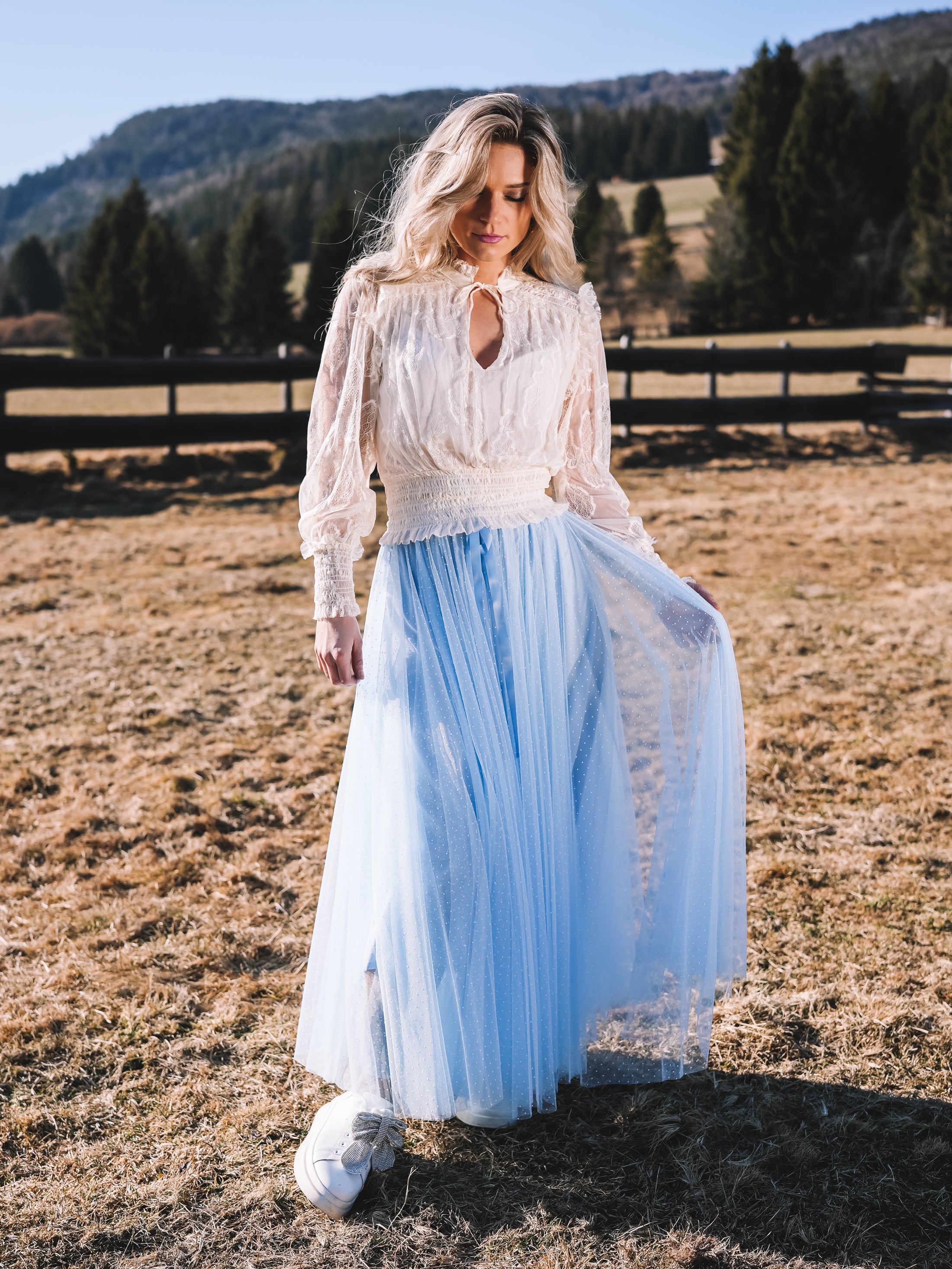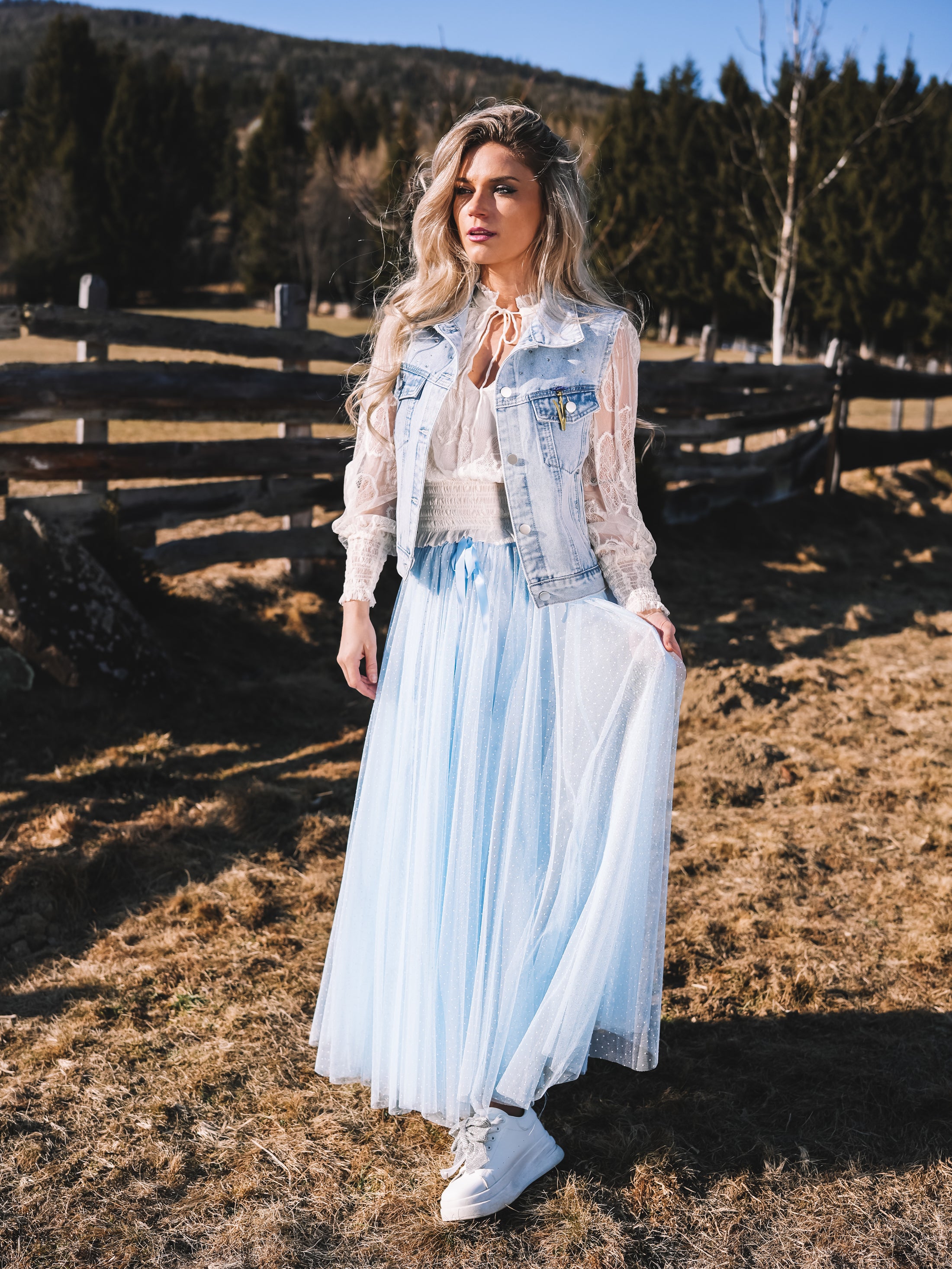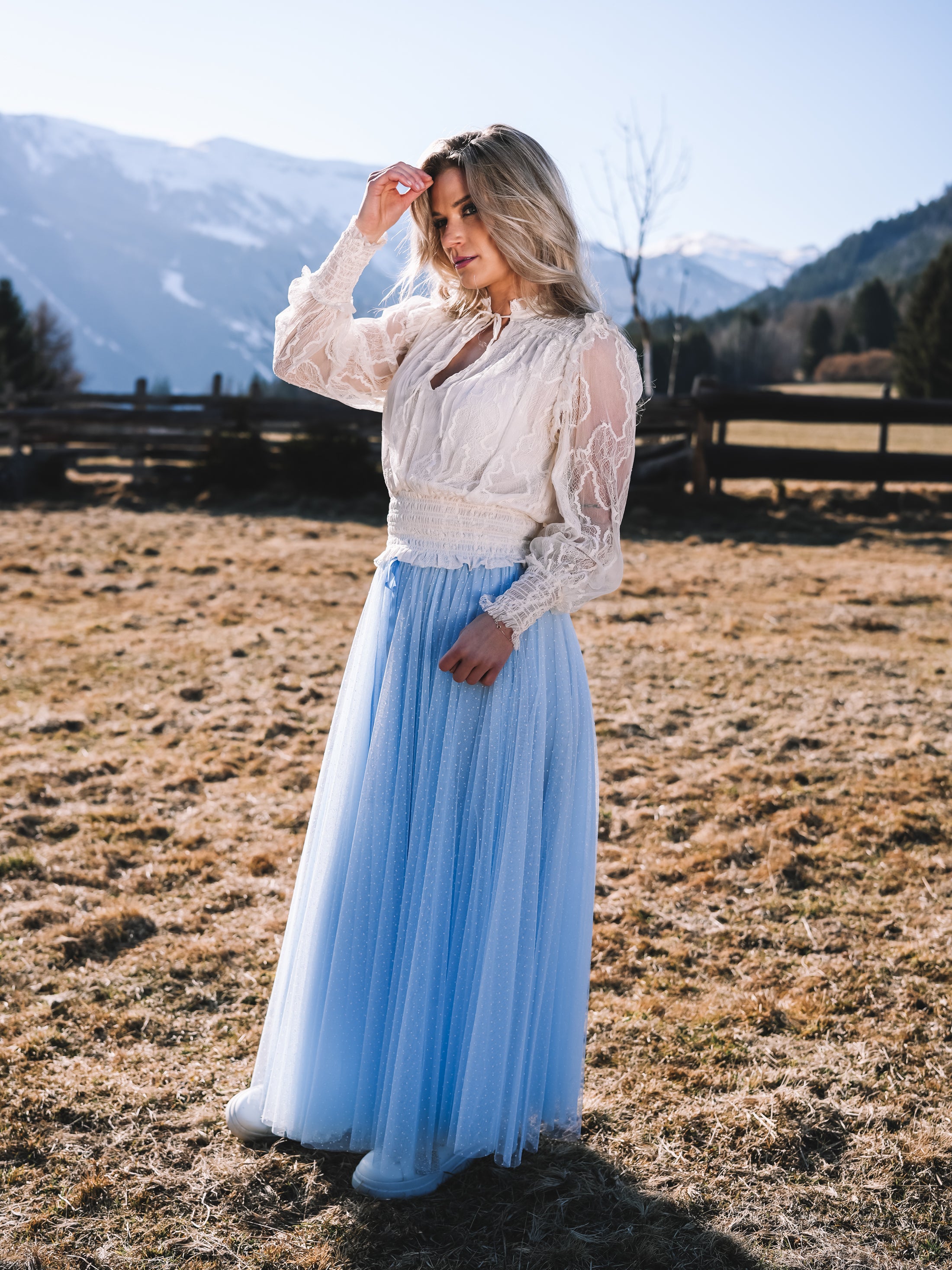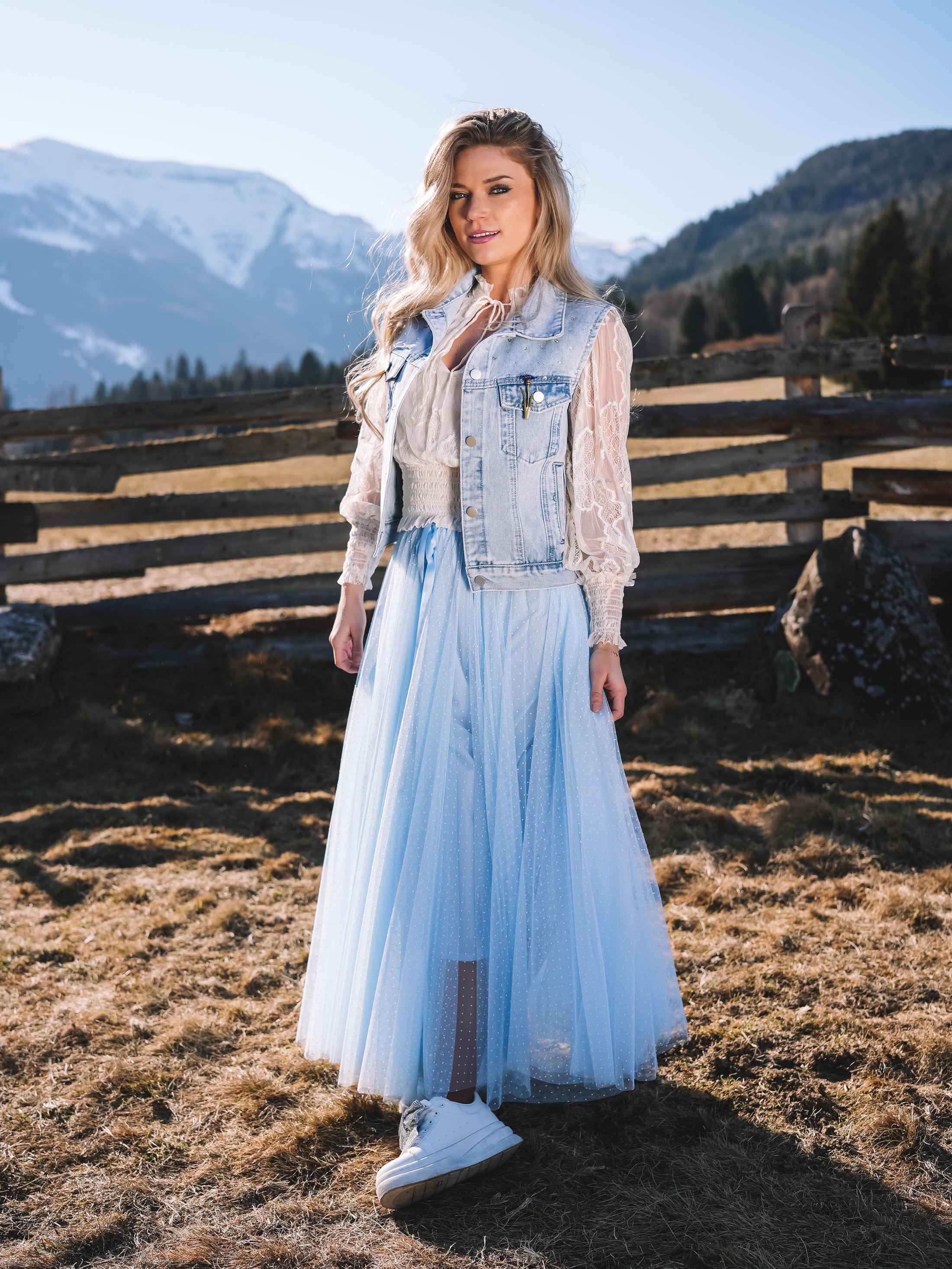 Der Tüllrock „Sky Whisper“ ist ein Hauch von Sommerhimmel zum Anziehen. In einem zarten Hellblau gehalten und mit feinen weißen Pünktchen versehen, strahlt er verspielte Eleganz und feminine Leichtigkeit aus.